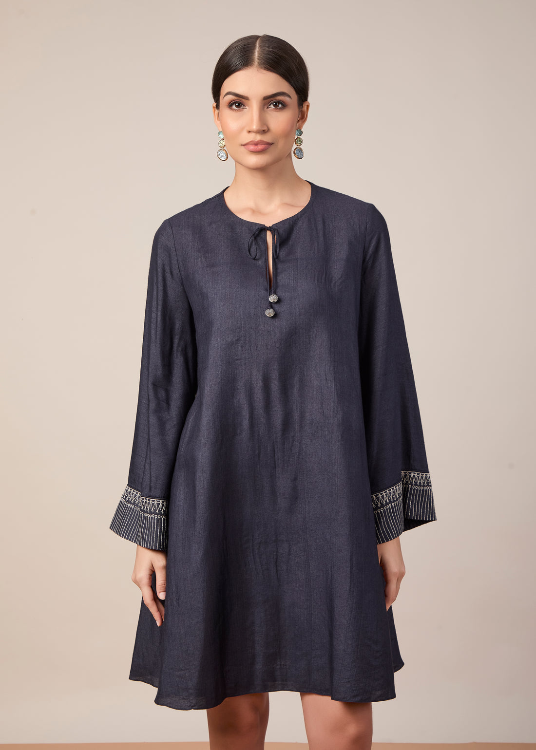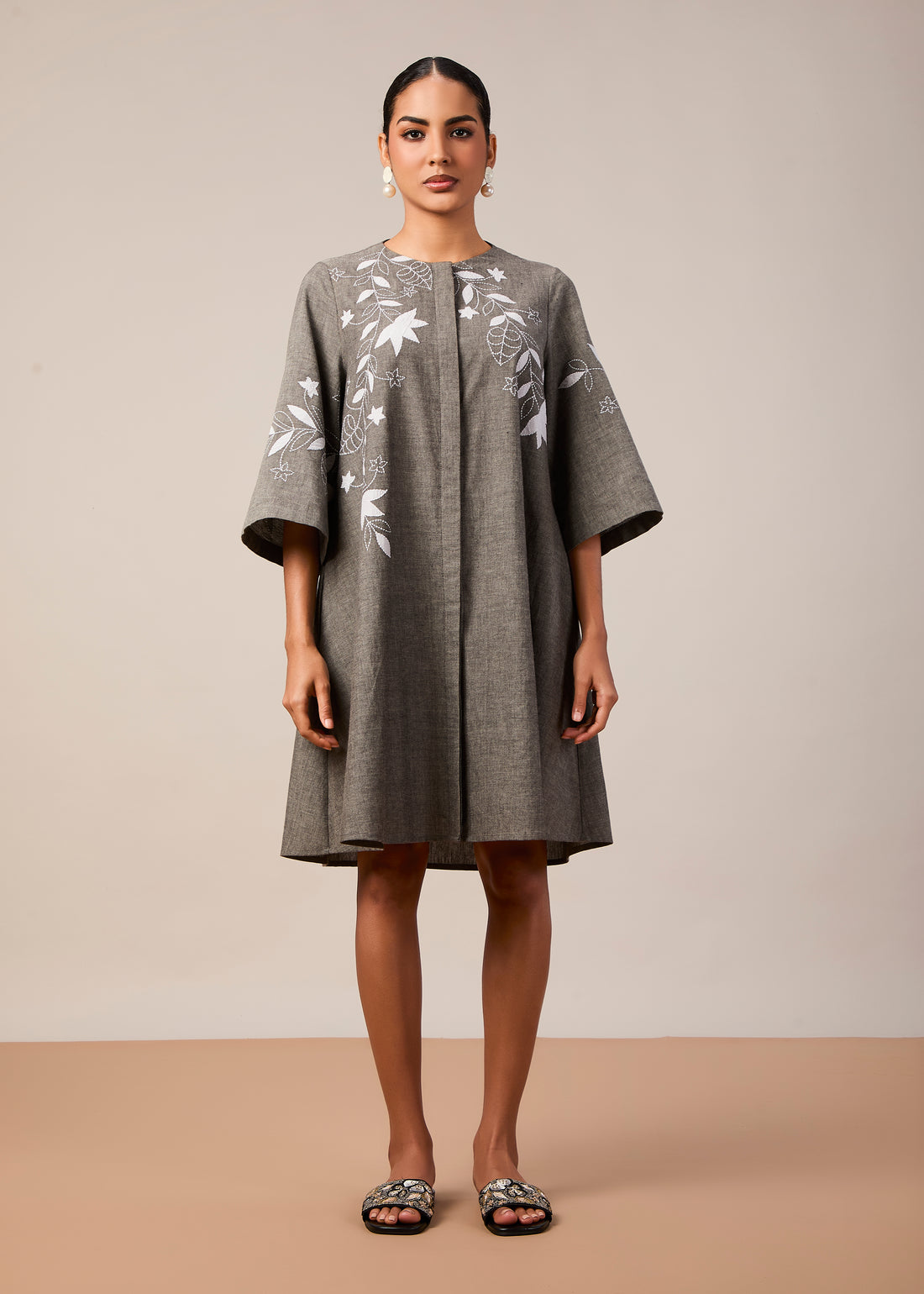 A-line dress with side pockets. White applique embroidery on grey. Made in handloom cotton, this...