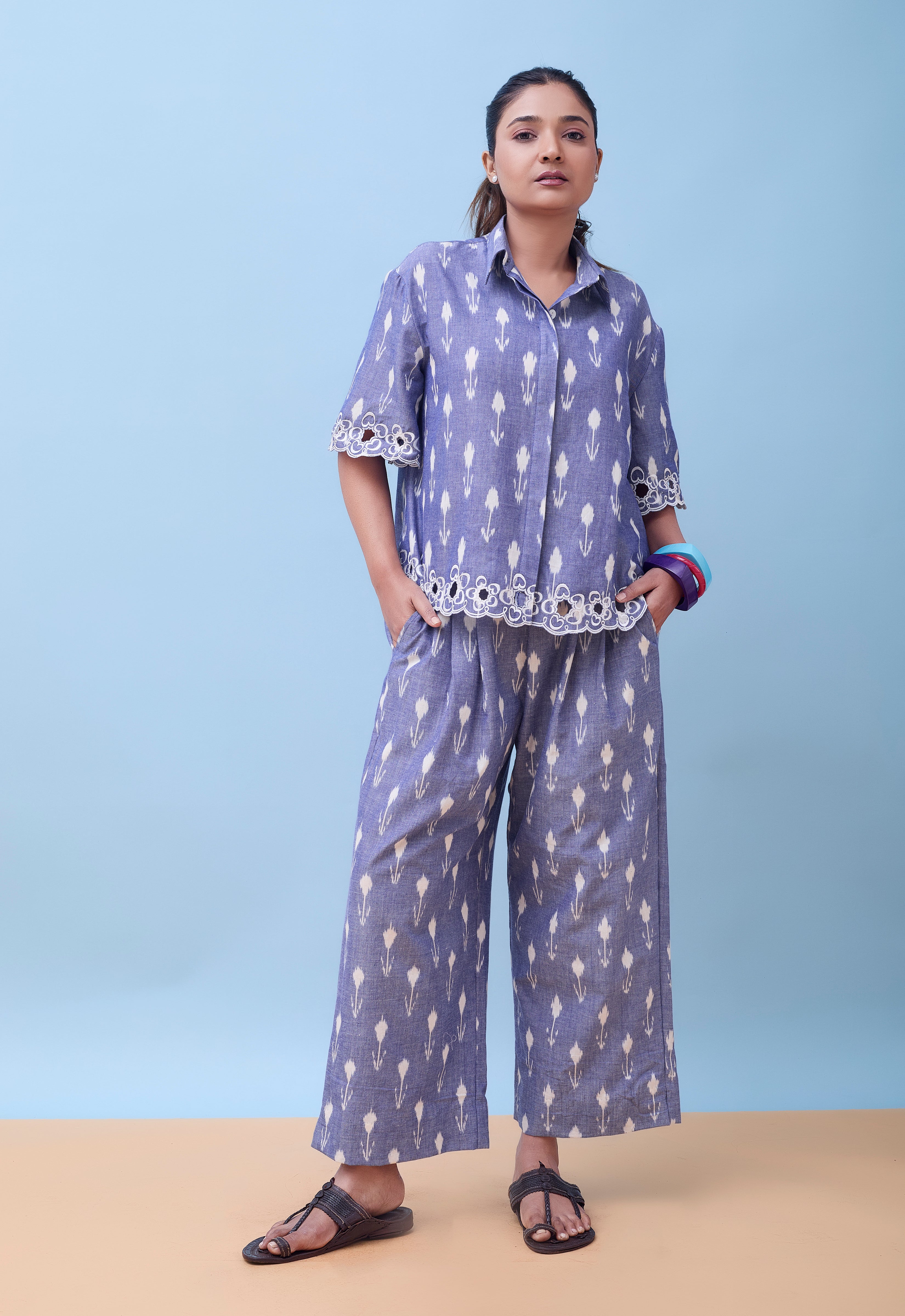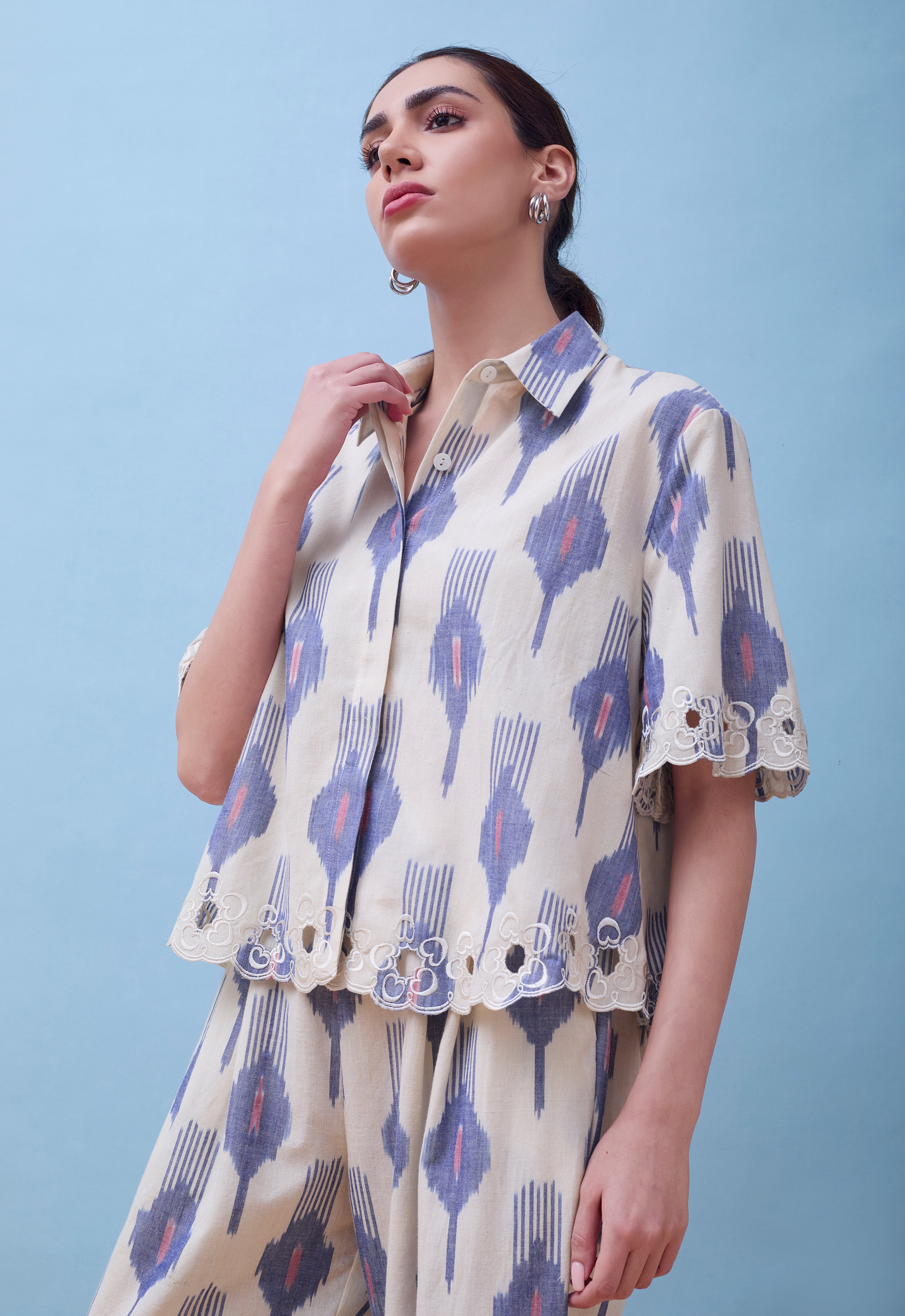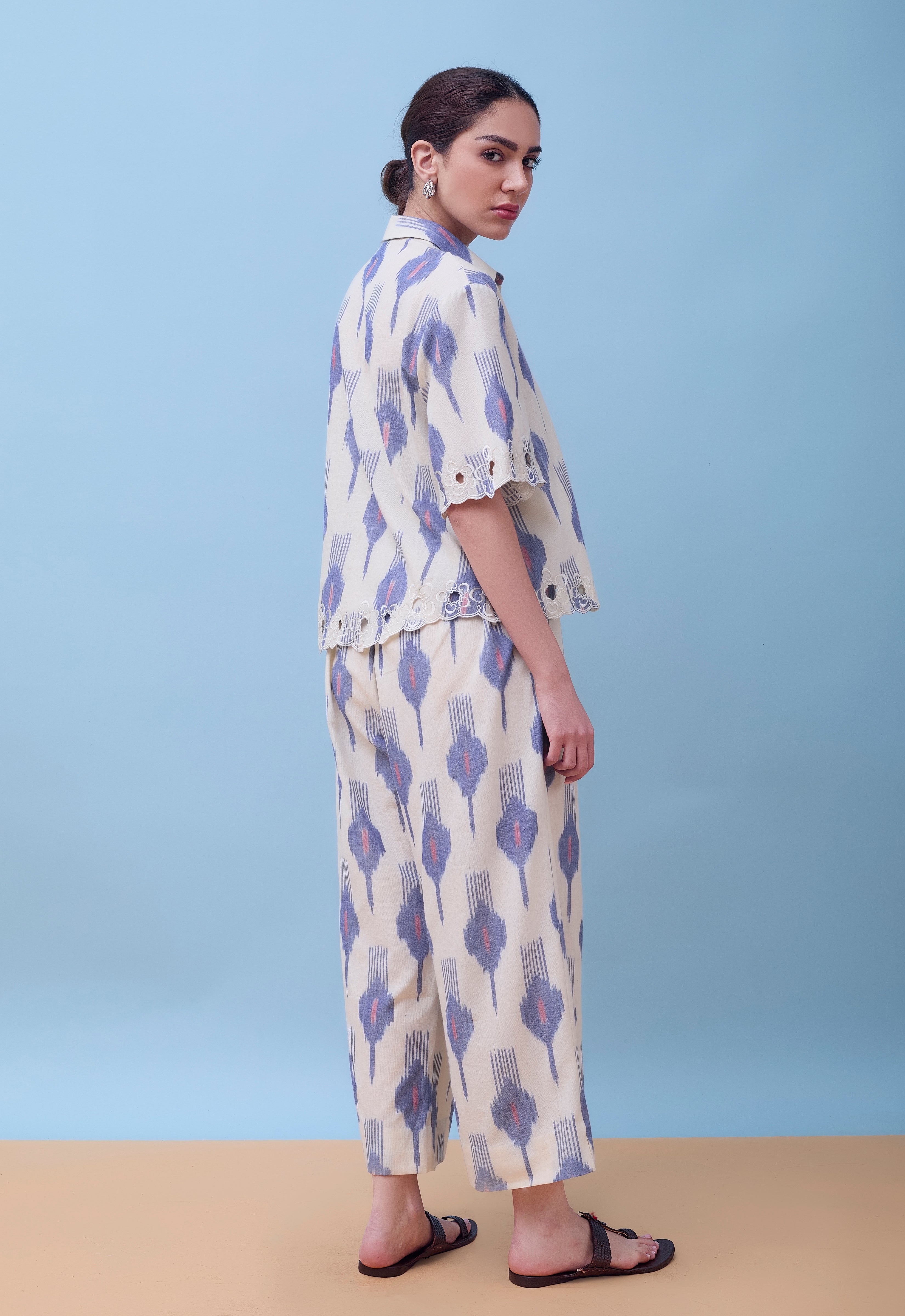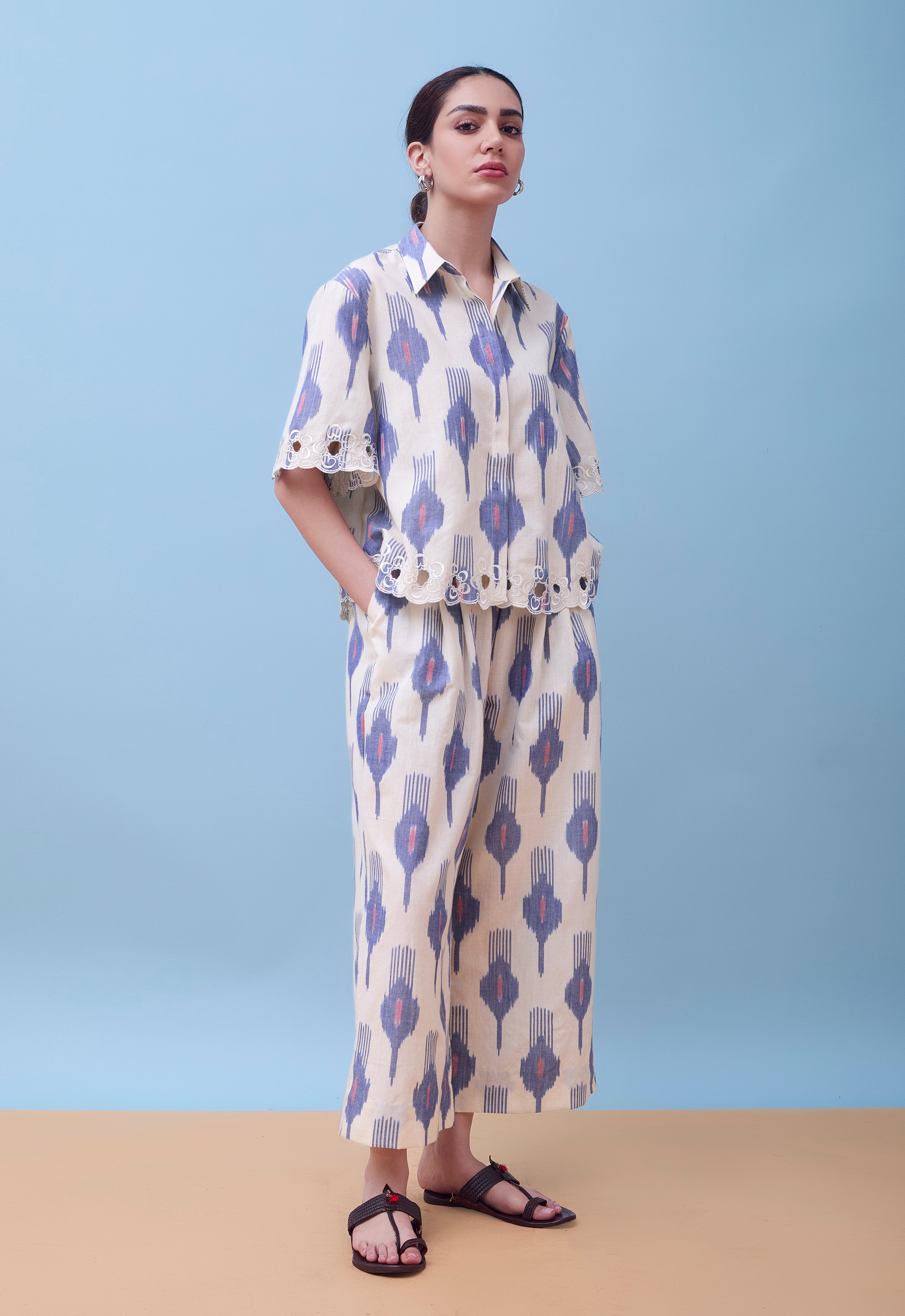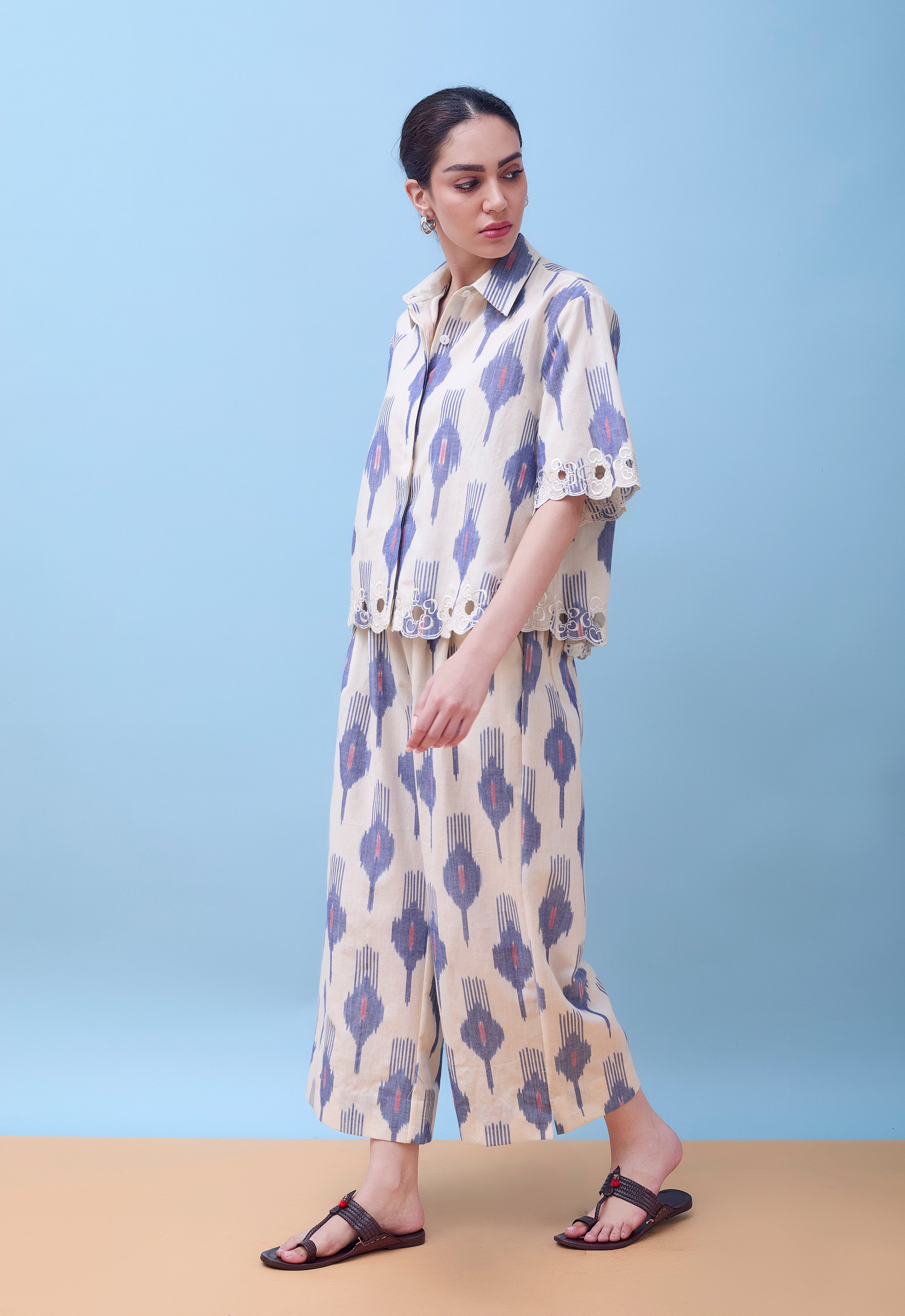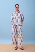 Crafted from breathable cotton ikat fabric with custom cutwork, this ensemble seamlessly transitions from professional settings to upscale social gatherings. Elevate your wardrobe with the Leher Co-Ord Set, a sophisticated pairing of a boxy cotton ikat shirt and pleated trousers. The relaxed silhouette of the shirt complements the refined pleating of the trousers, creating a balanced, contemporary look.