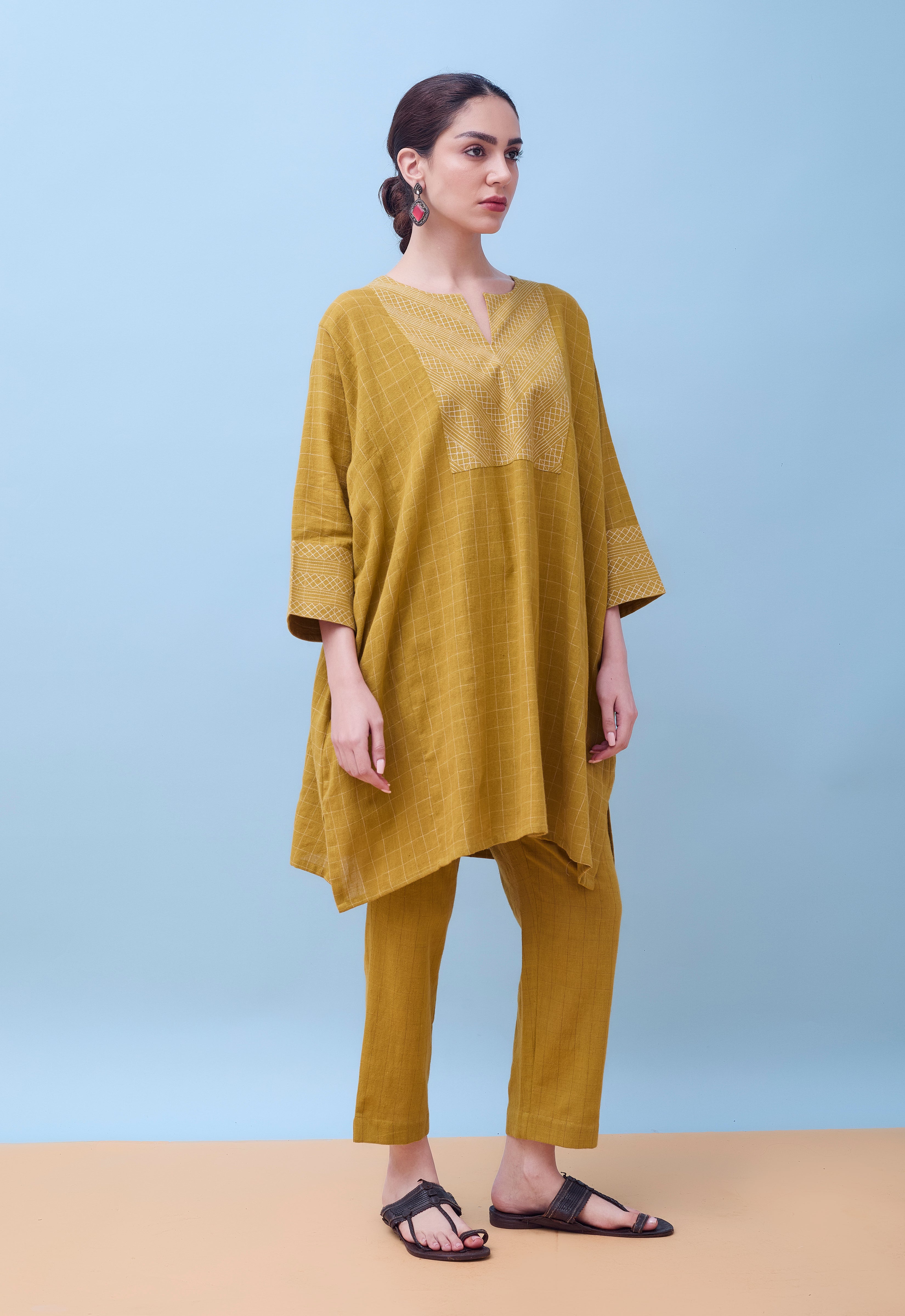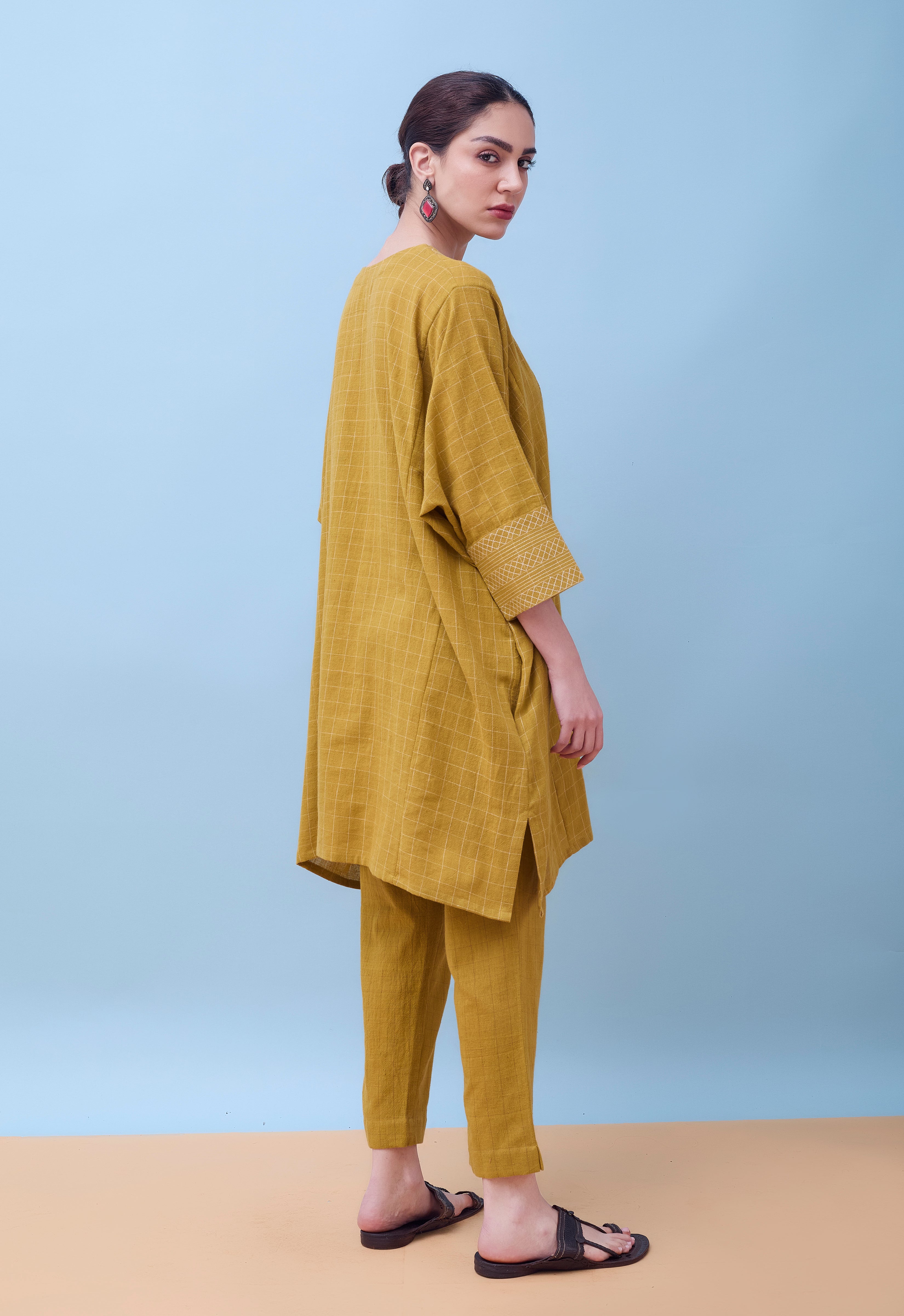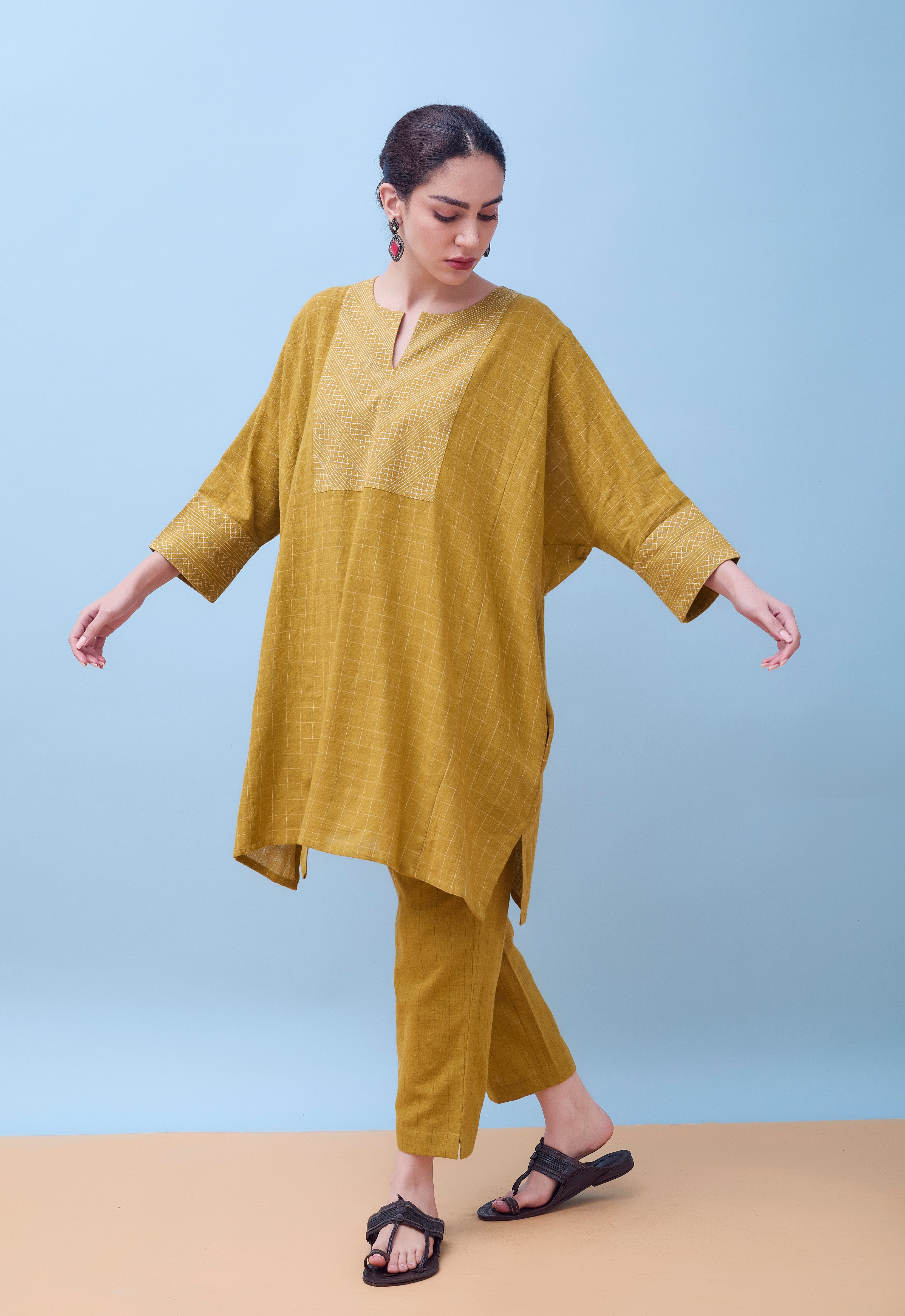 The Sandhya Handloom Kurta Set brings together traditional craftsmanship and contemporary comfort. Featuring delicate thread work detailing on the yoke, this versatile piece transitions seamlessly across seasons. Crafted for all-day wear, it combines the softness of handloom fabric with a chic silhouette that works for both casual gatherings and relaxed celebrations. A timeless addition to any wardrobe that celebrates artisanal quality.