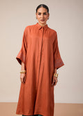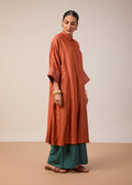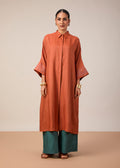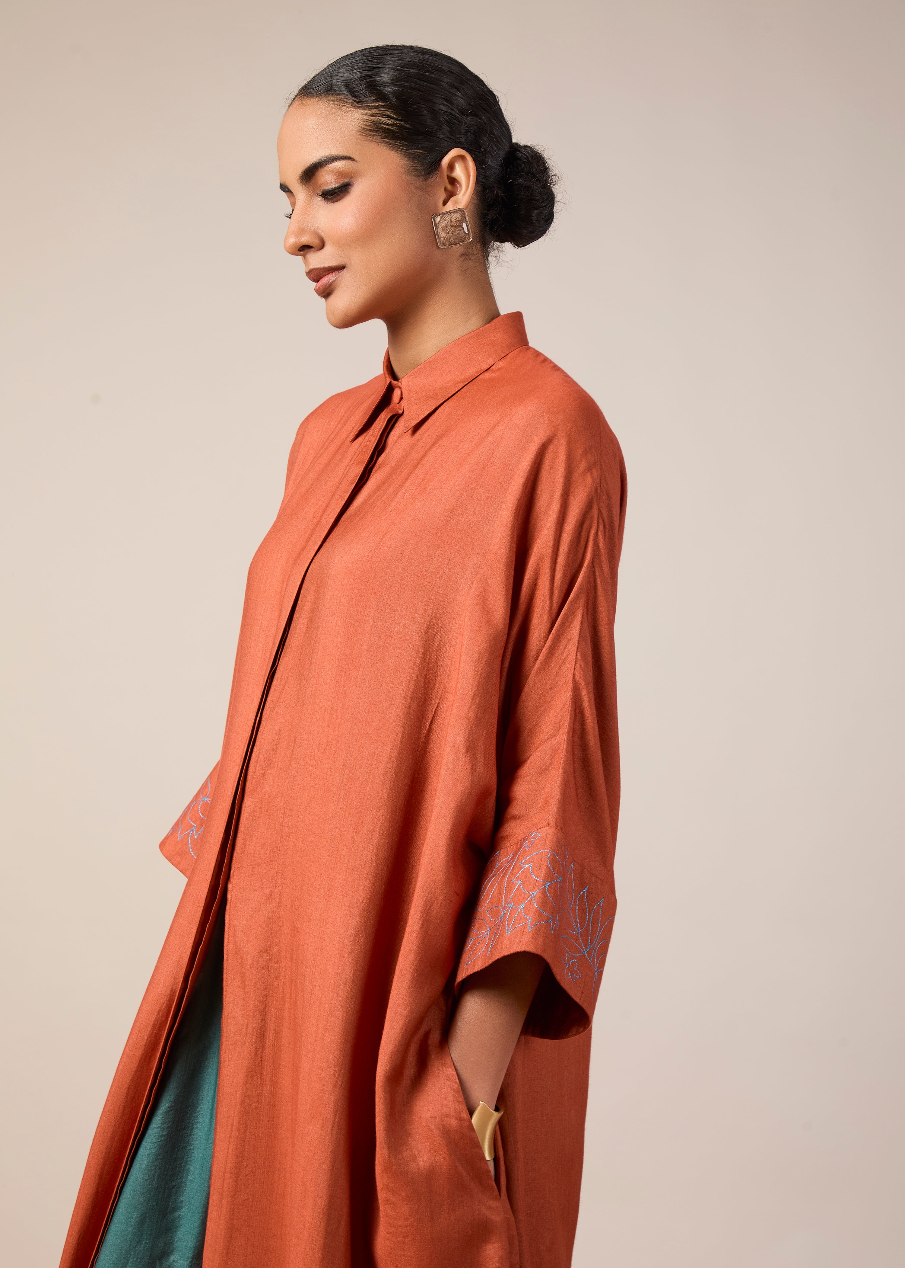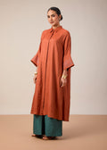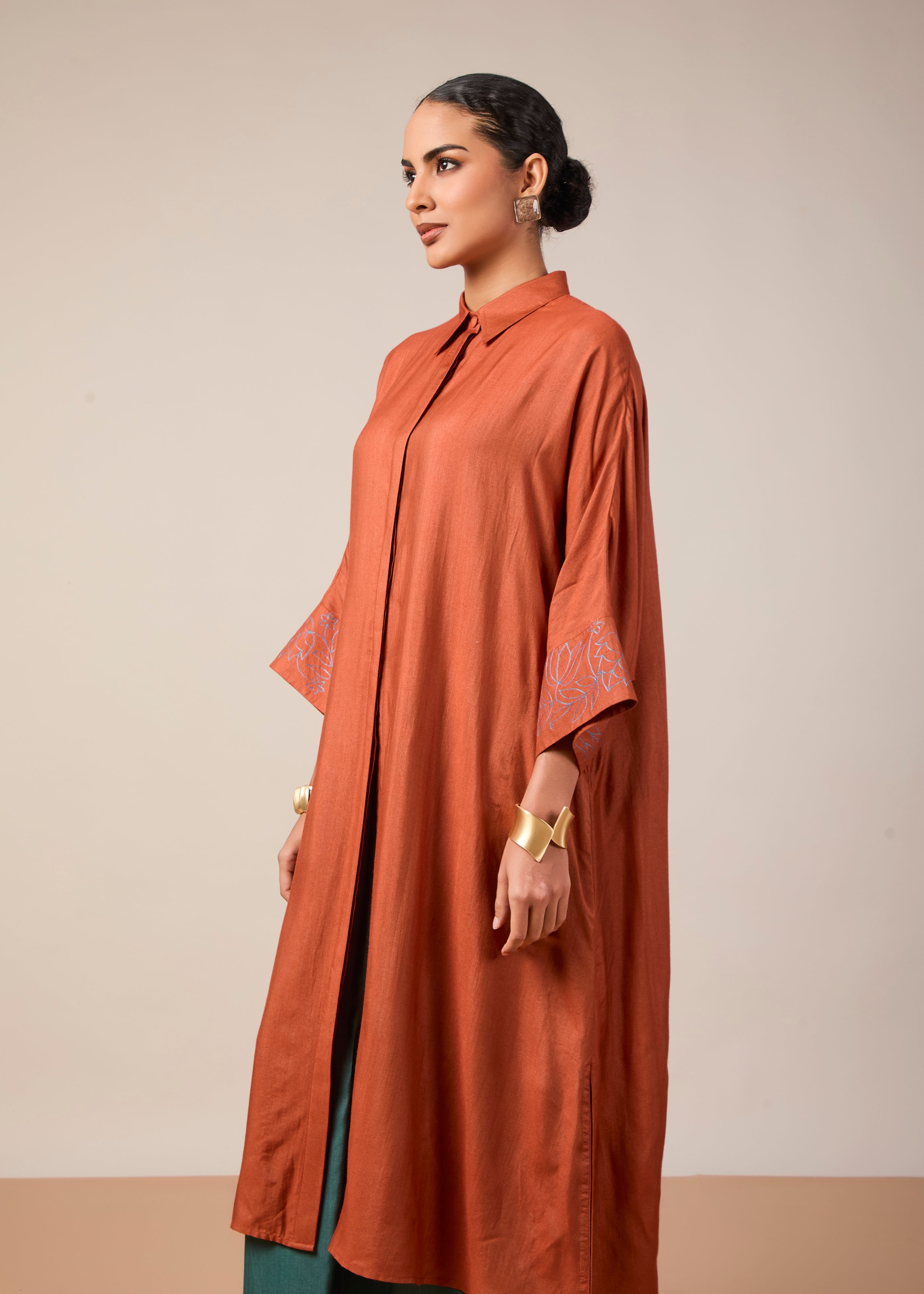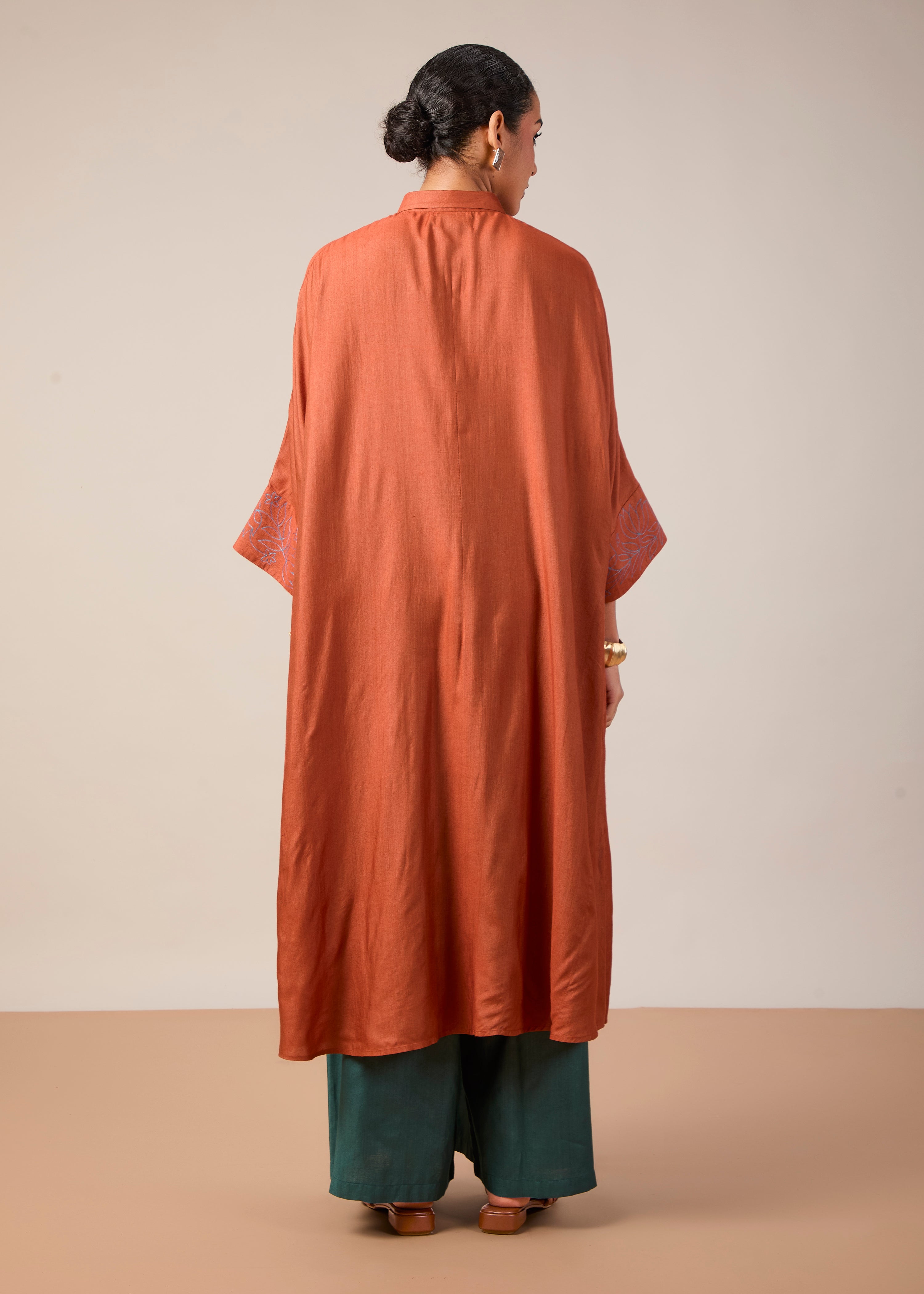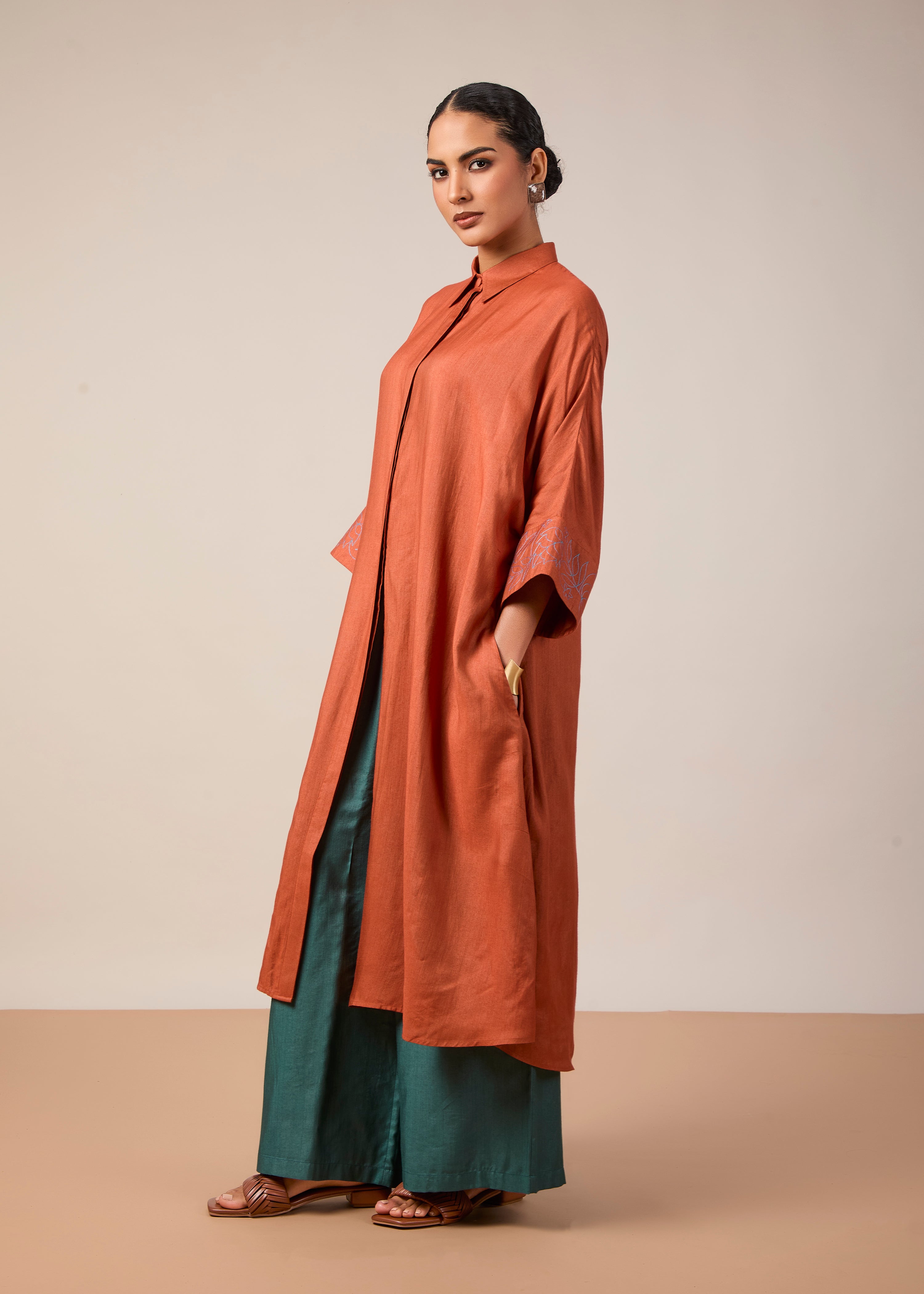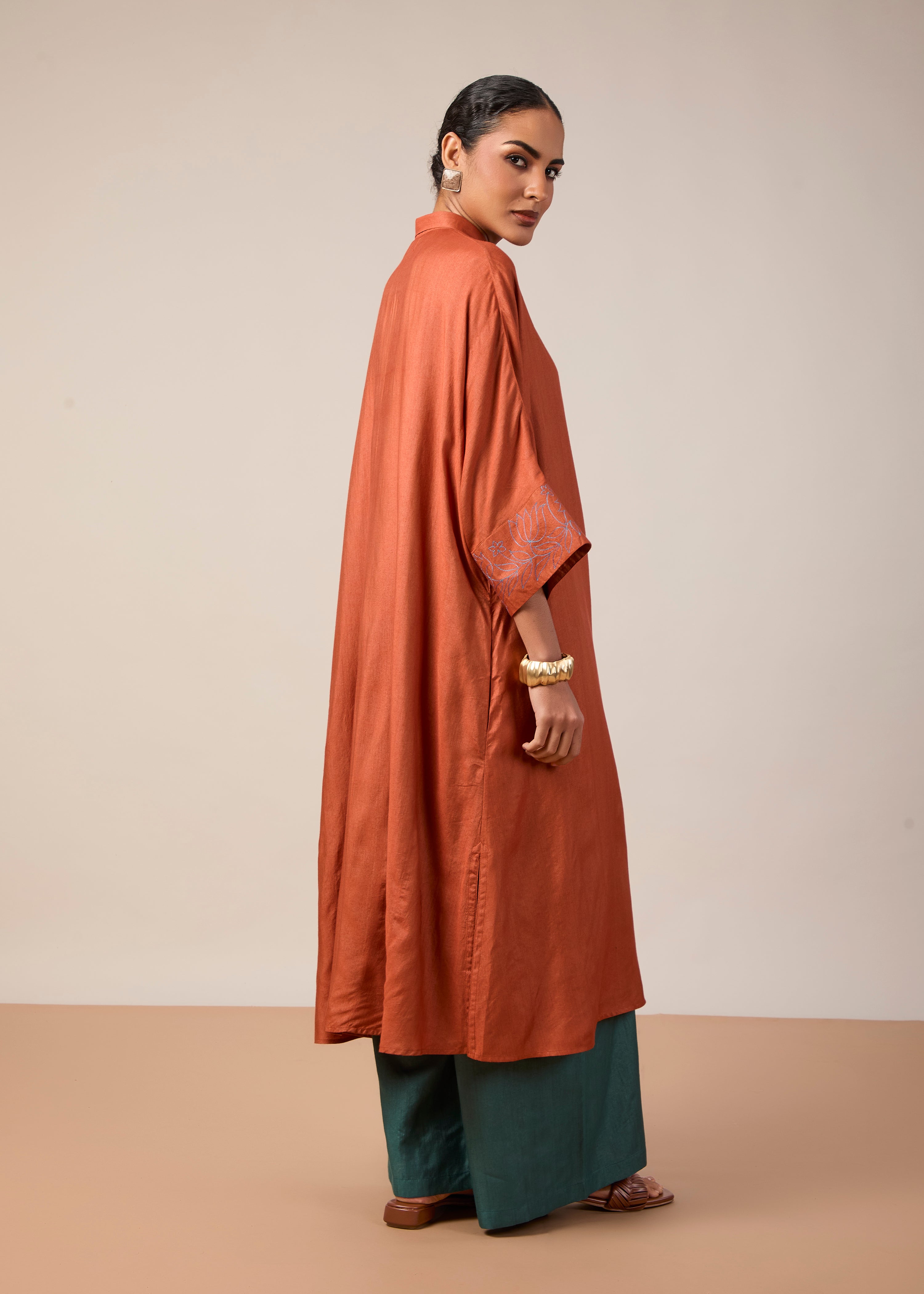 A minimal-style formal long kurta with side pockets and threadwork embroidery. Made in all natural silk blend, this fabric drapes the body luxuriously.
