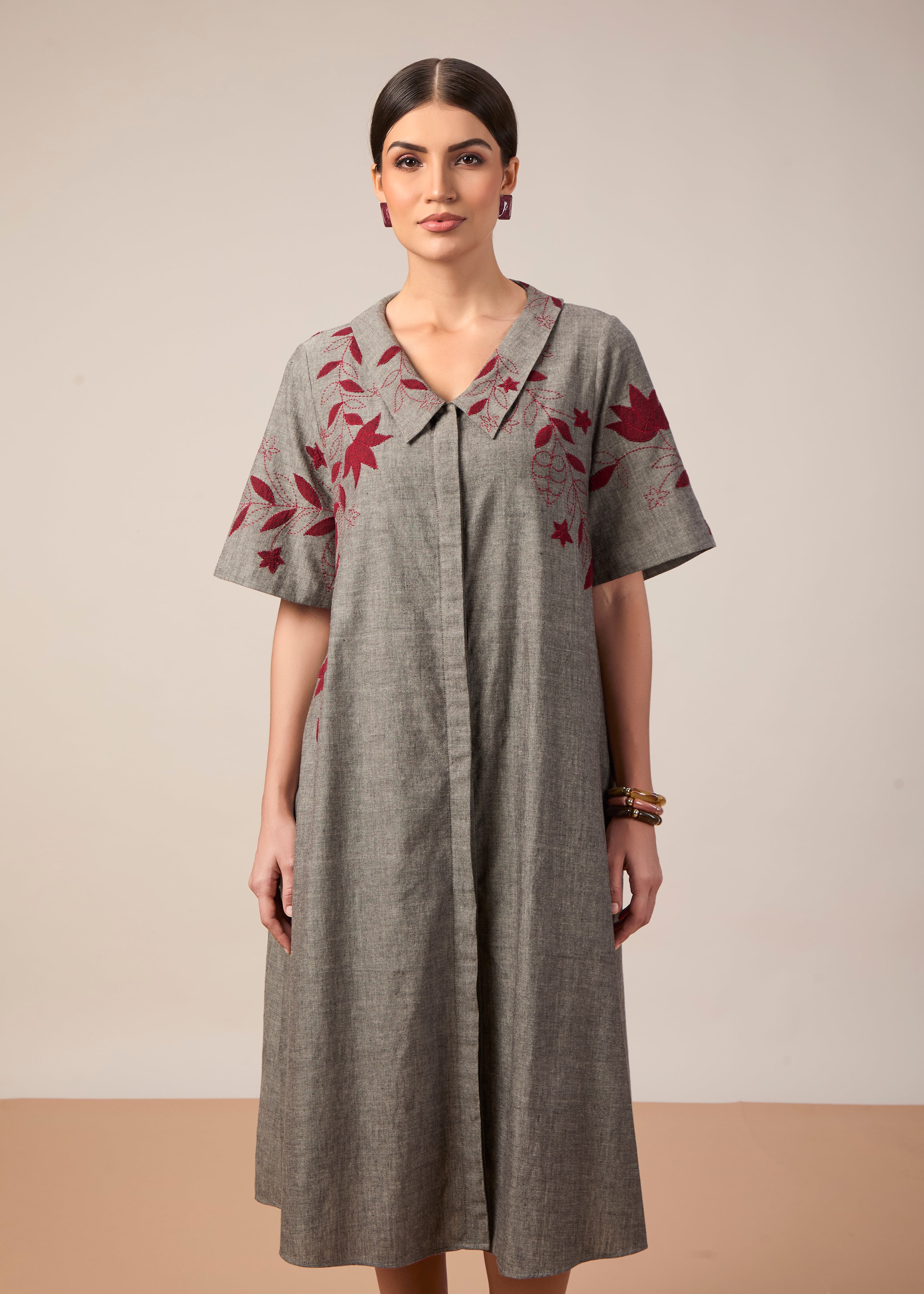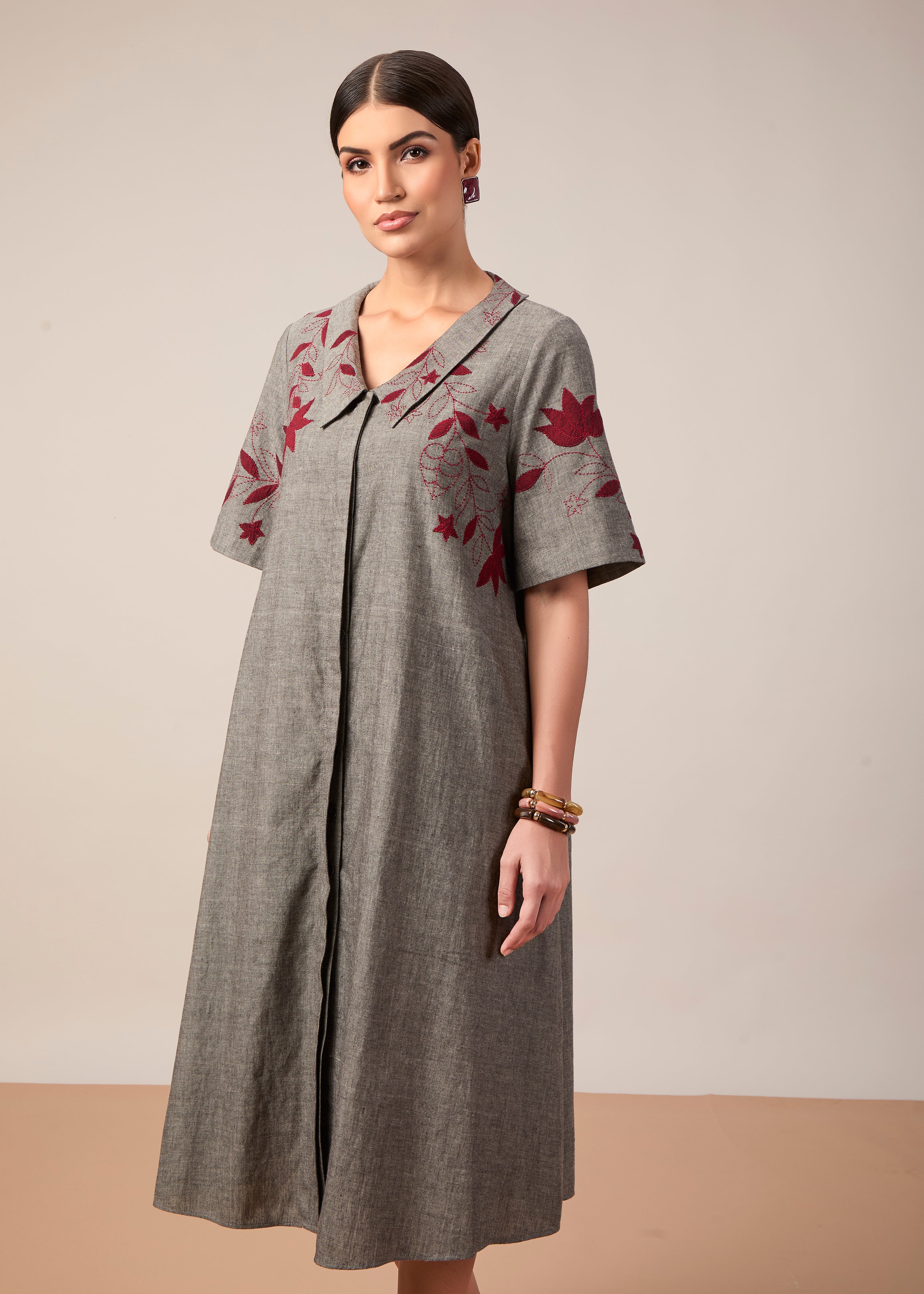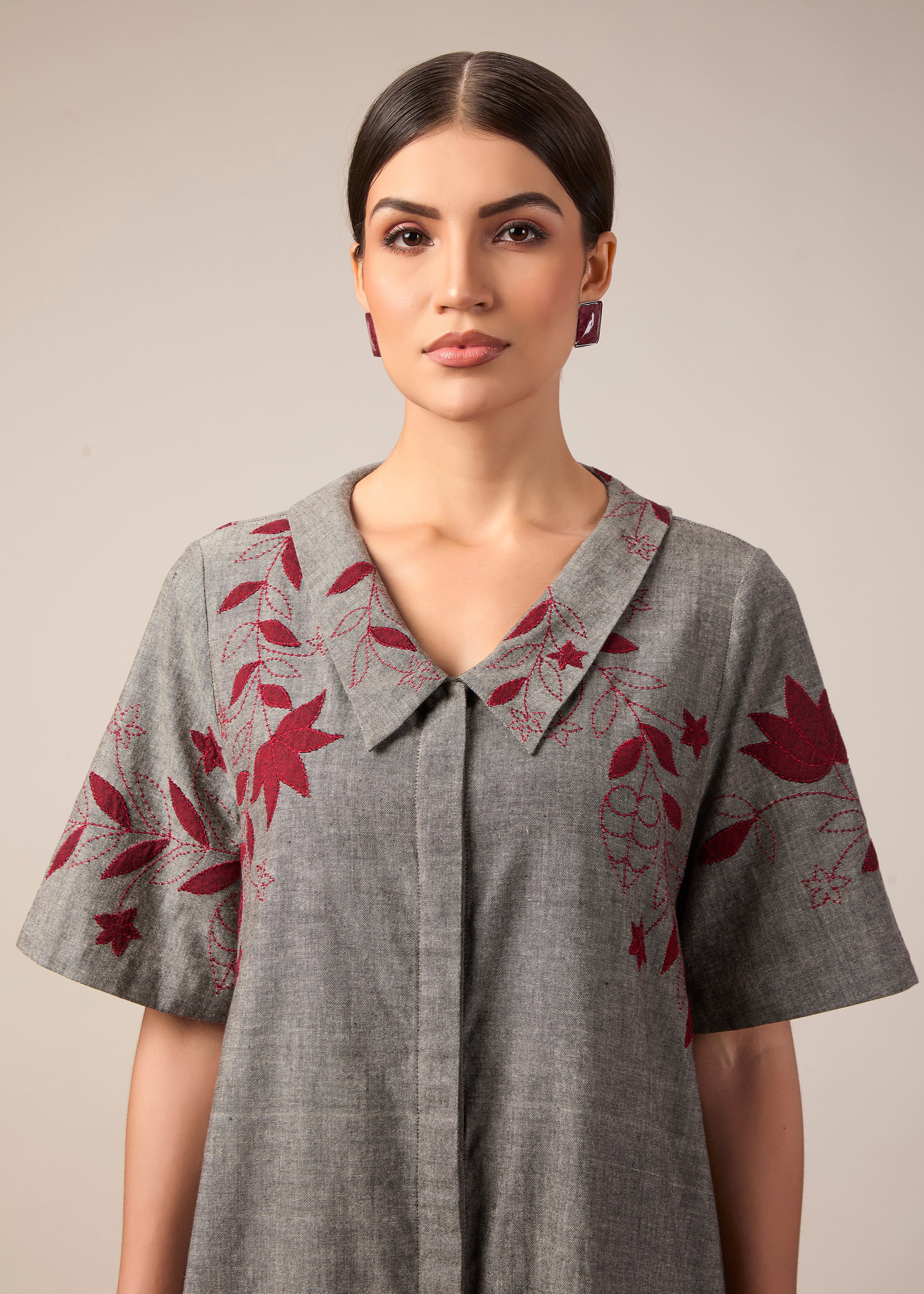 A line dress with Chelsea collar, comfortable fit with red applique and threadwork embroidery on handloom cotton. This fabric is luxuriously lightweight, opaque and flowy.