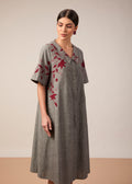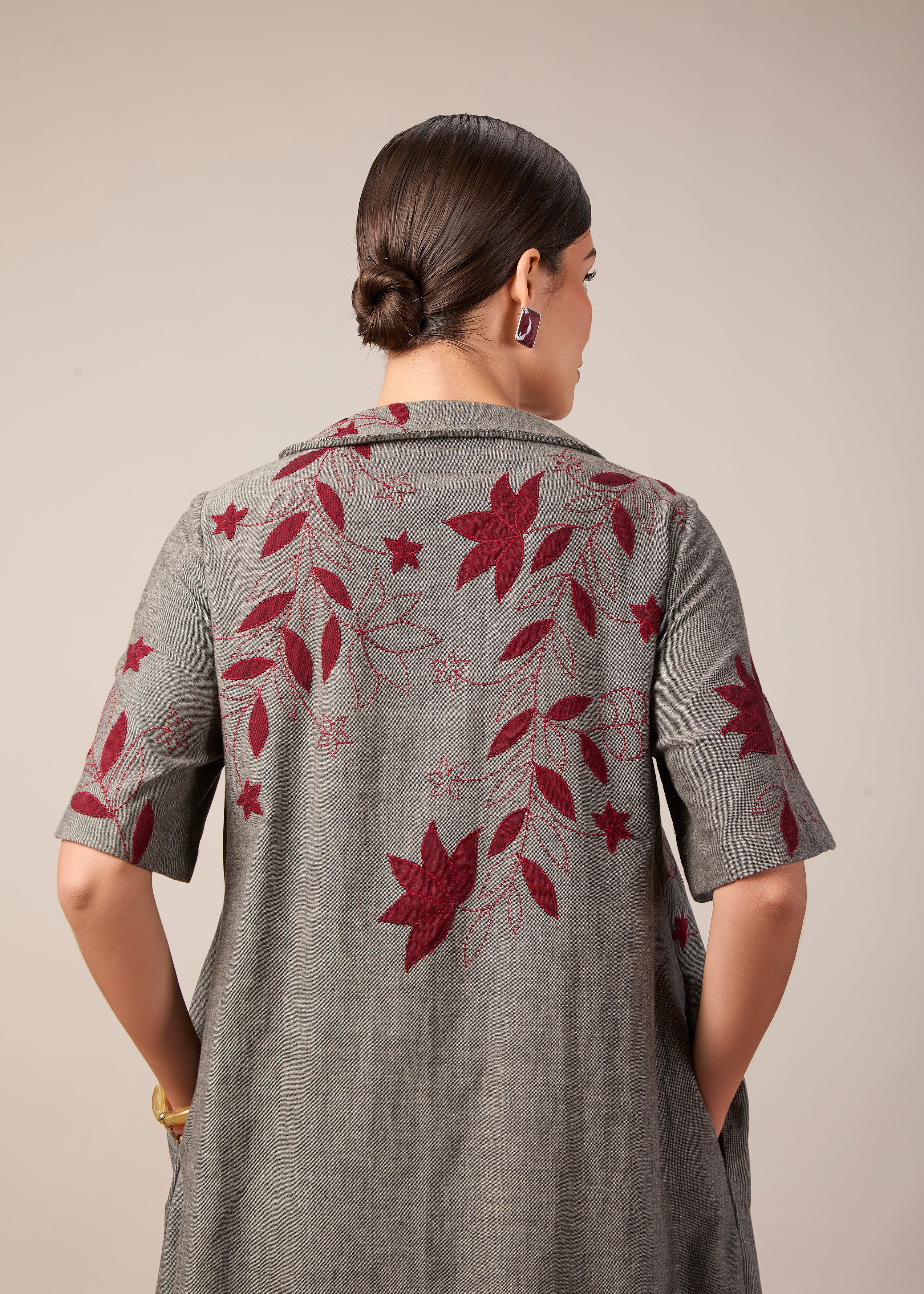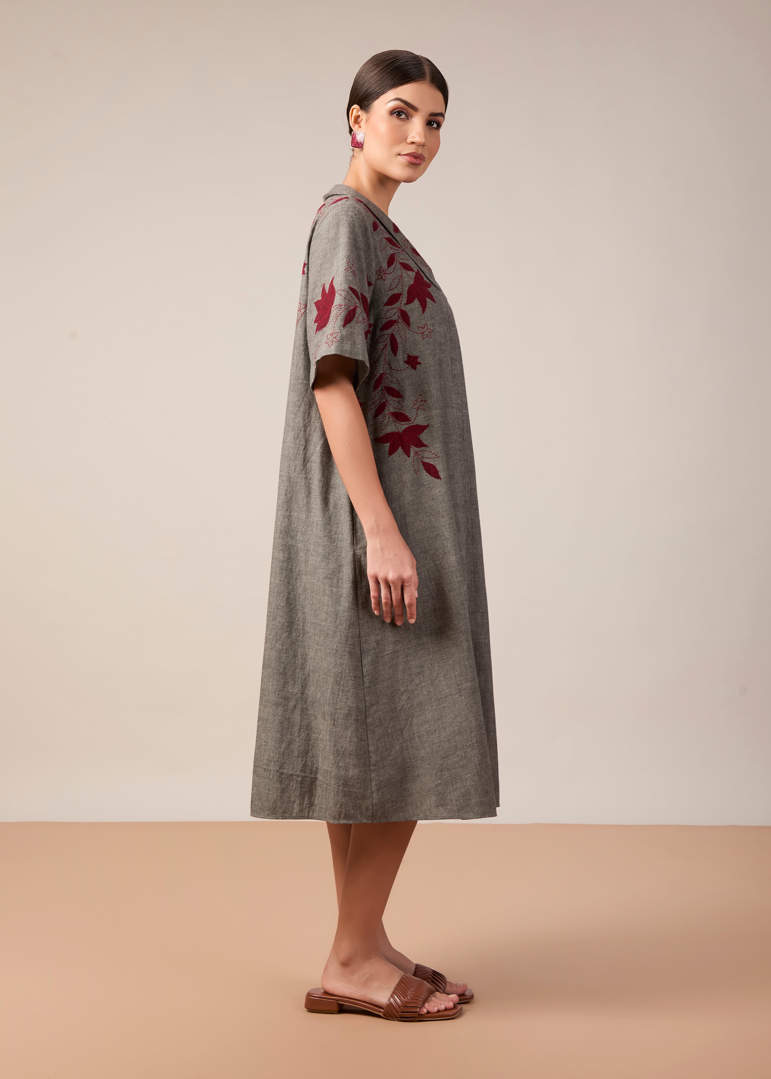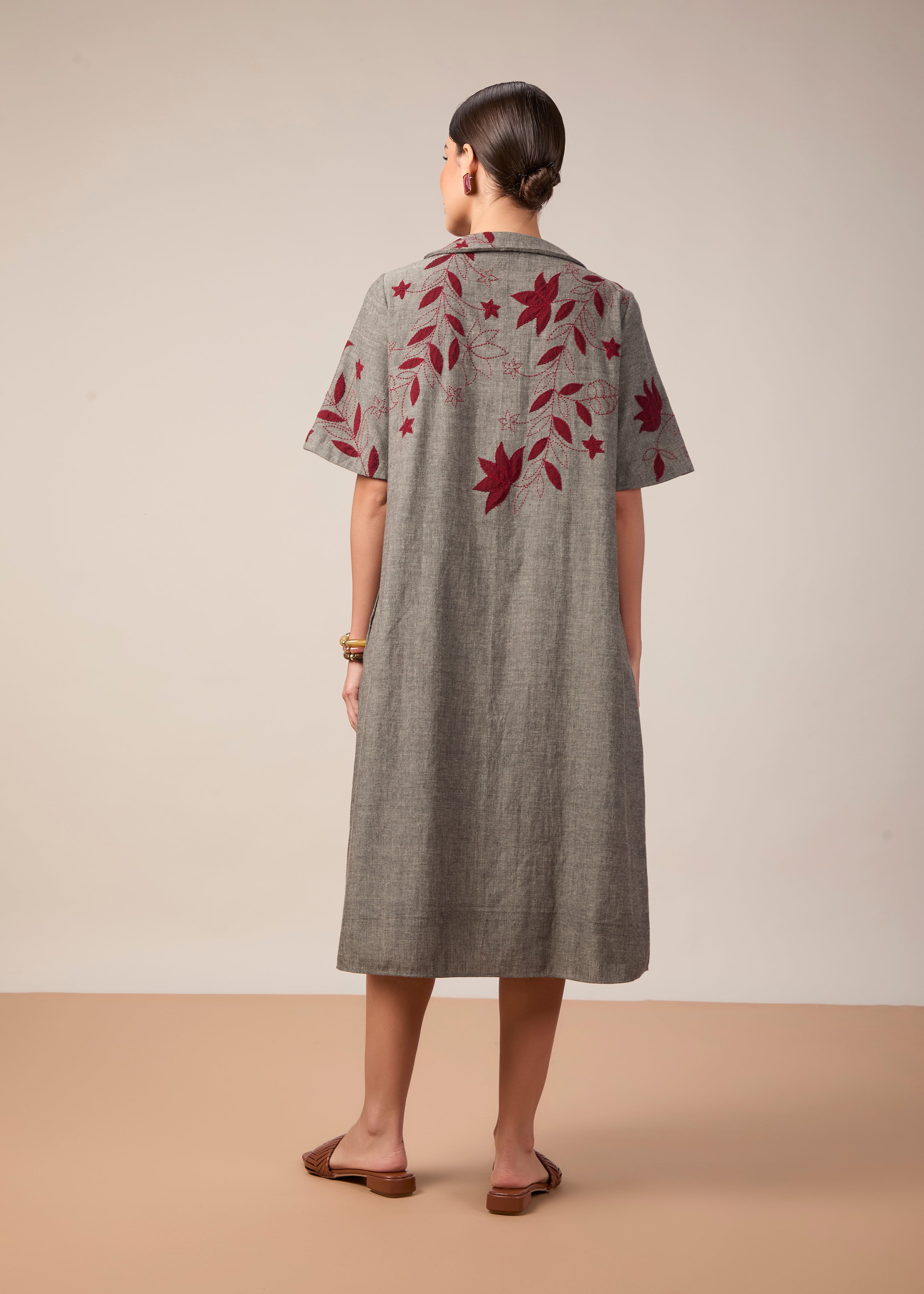 A line dress with Chelsea collar, comfortable fit with red applique and threadwork embroidery on handloom cotton. This fabric is luxuriously lightweight, opaque and flowy.