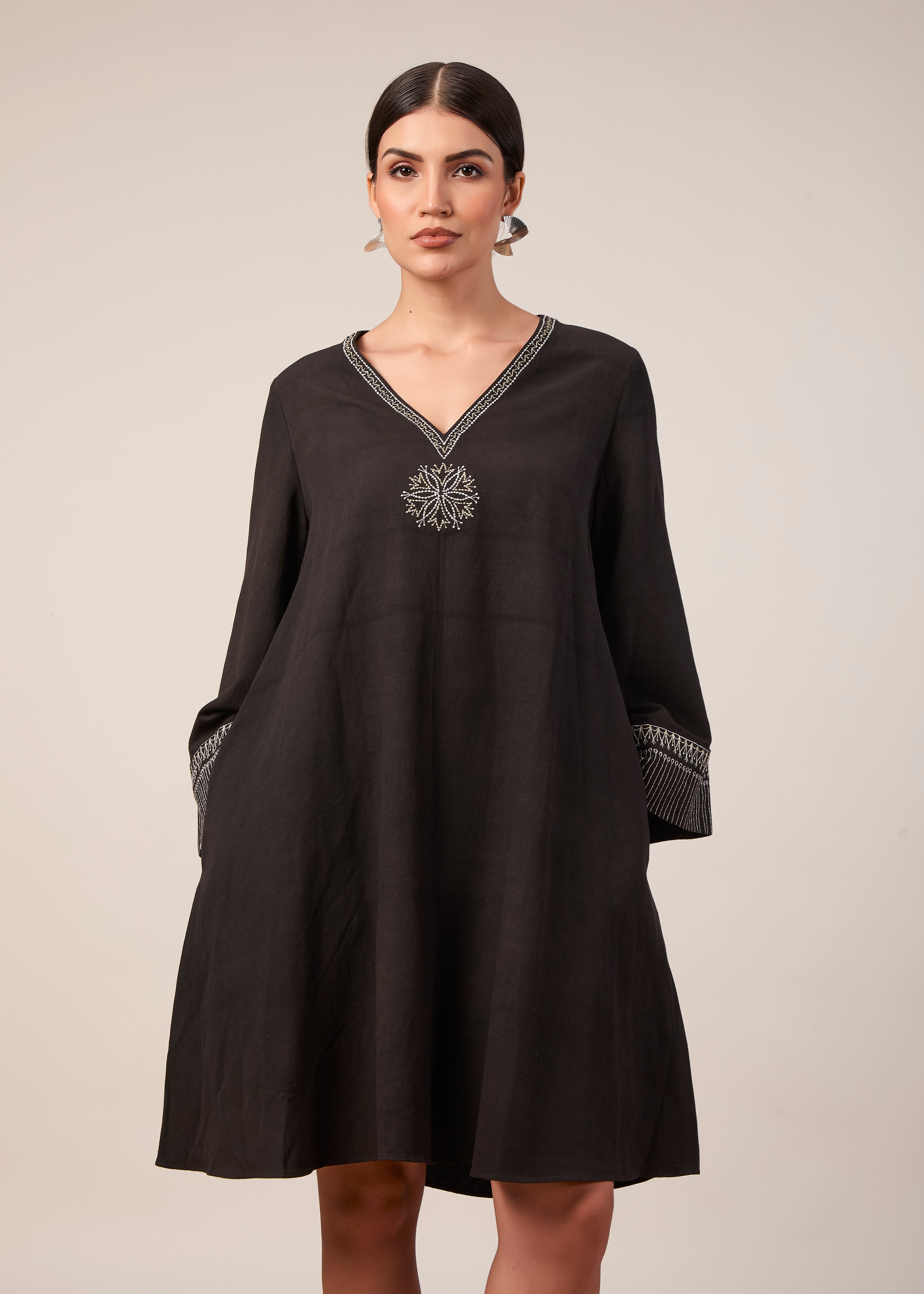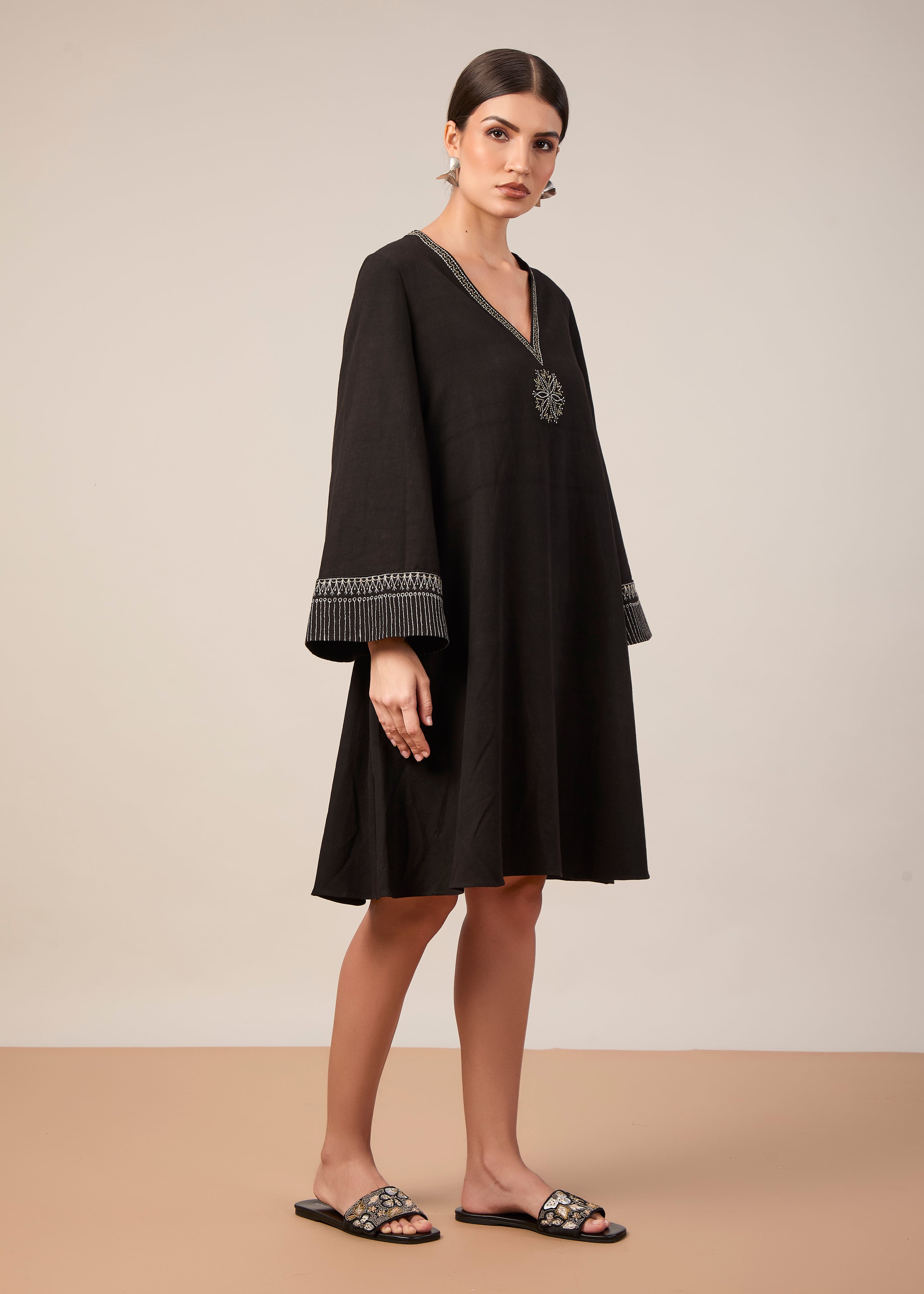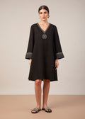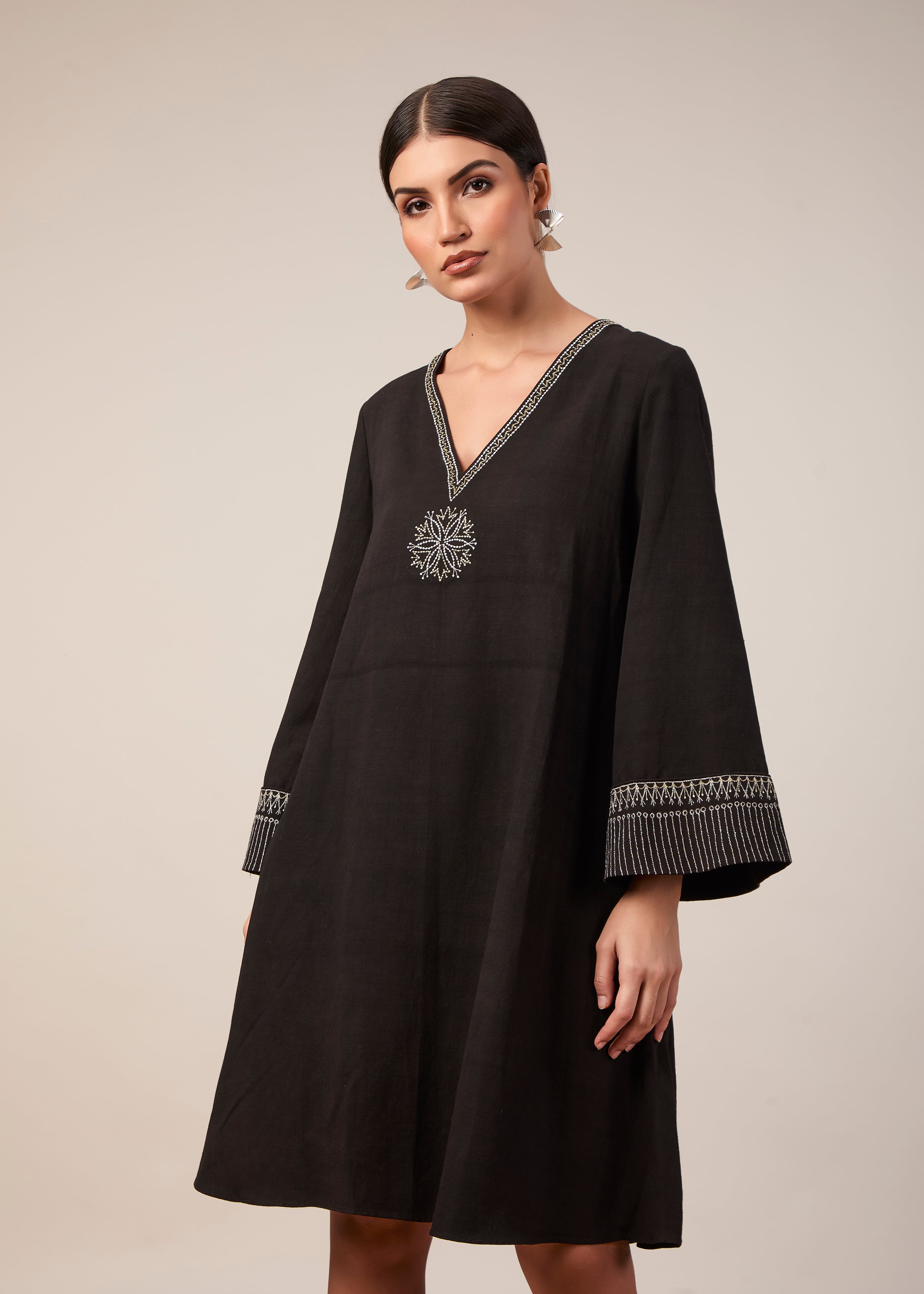 A low cut V-neck dress with silver and gold thread embroidery. This dress has side pockets. Made in all natural bamboo cotton.