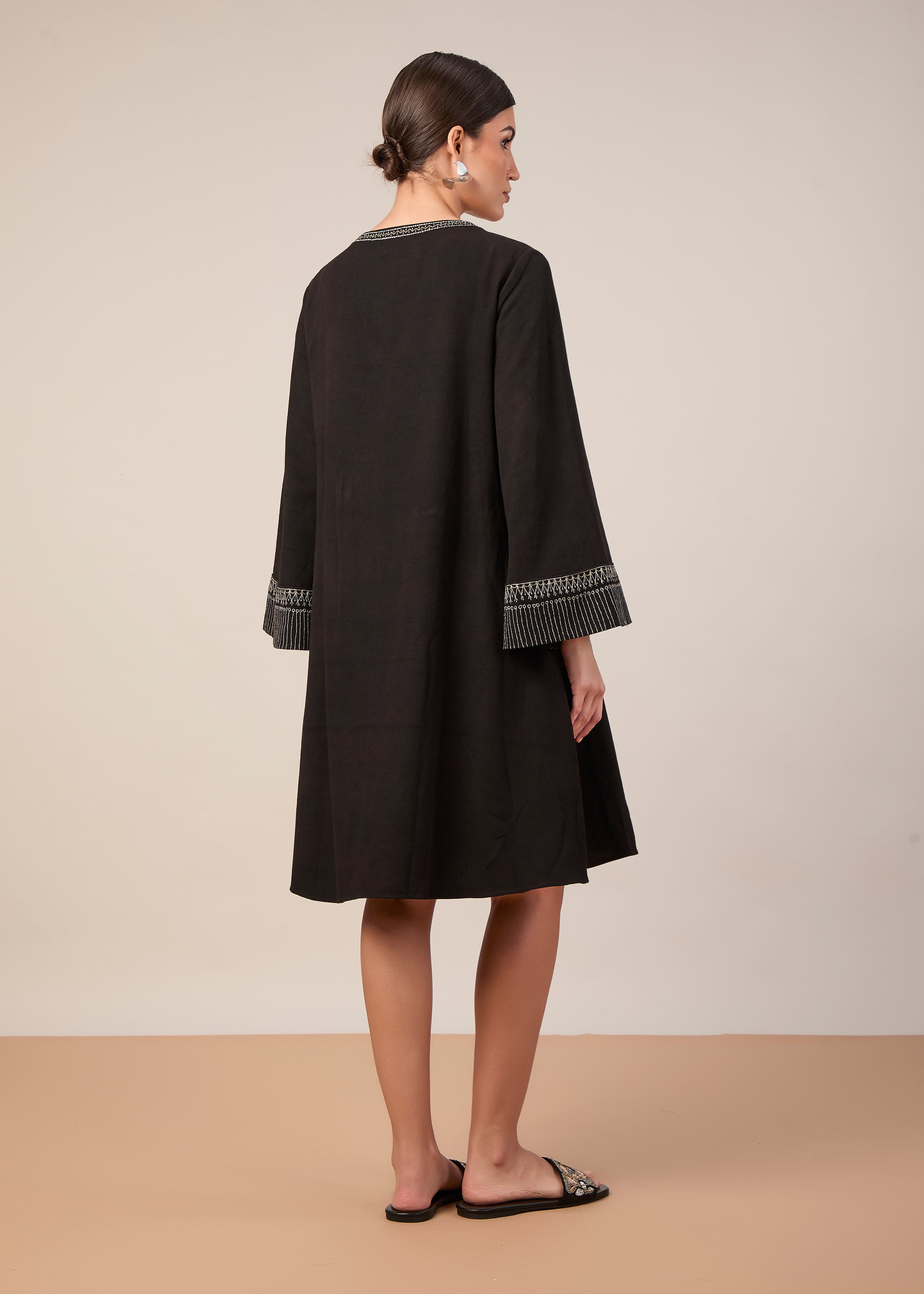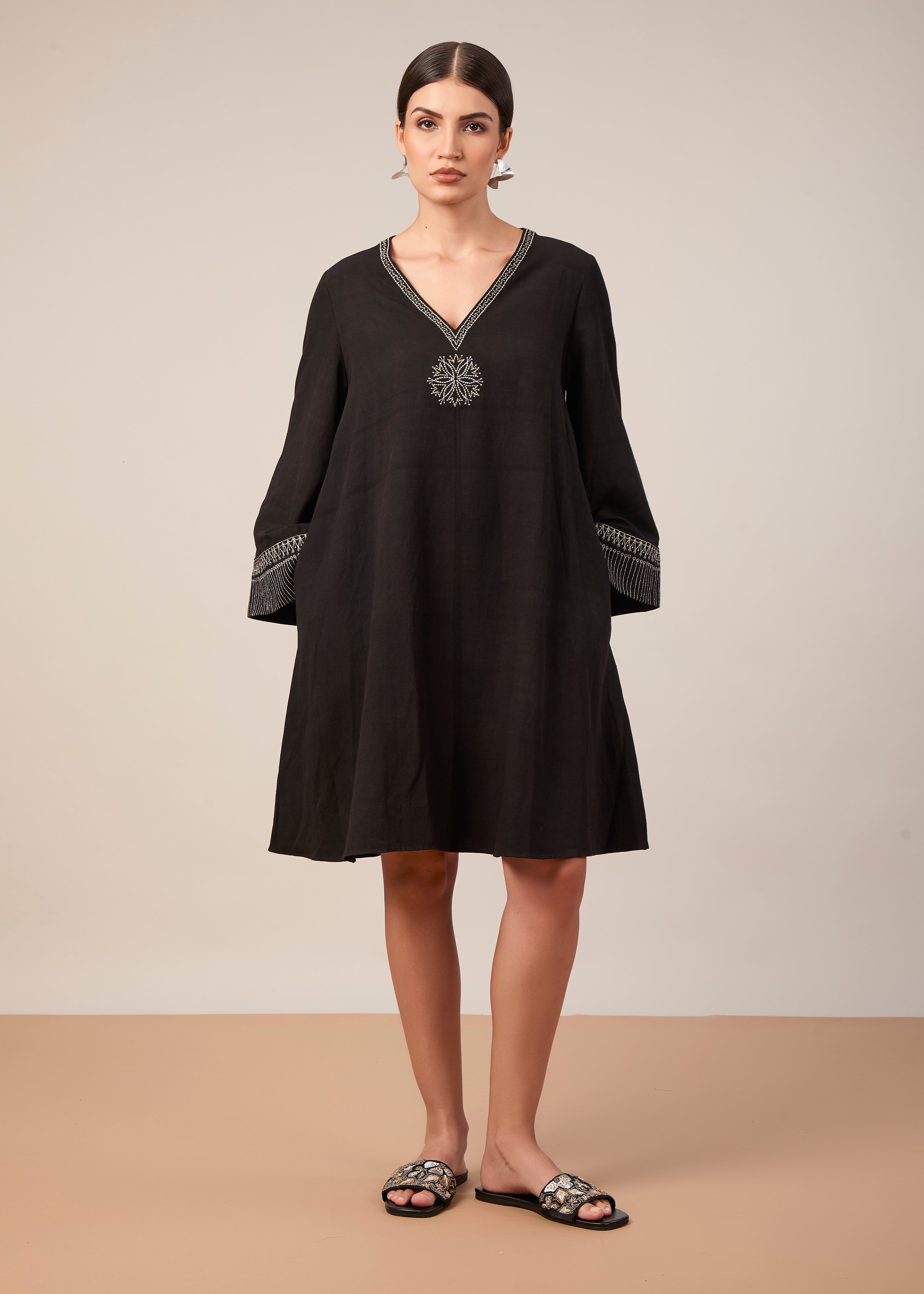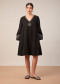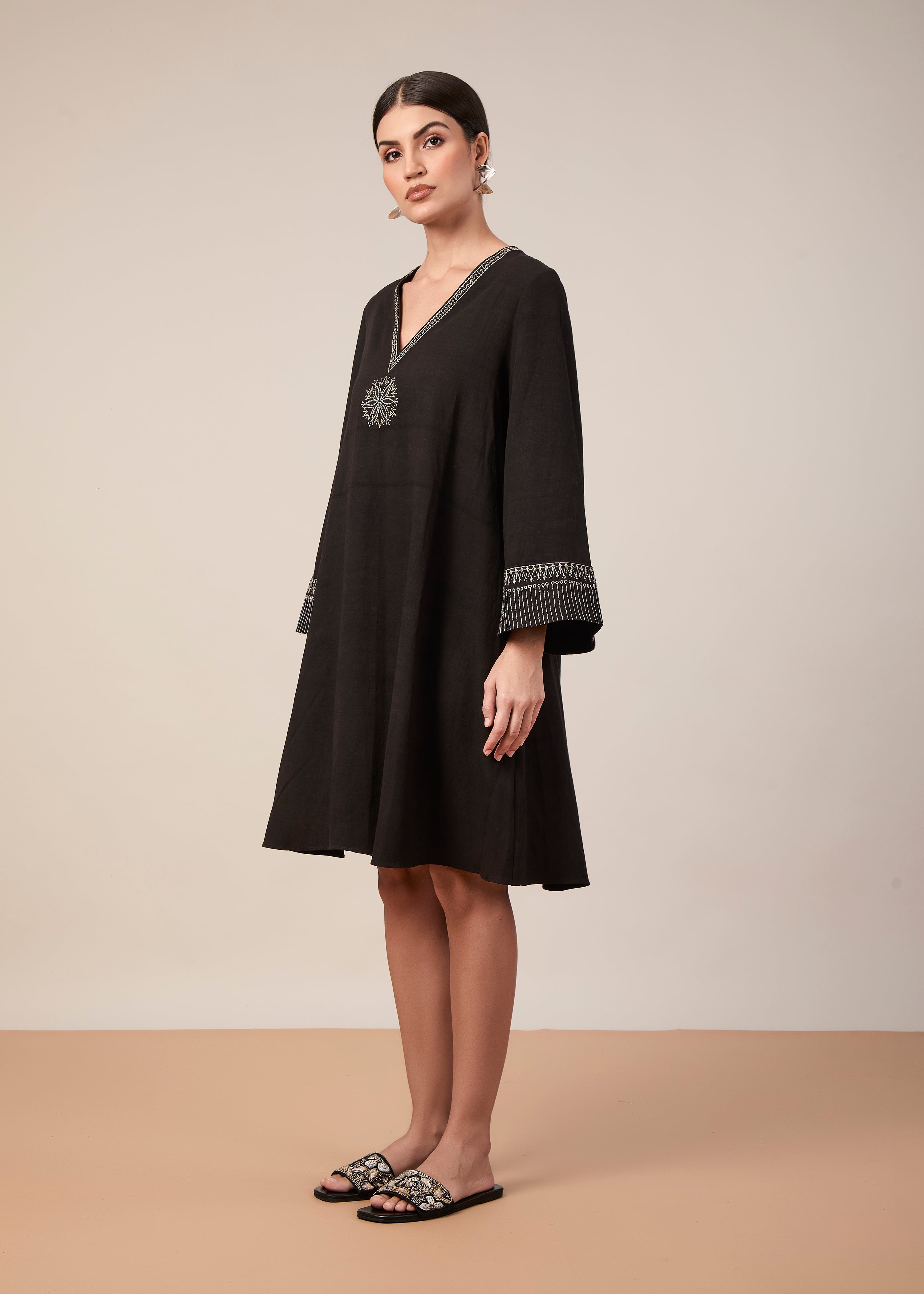 A low cut V-neck dress with silver and gold thread embroidery. This dress has side pockets. Made in all natural bamboo cotton.
