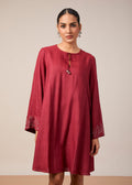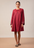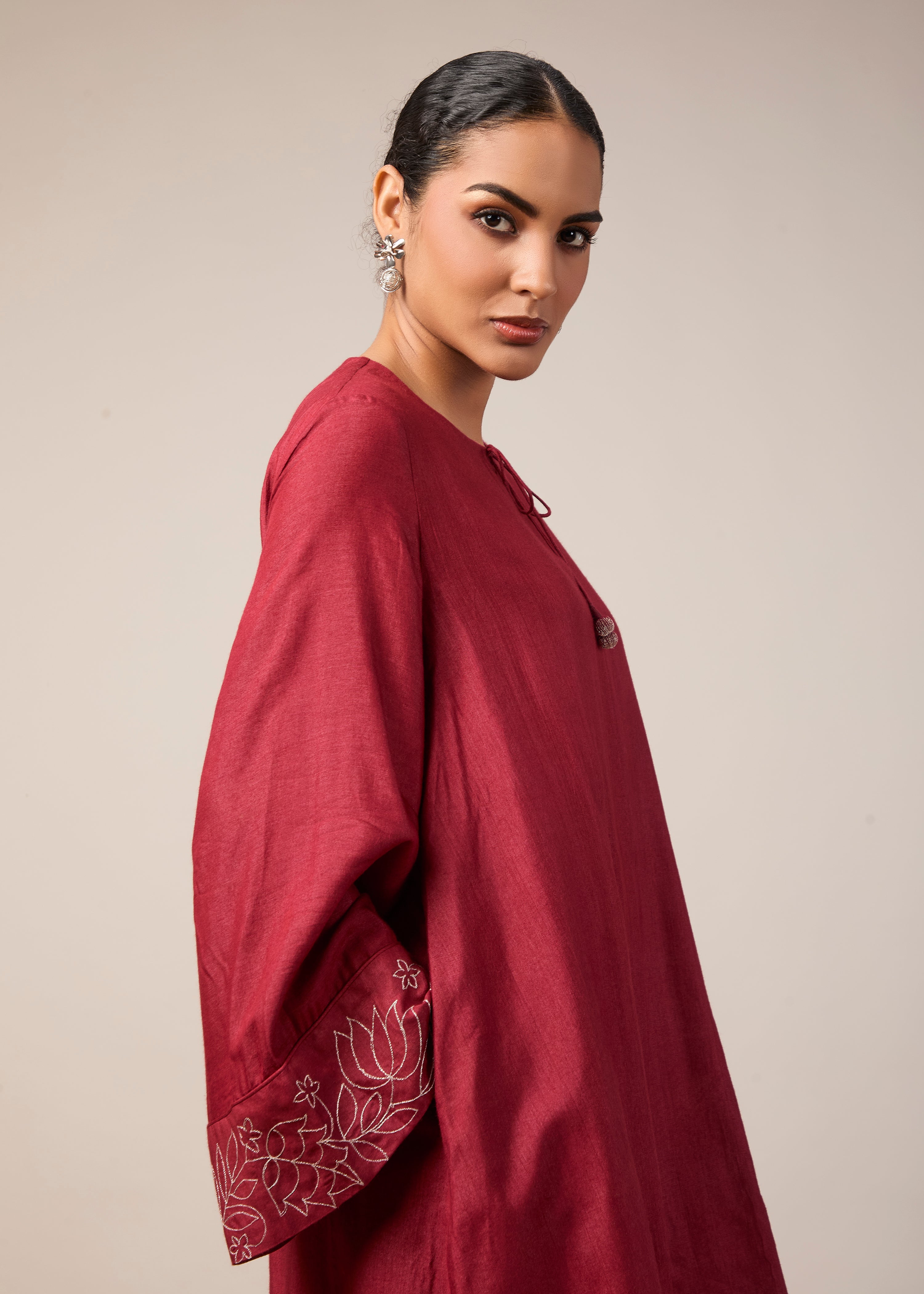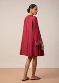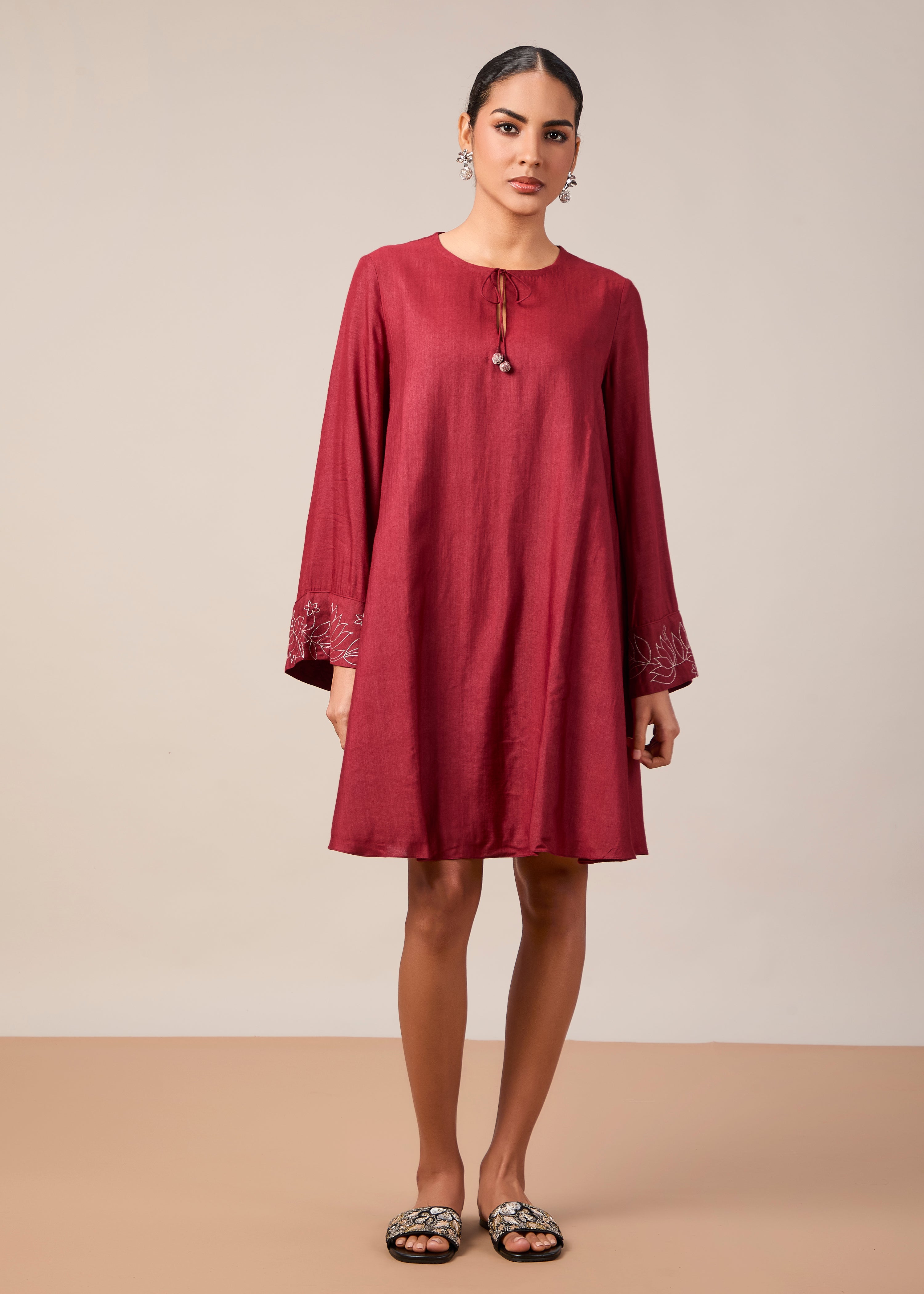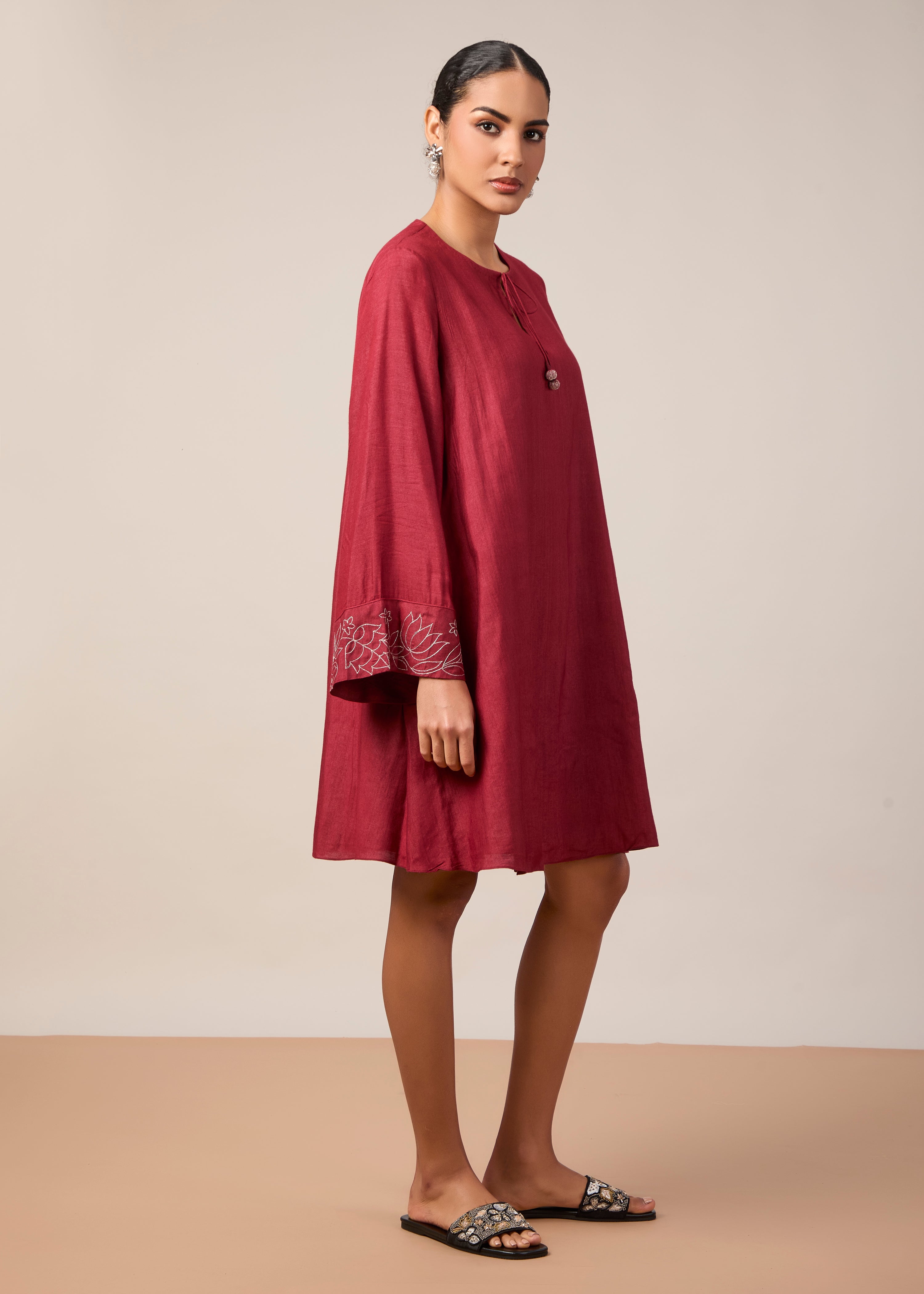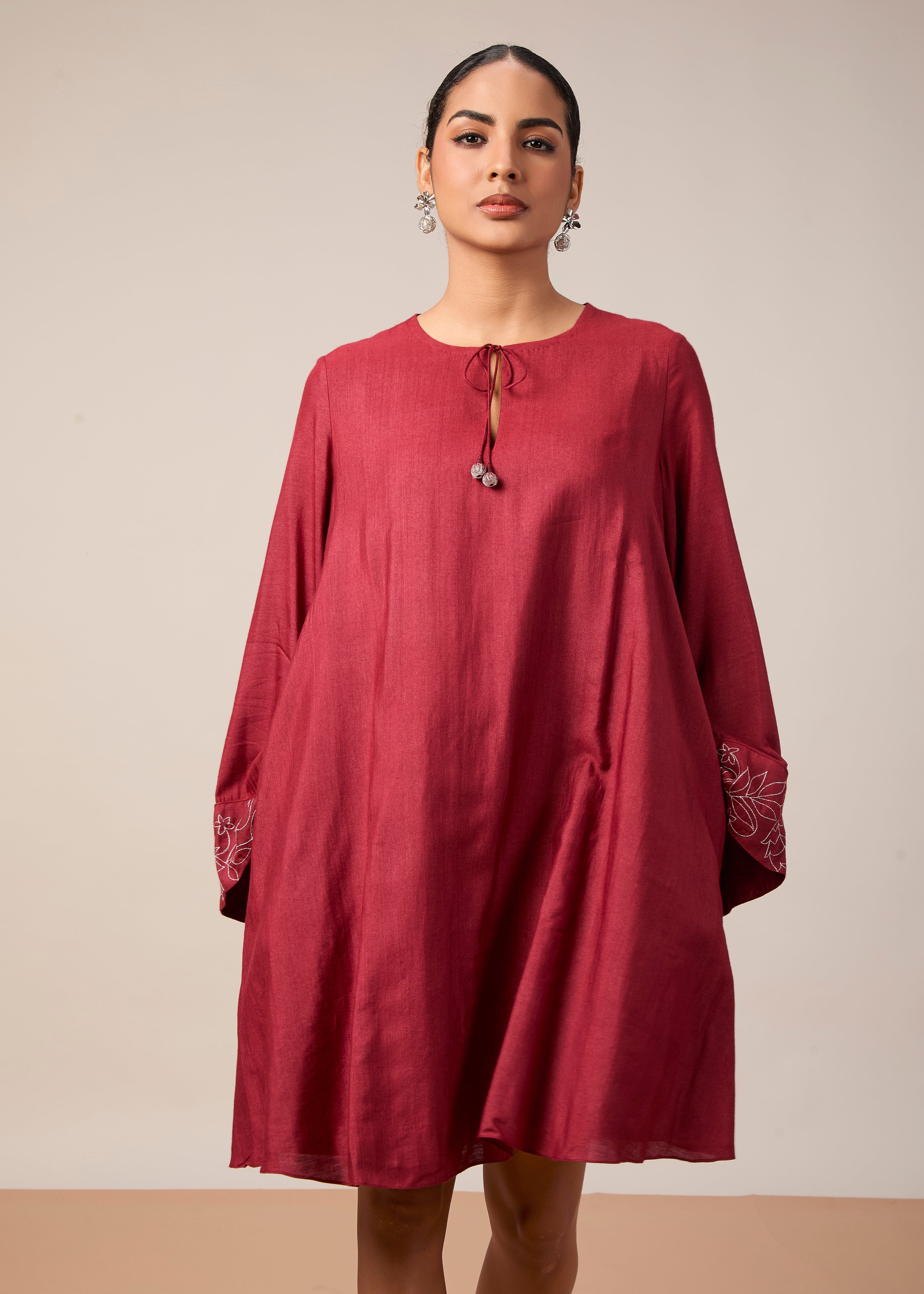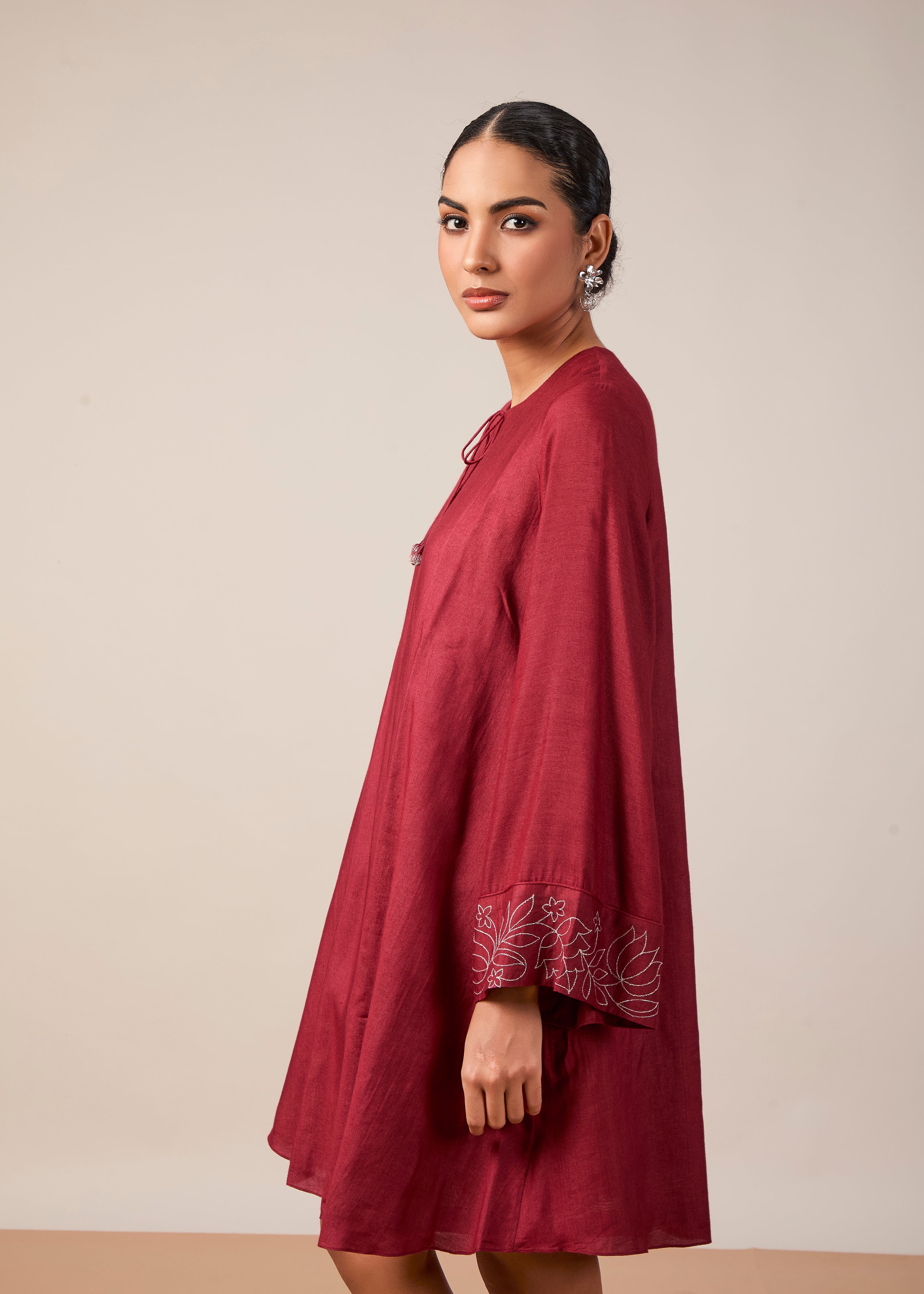 A lightweight silk dress with silver metallic embroidery on the sleeves. Flare cut dress with side pockets and light organza lining.