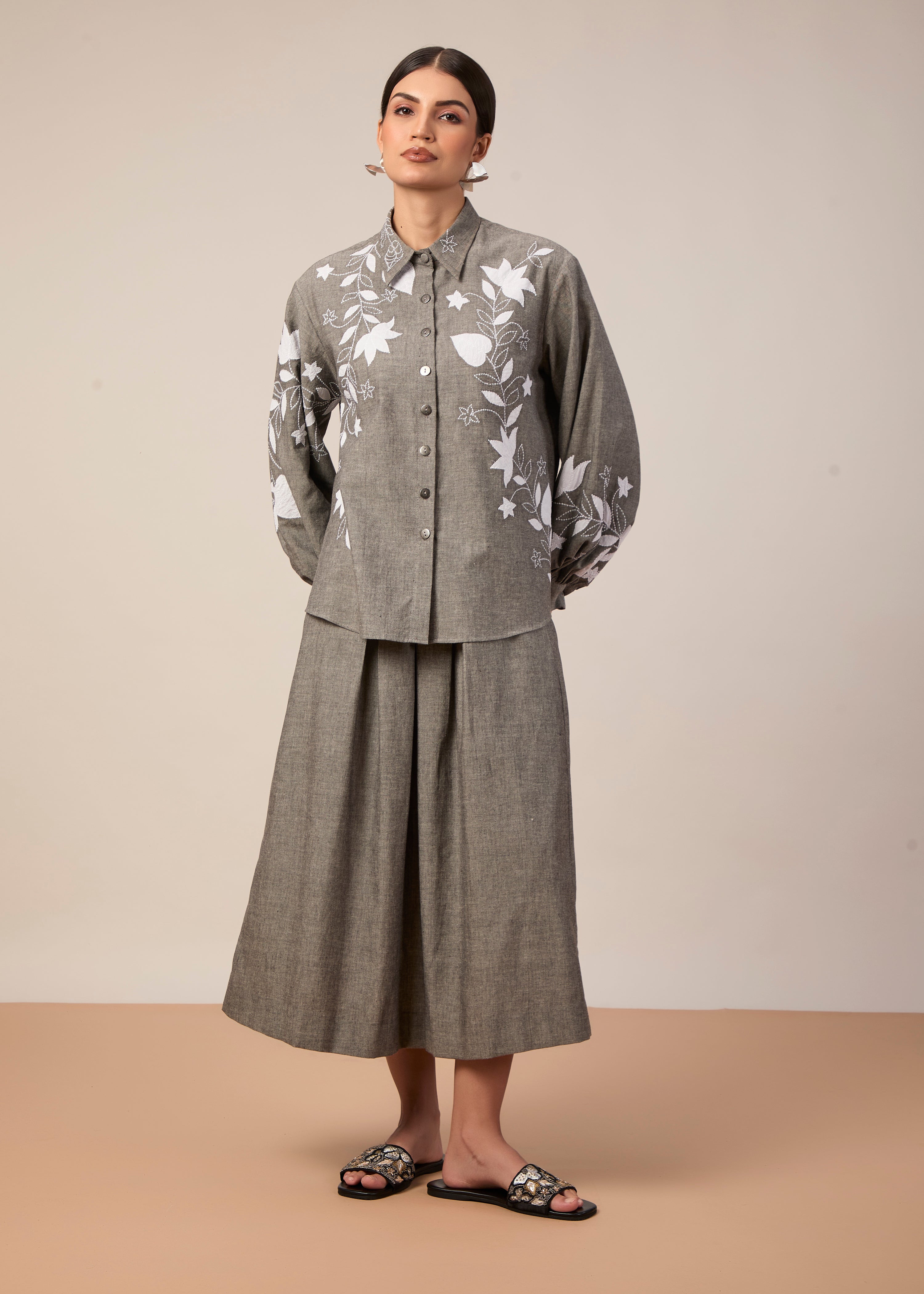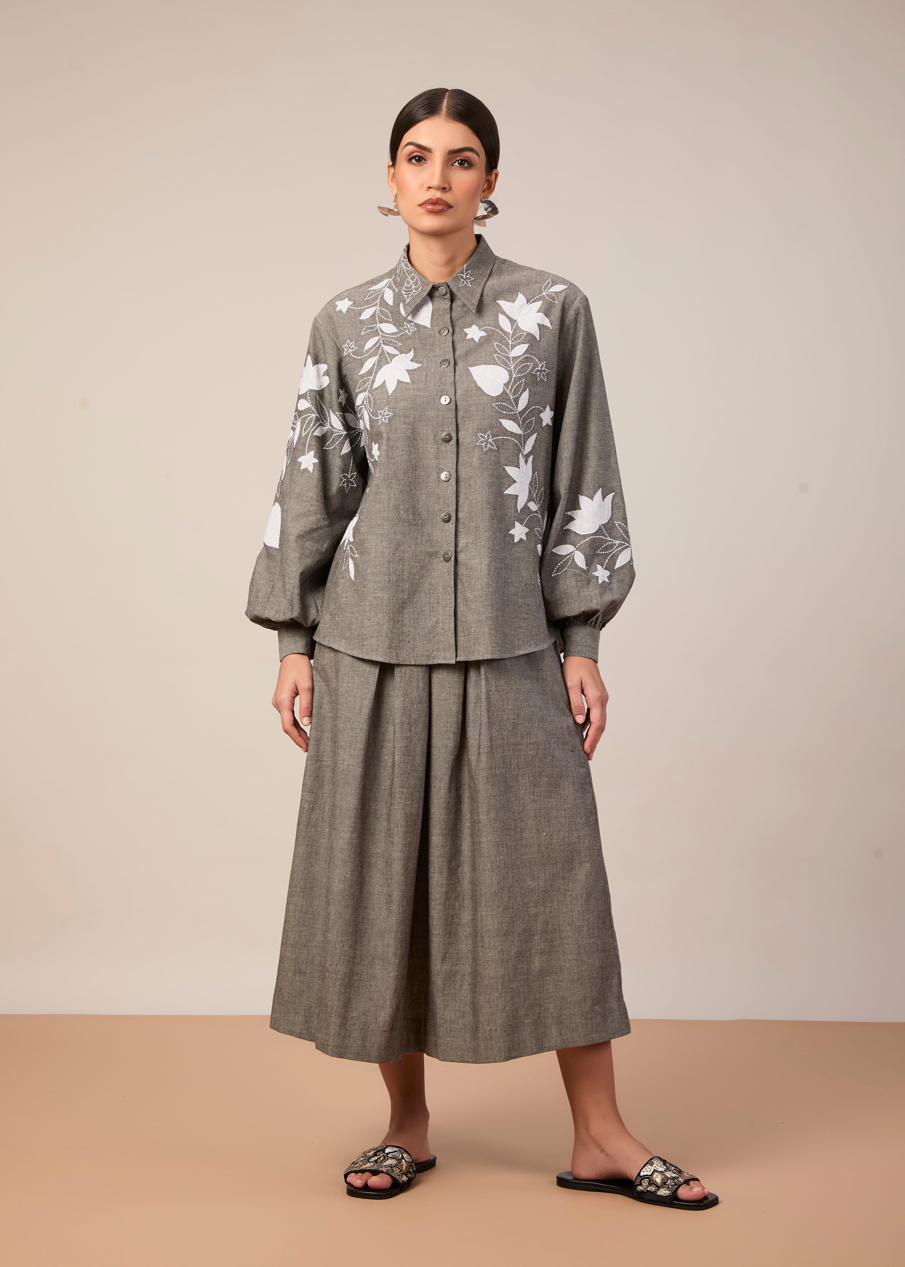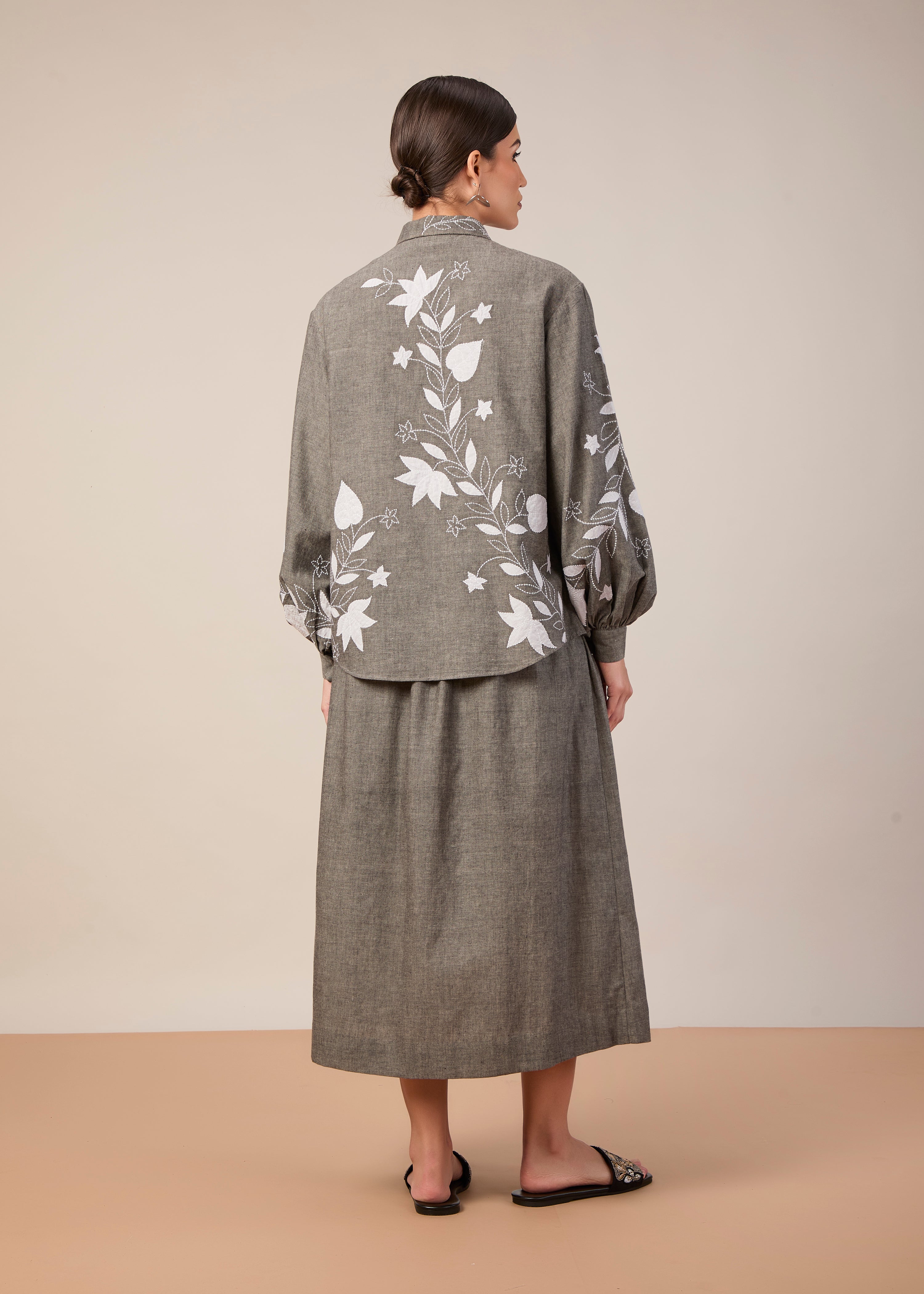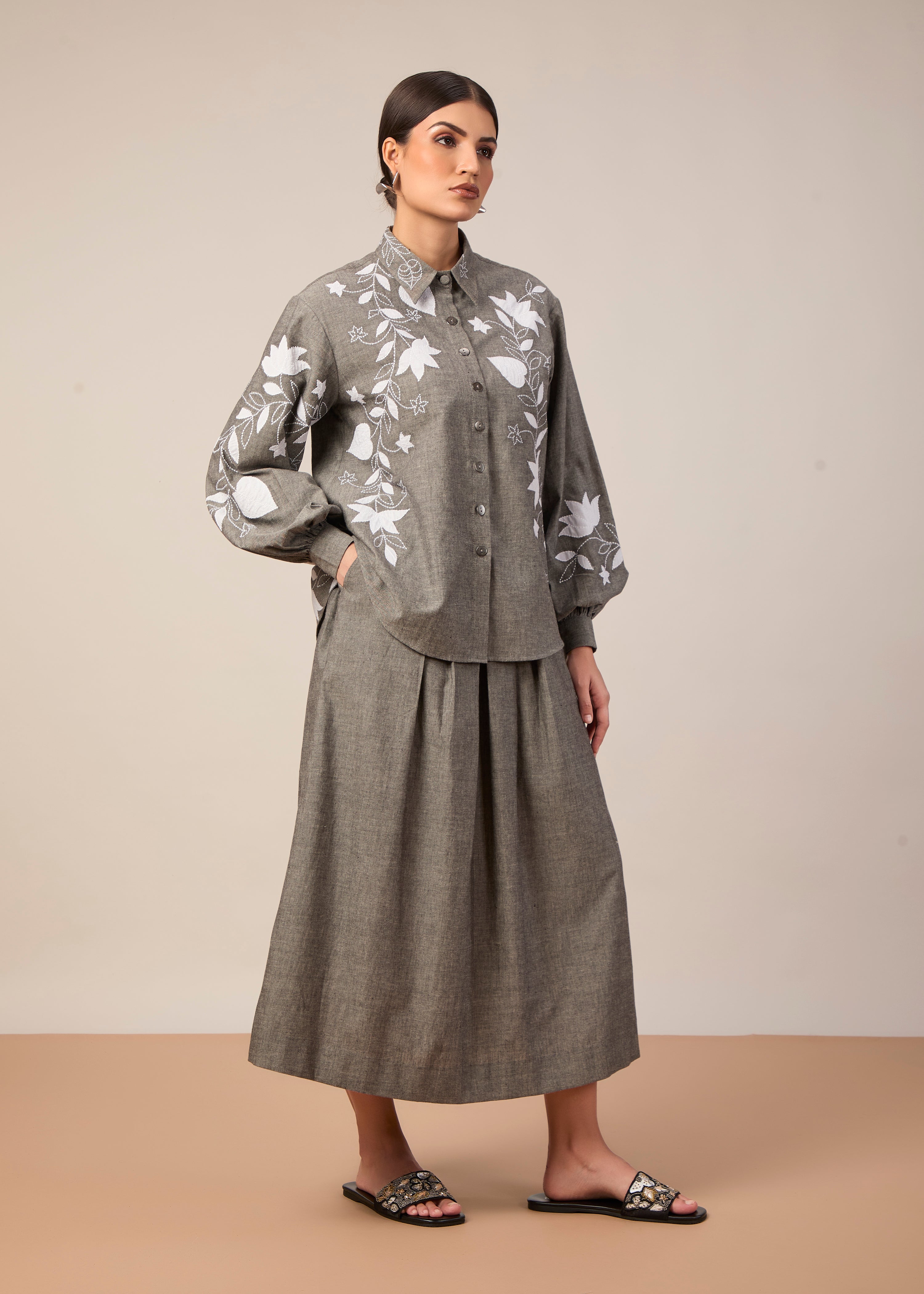 Shirt with white applique embroidery paired with a midi length pleated skirt with pockets. Made in grey handloom cotton, this fabric is luxuriously lightweight, opaque, and flowy.