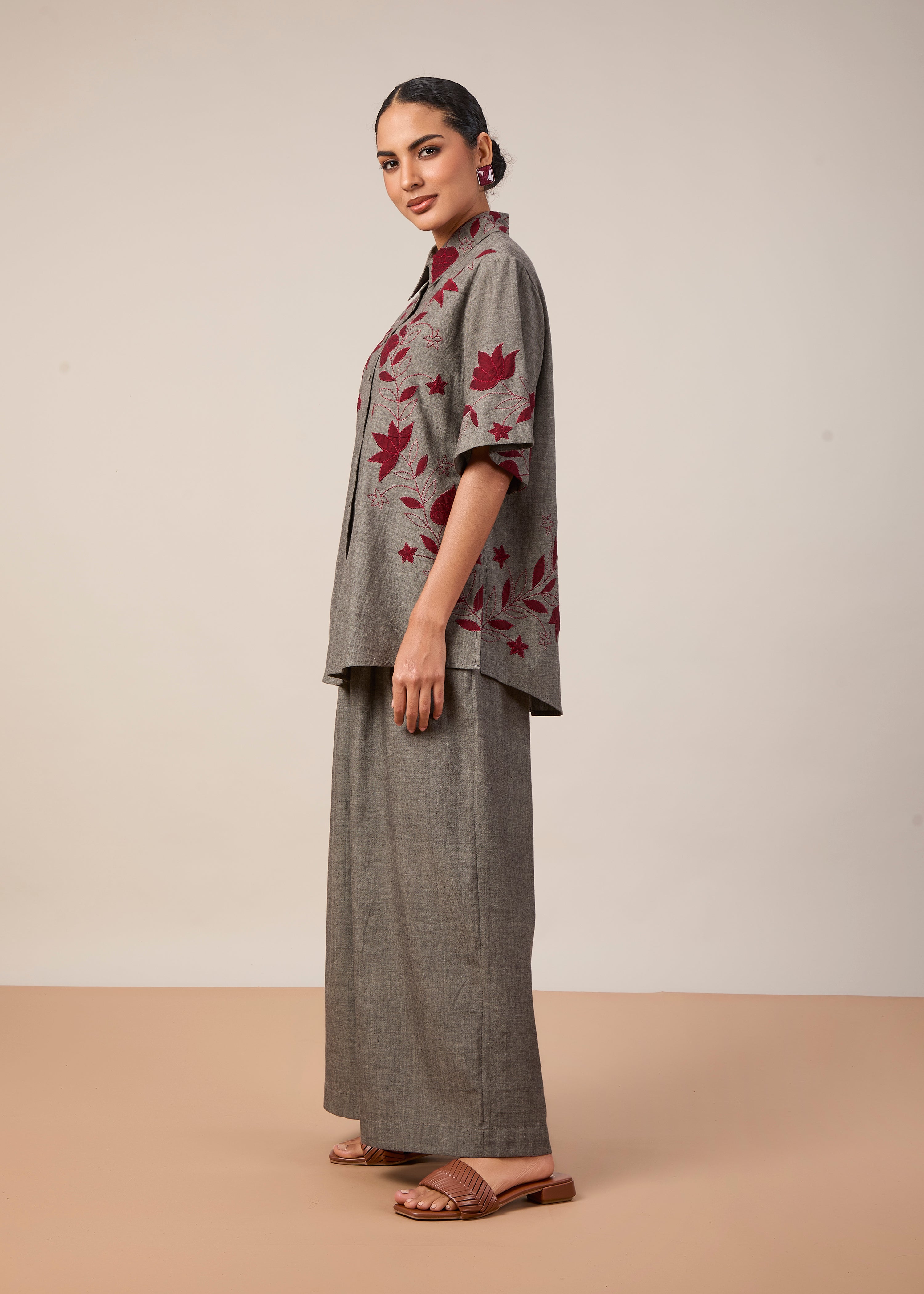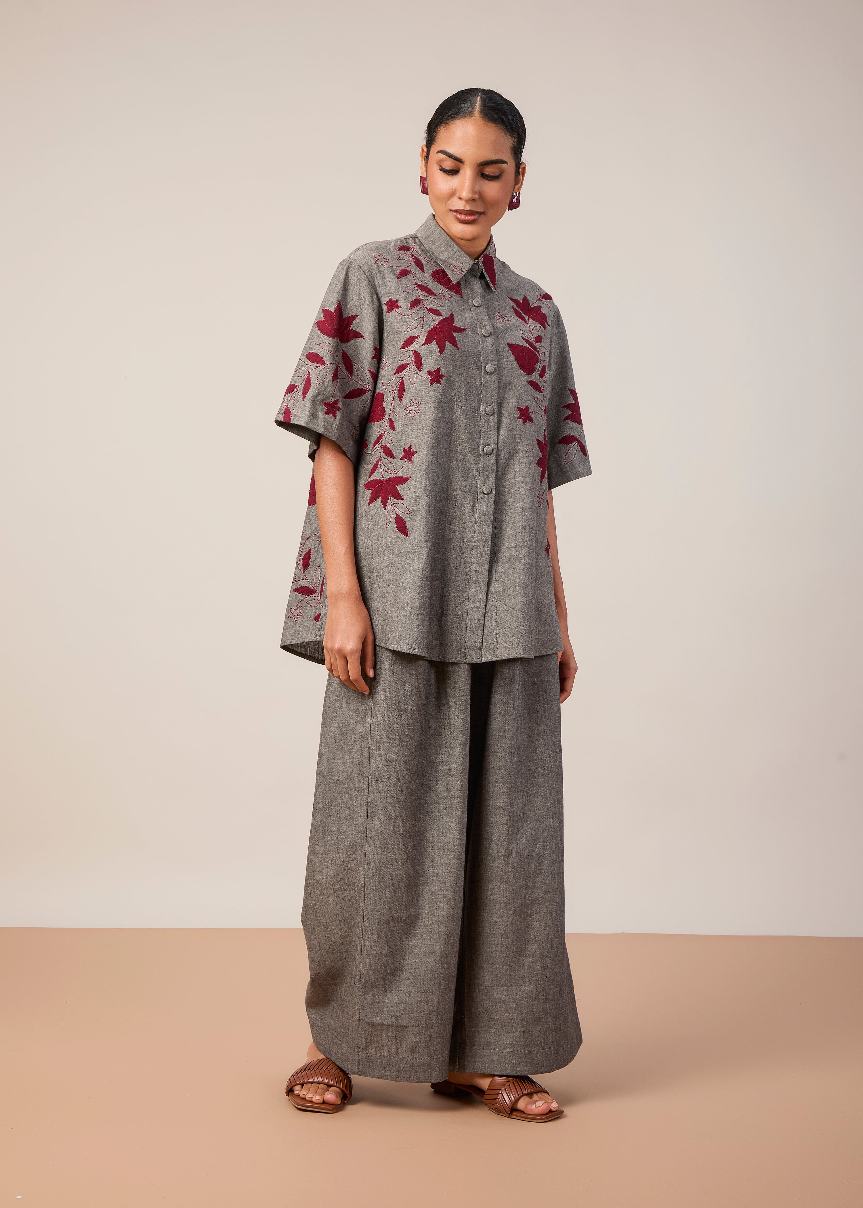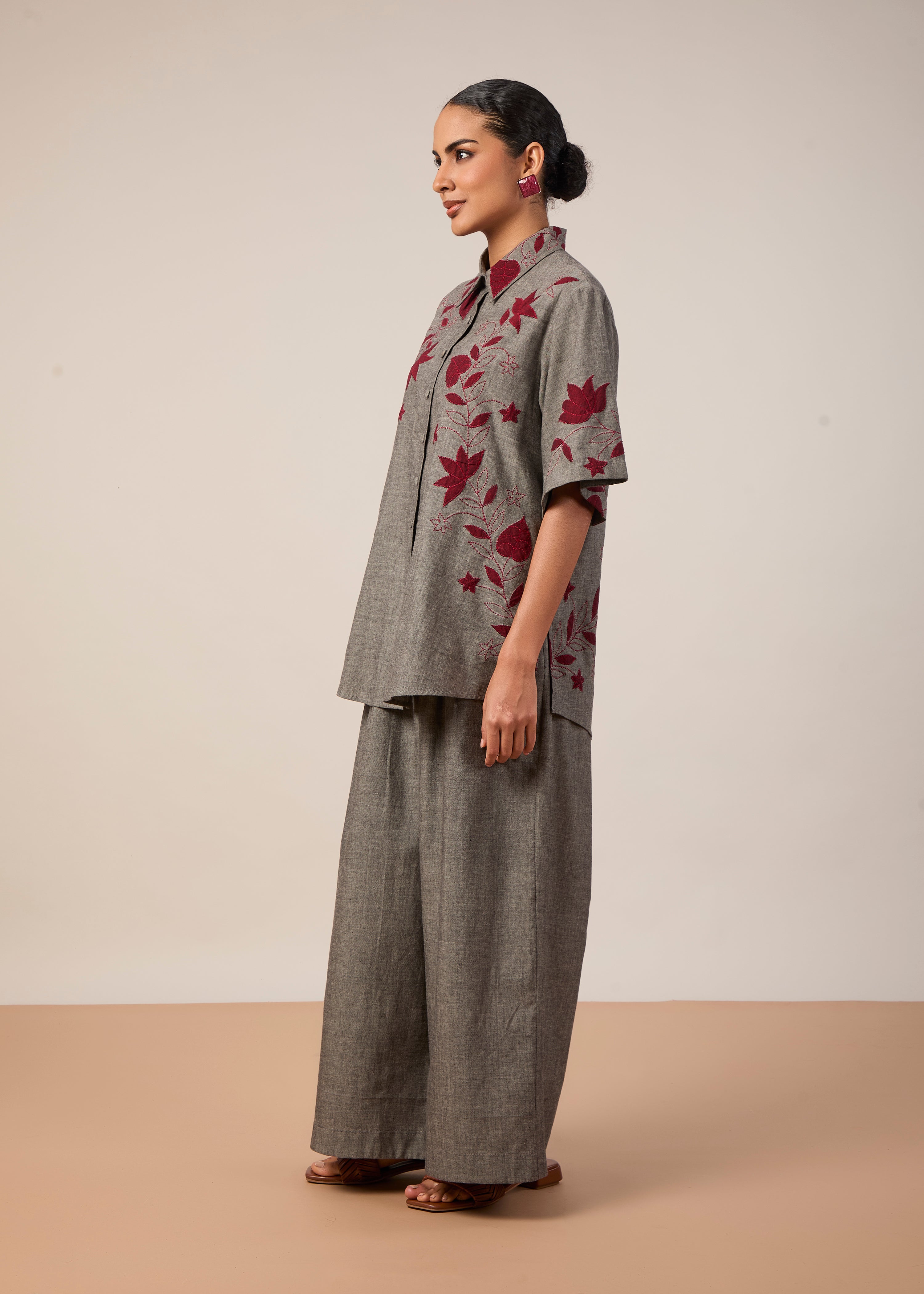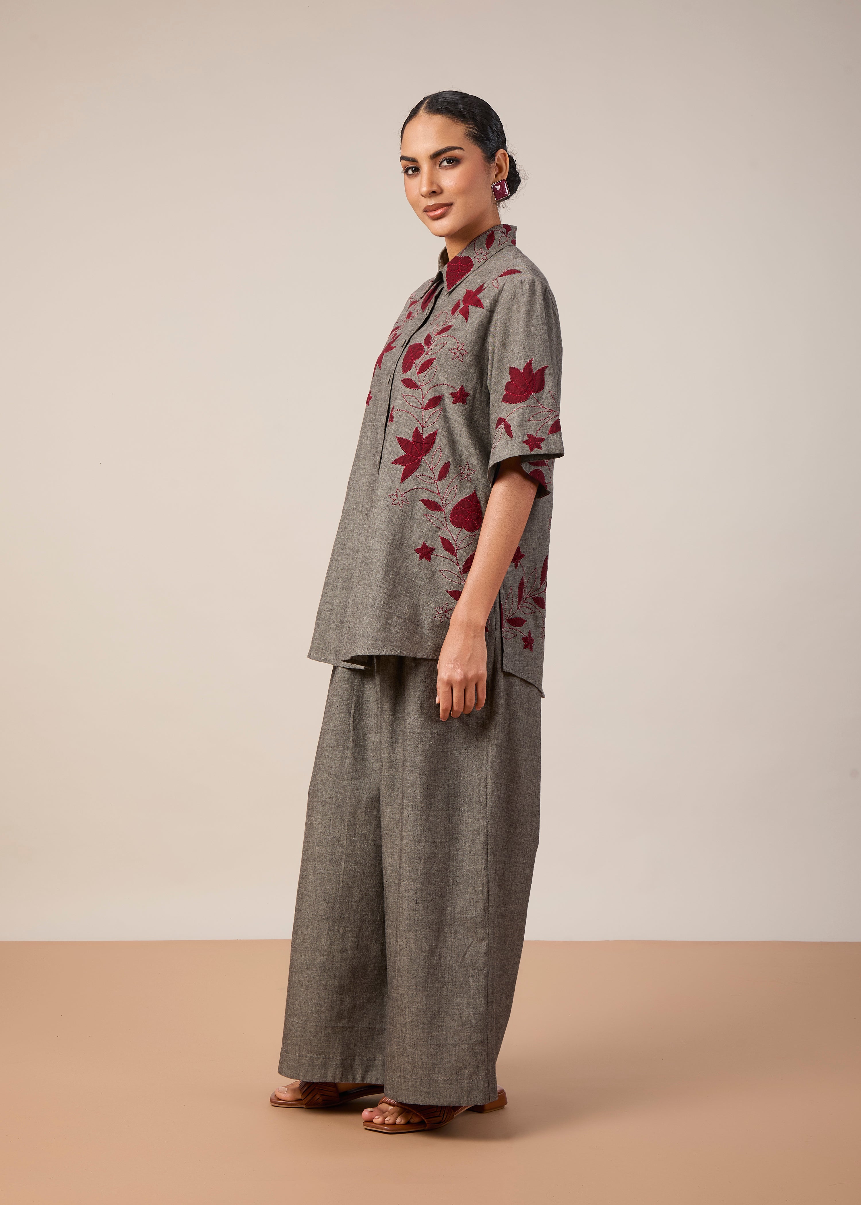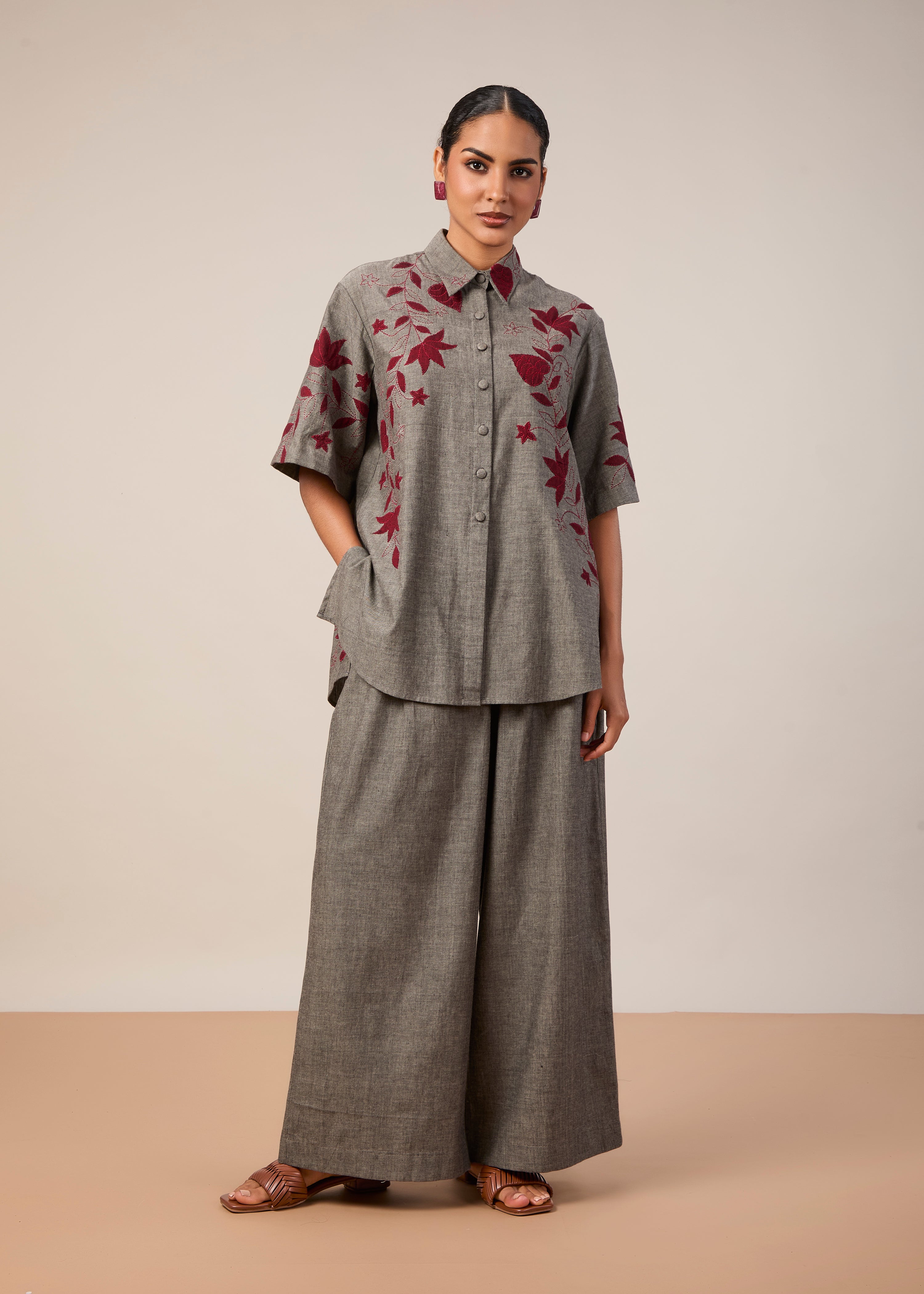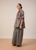 A classic oversize half shirt with applique and threadwork embroidery, paired with wide leg pants with pockets. Made in grey handloom fabric.