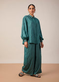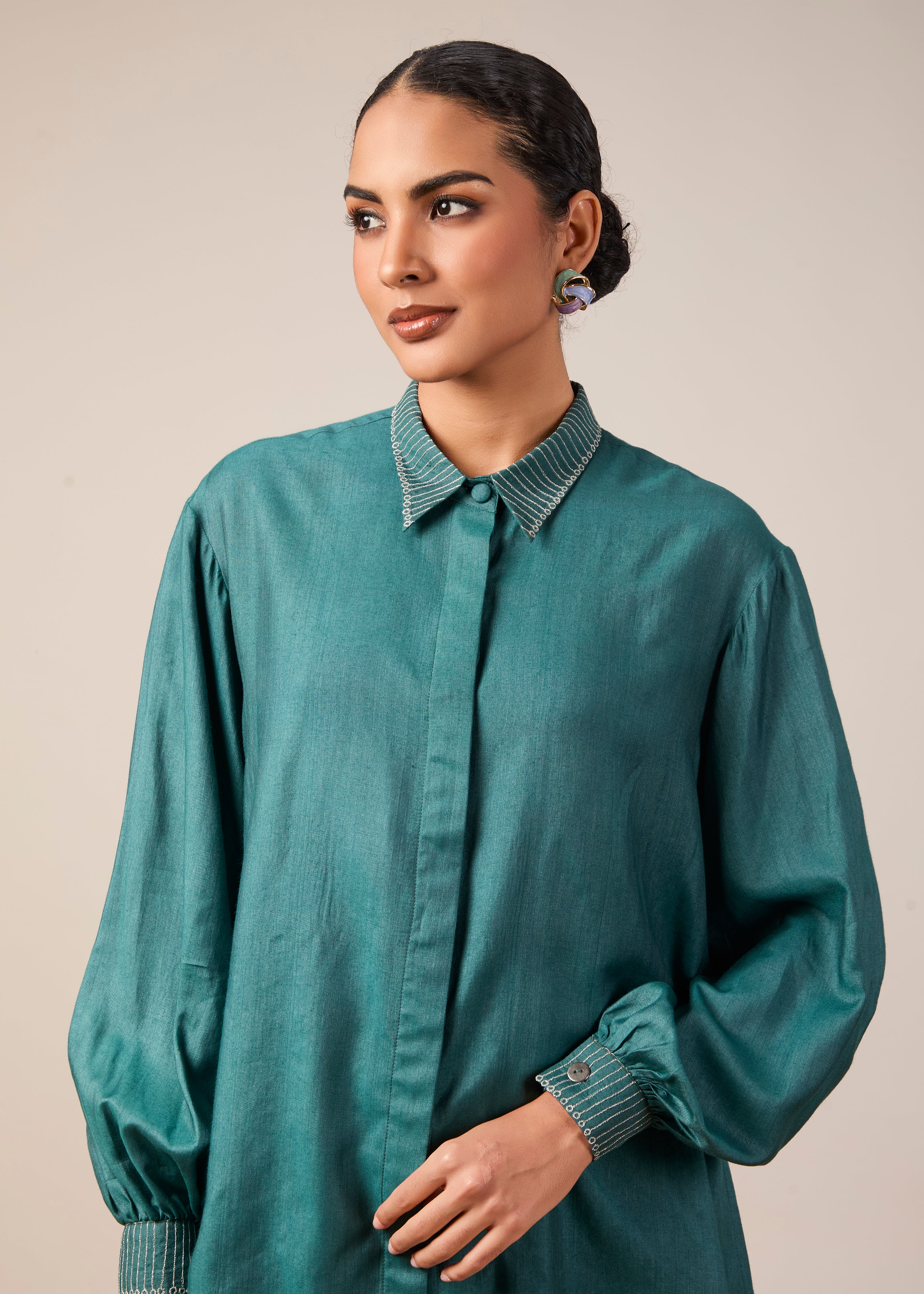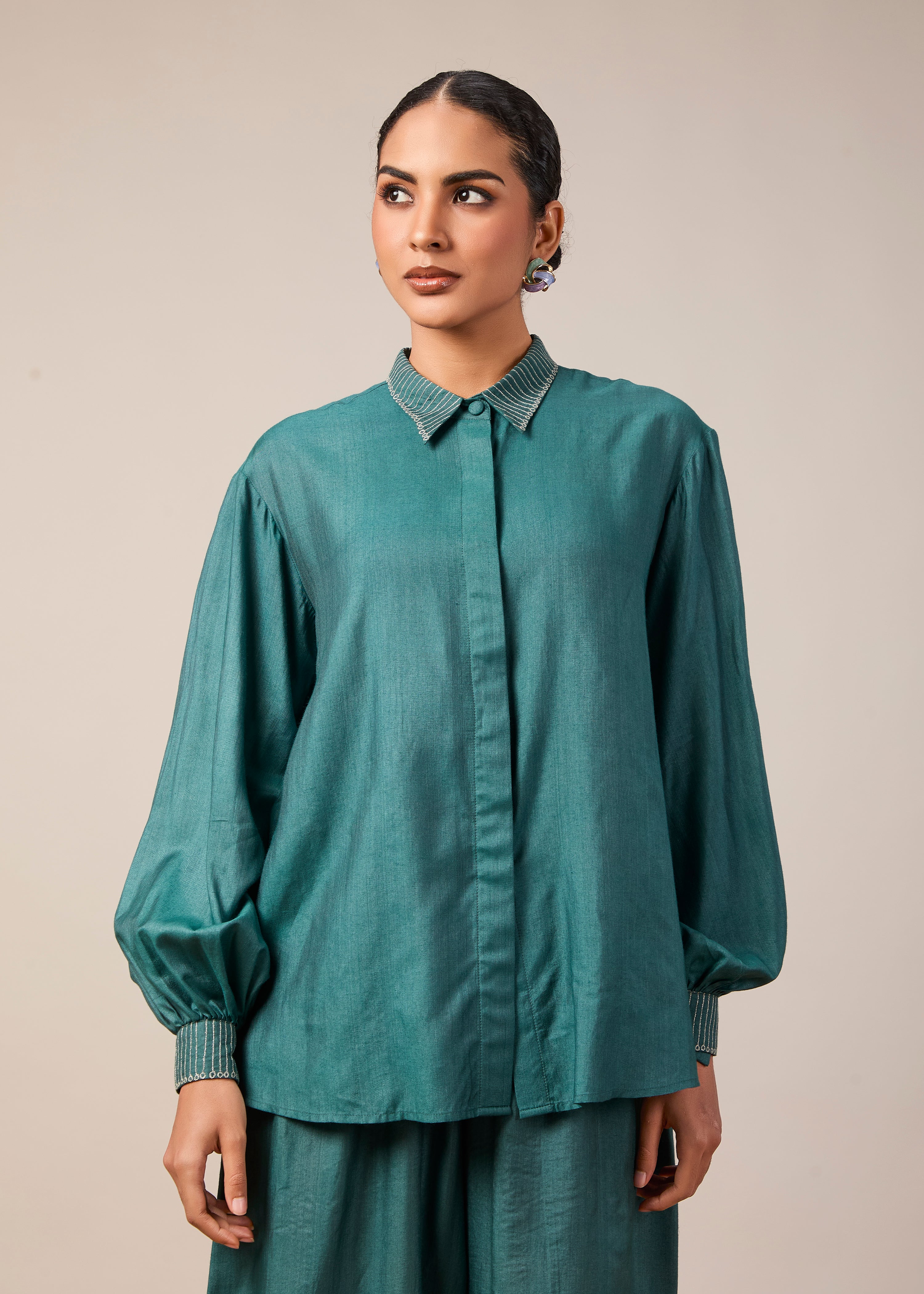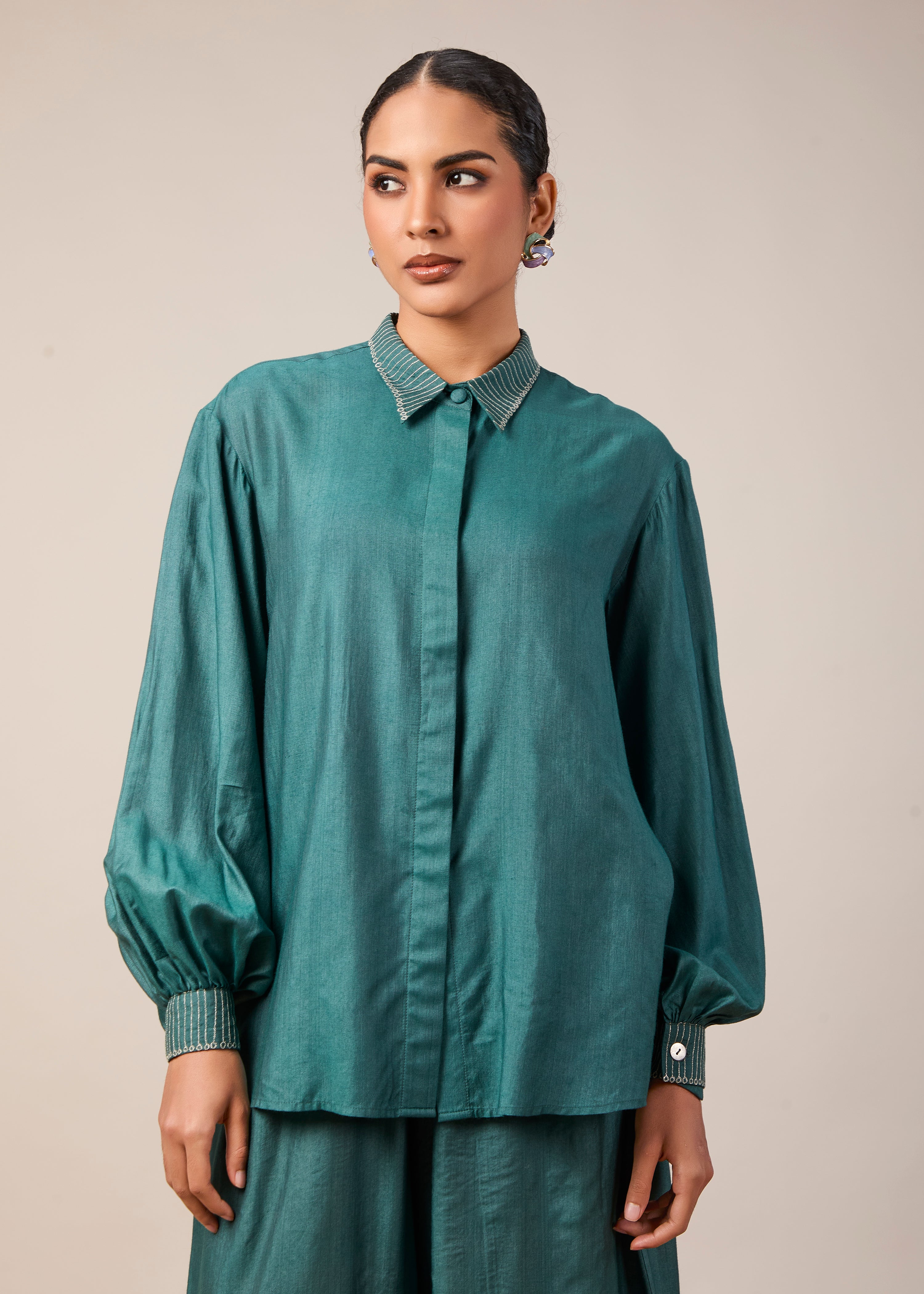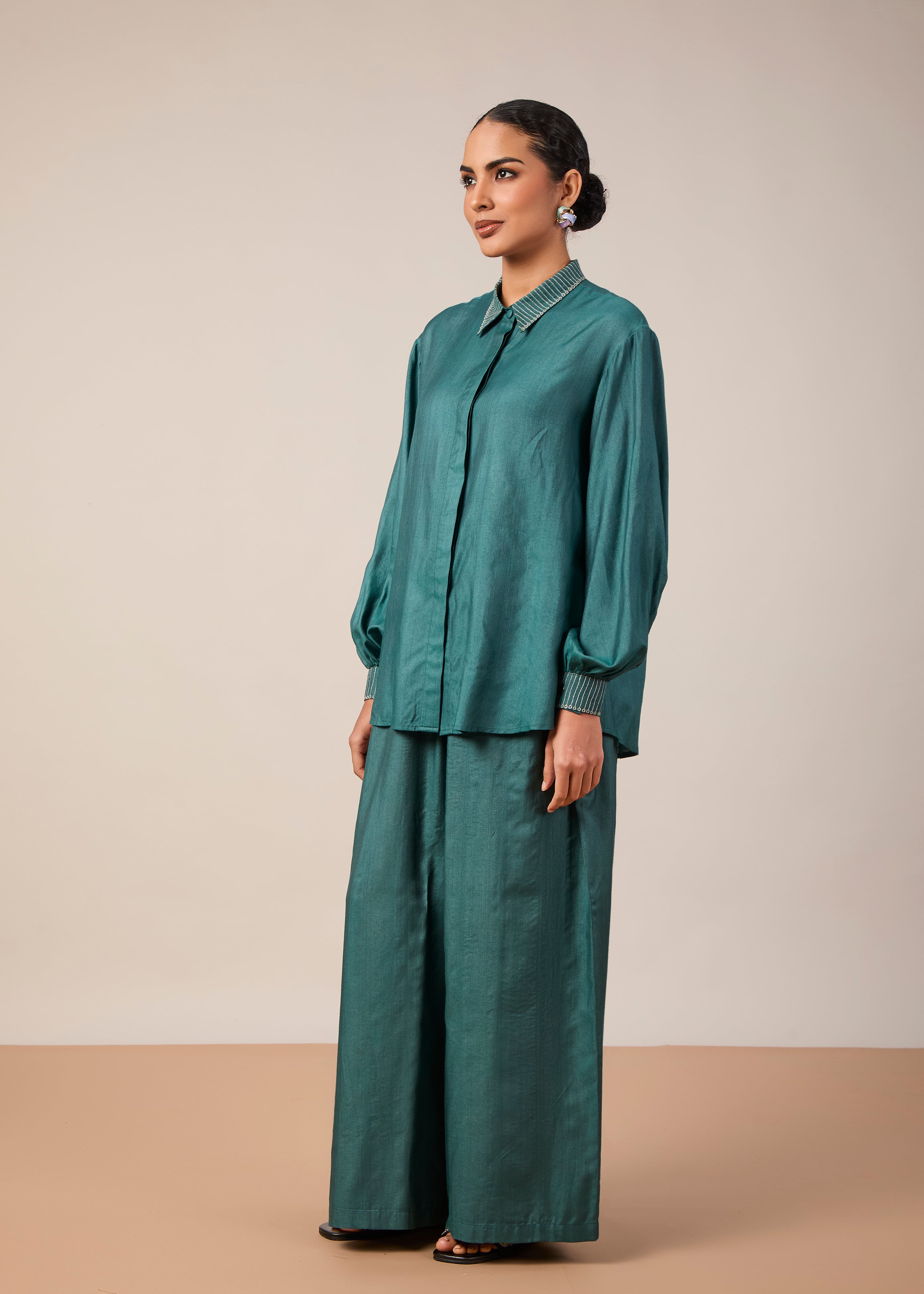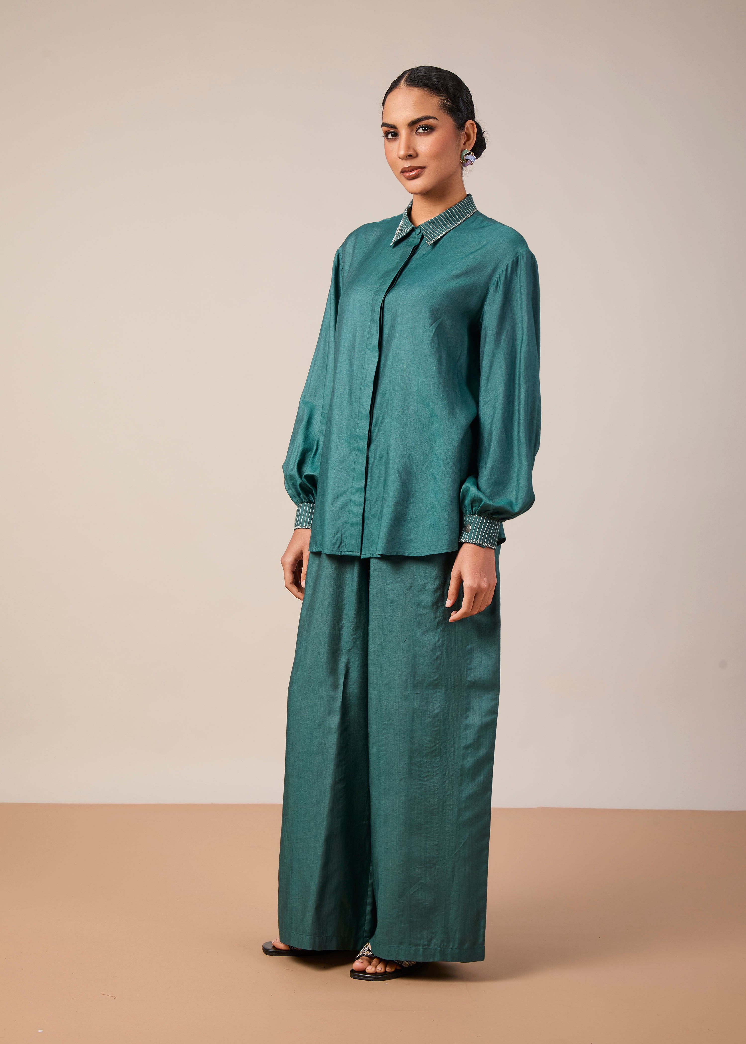 A formal shirt, balloon sleeves with metallic embroidery. Matching wide leg trousers with pockets. Made in all natural silk that drapes luxuriously on the body.