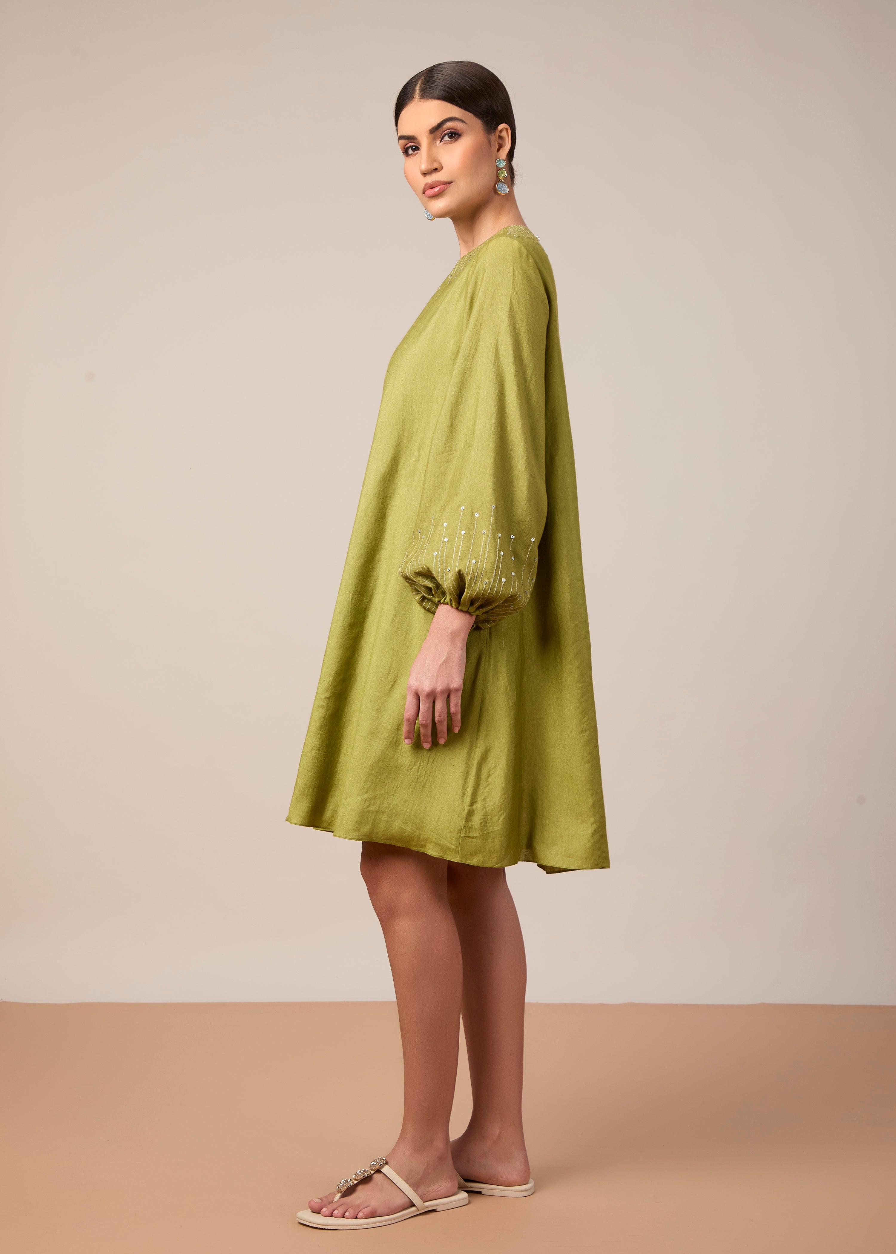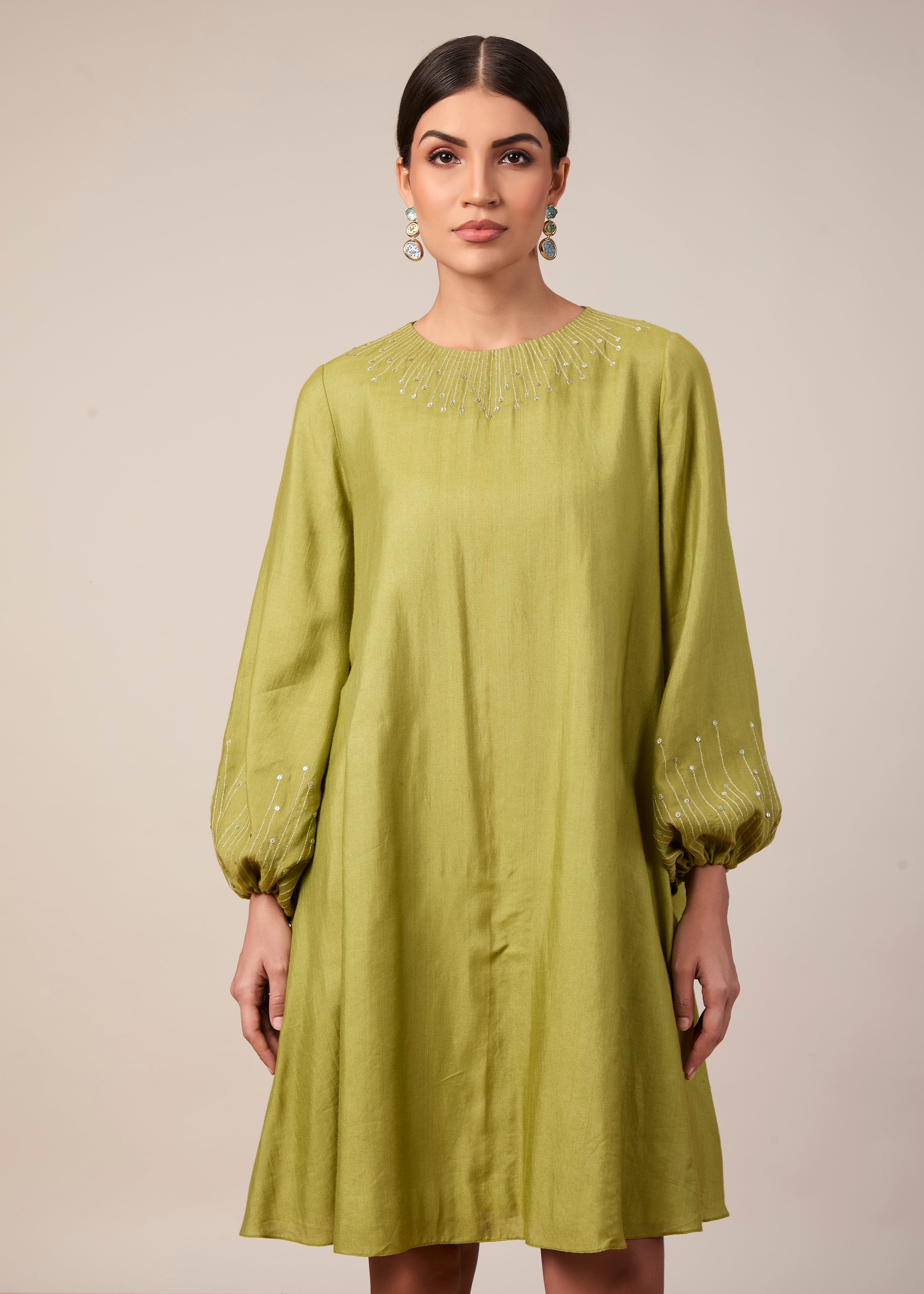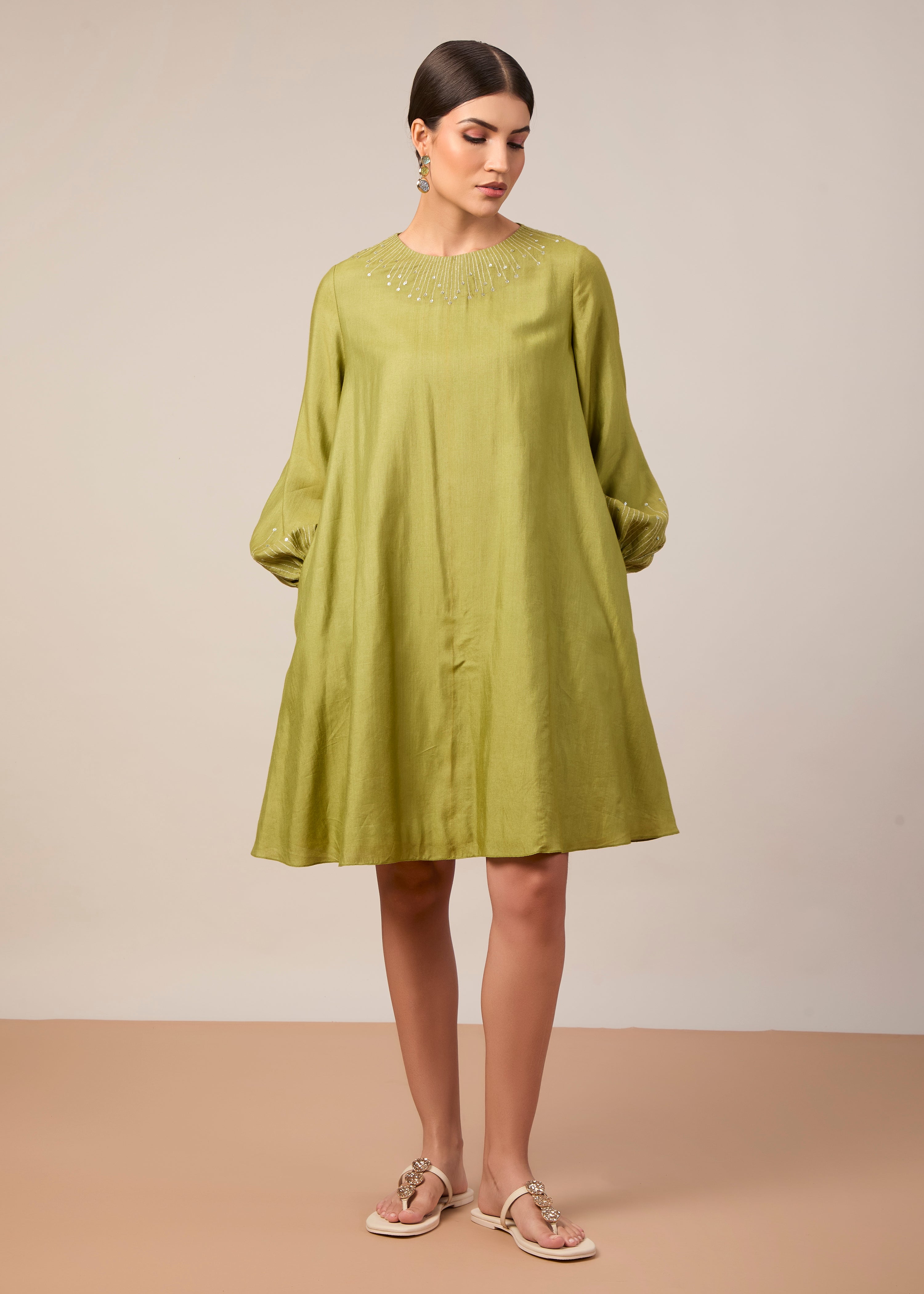 A flare dress with silver sunrays embroidery around the neckline and sleeves. Made in all natureal silk blens with side pockets and organza lining.