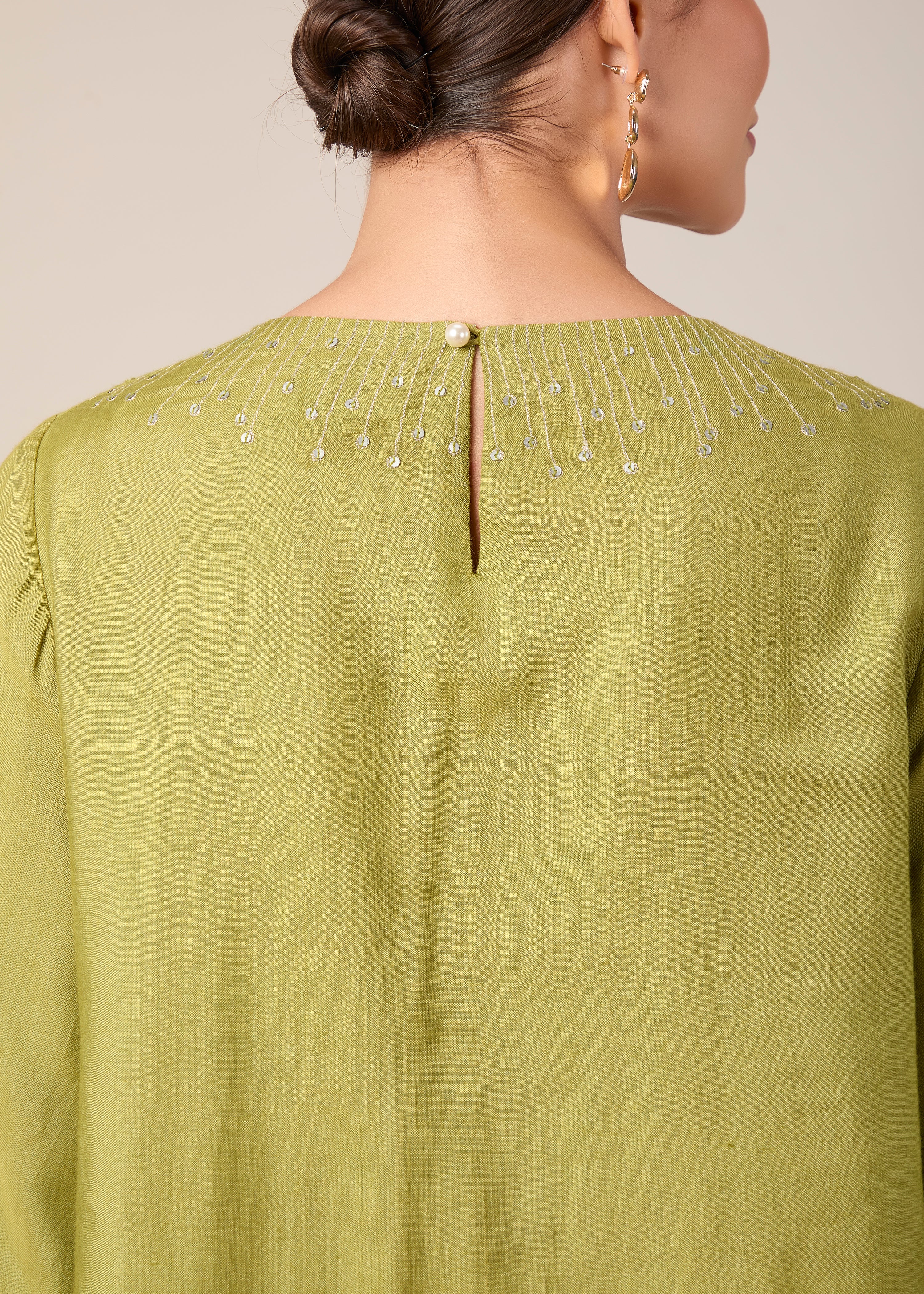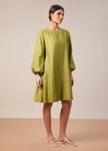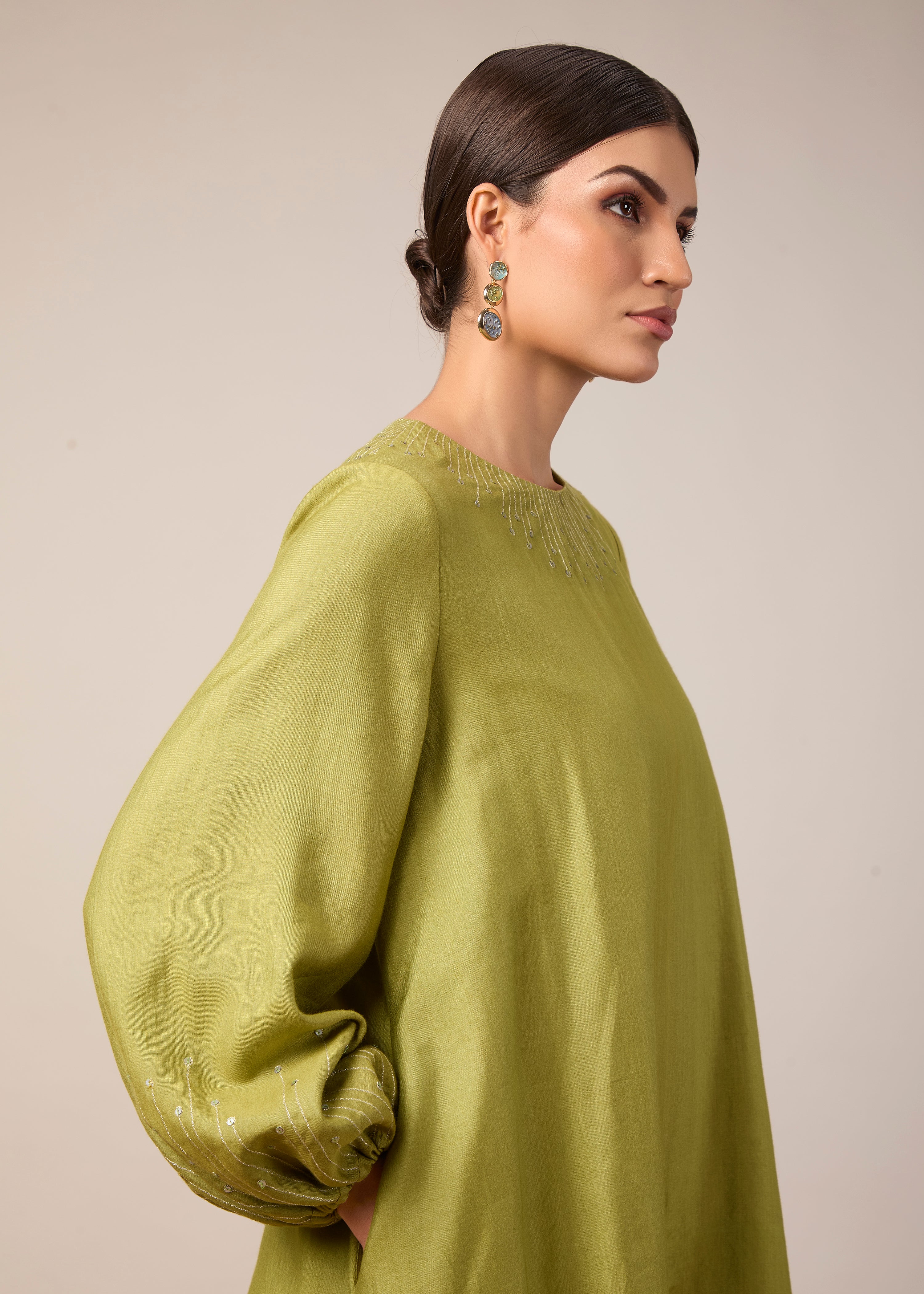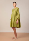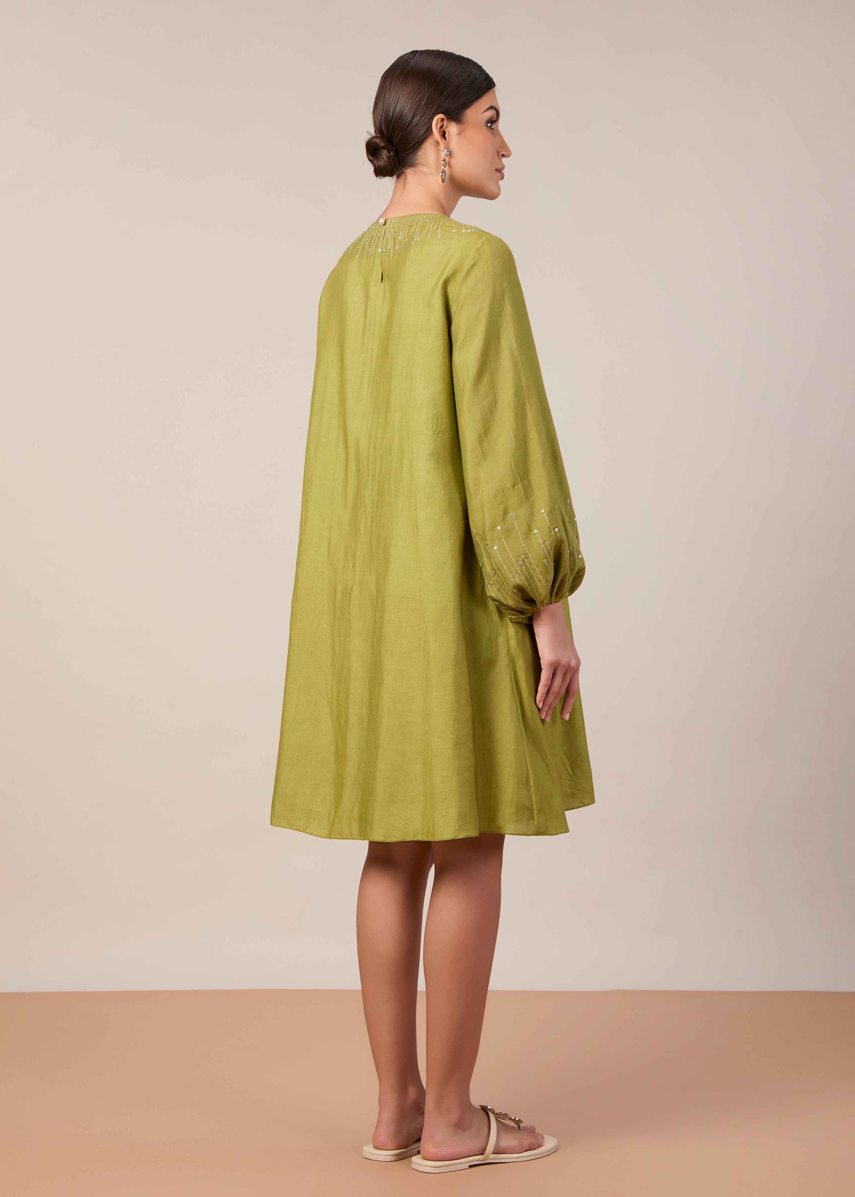 A flare dress with silver sunrays embroidery around the neckline and sleeves. Made in all natureal silk blens with side pockets and organza lining.