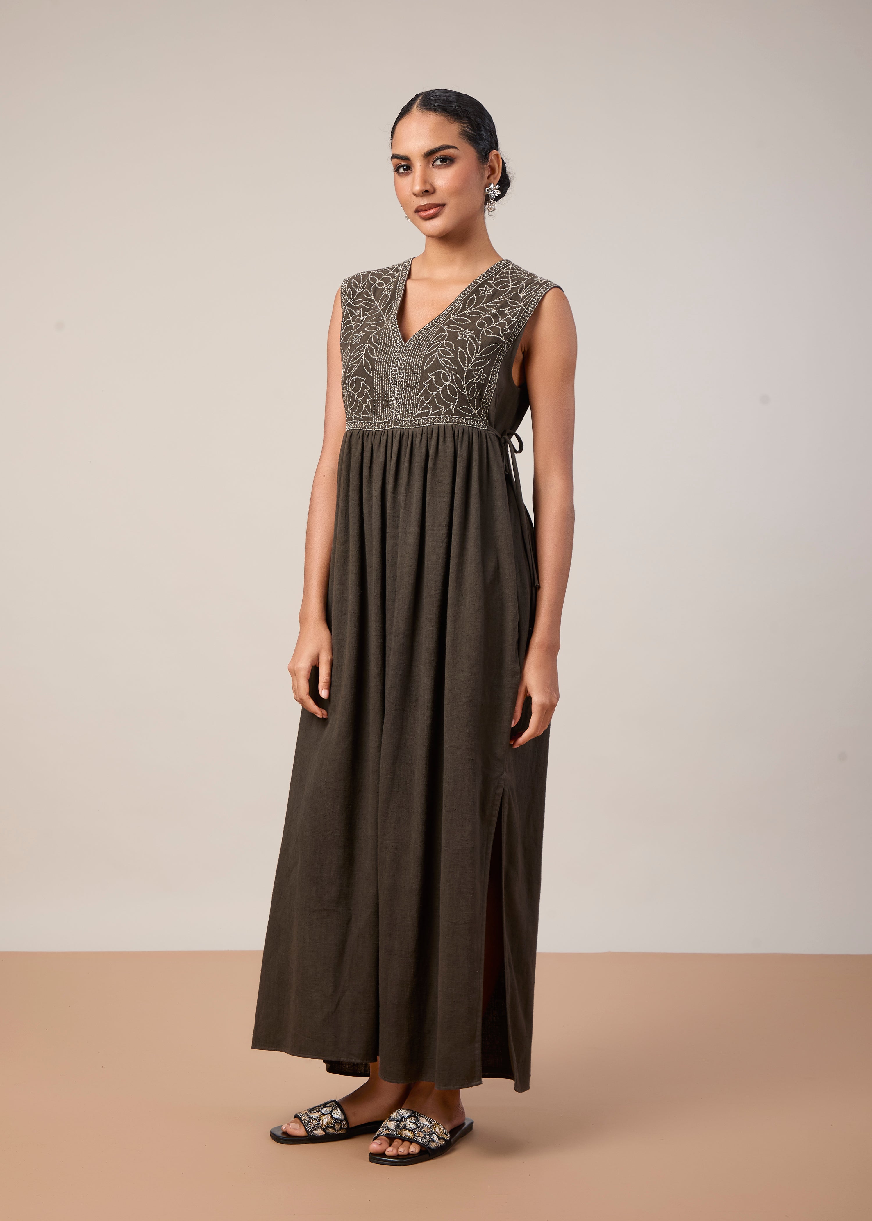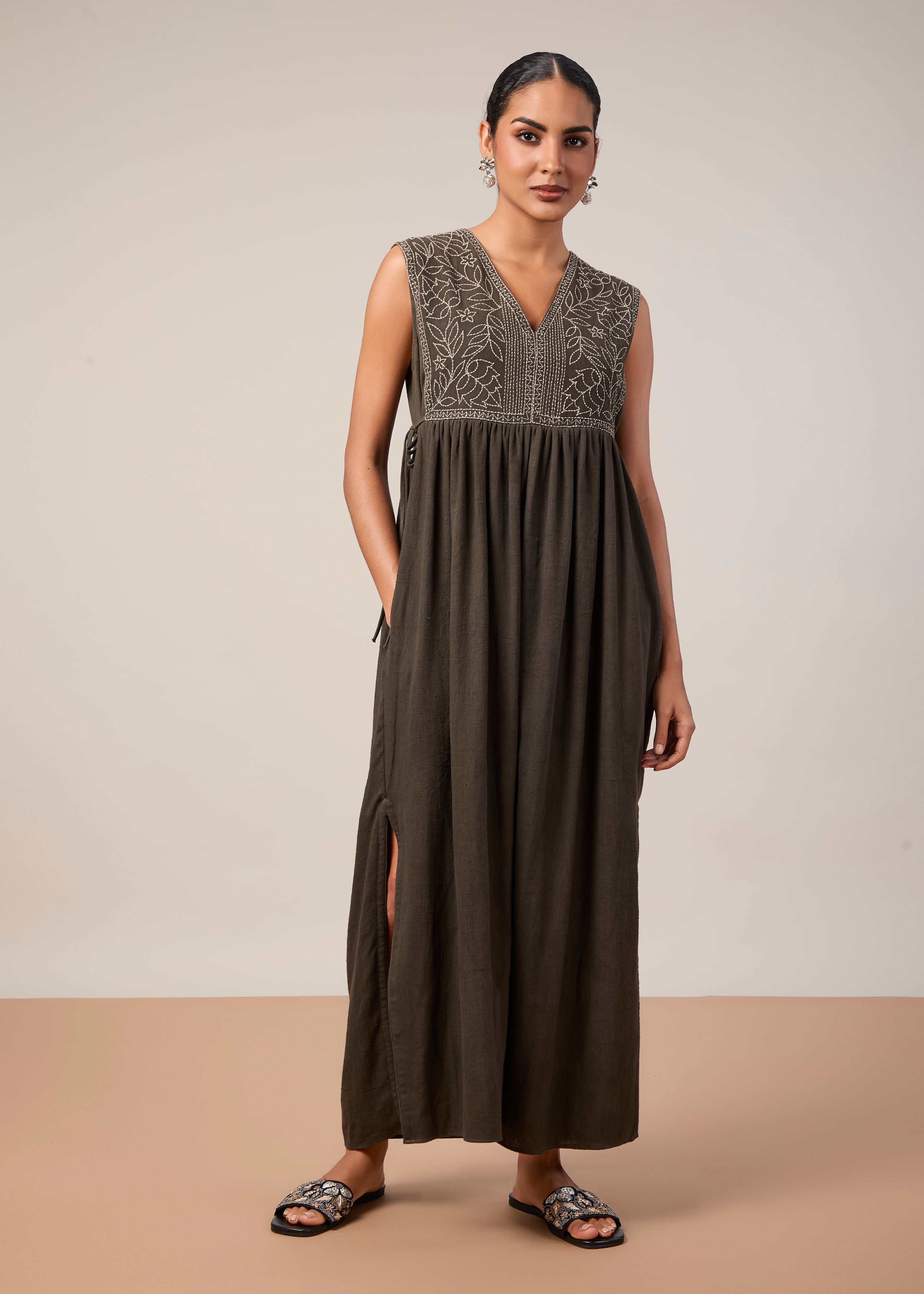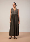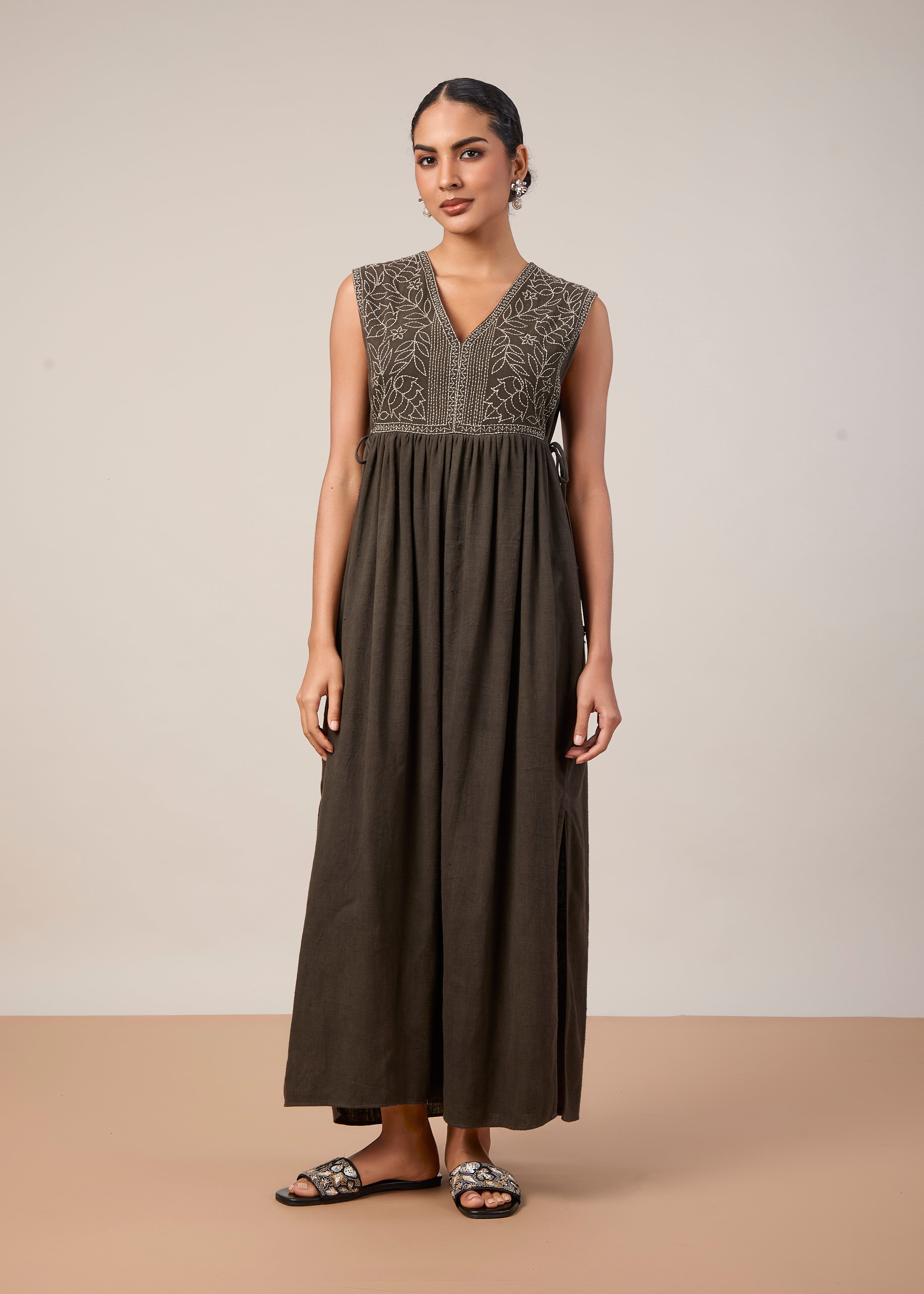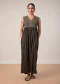 A gathered sheath dress with silver thread embroidered bodice and side pockets. Made in natural dyed handloom khadi.