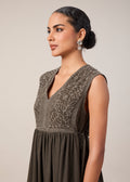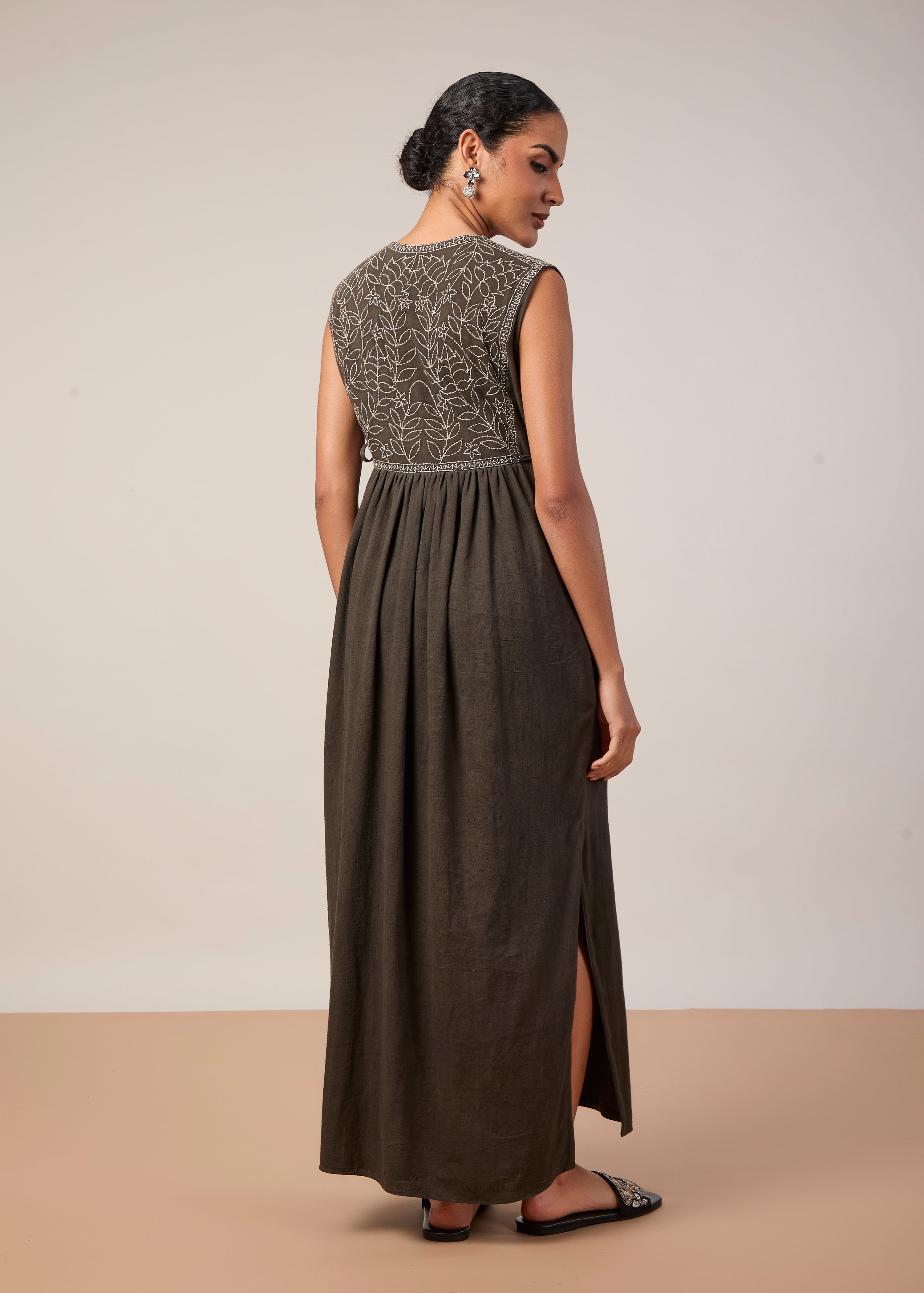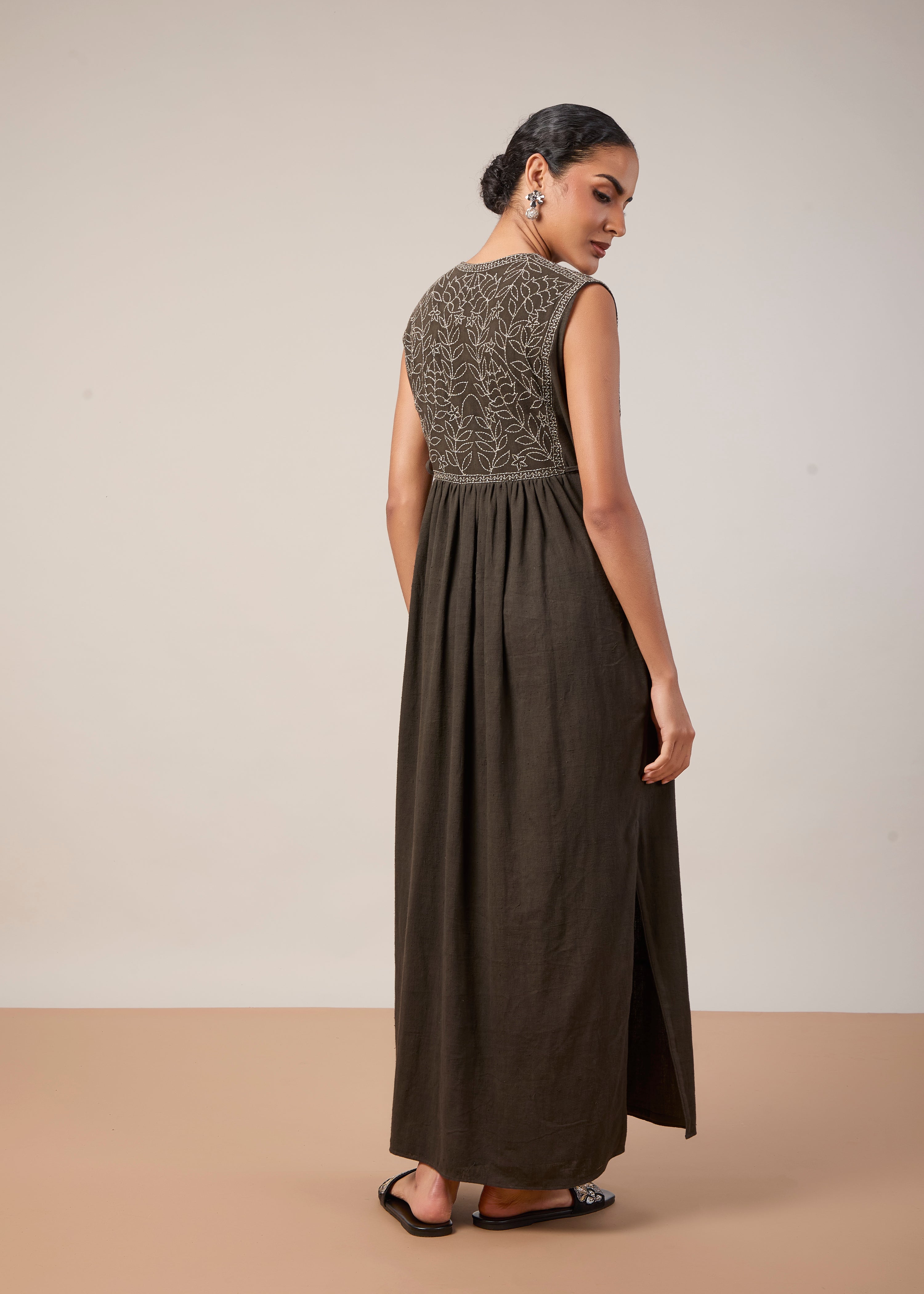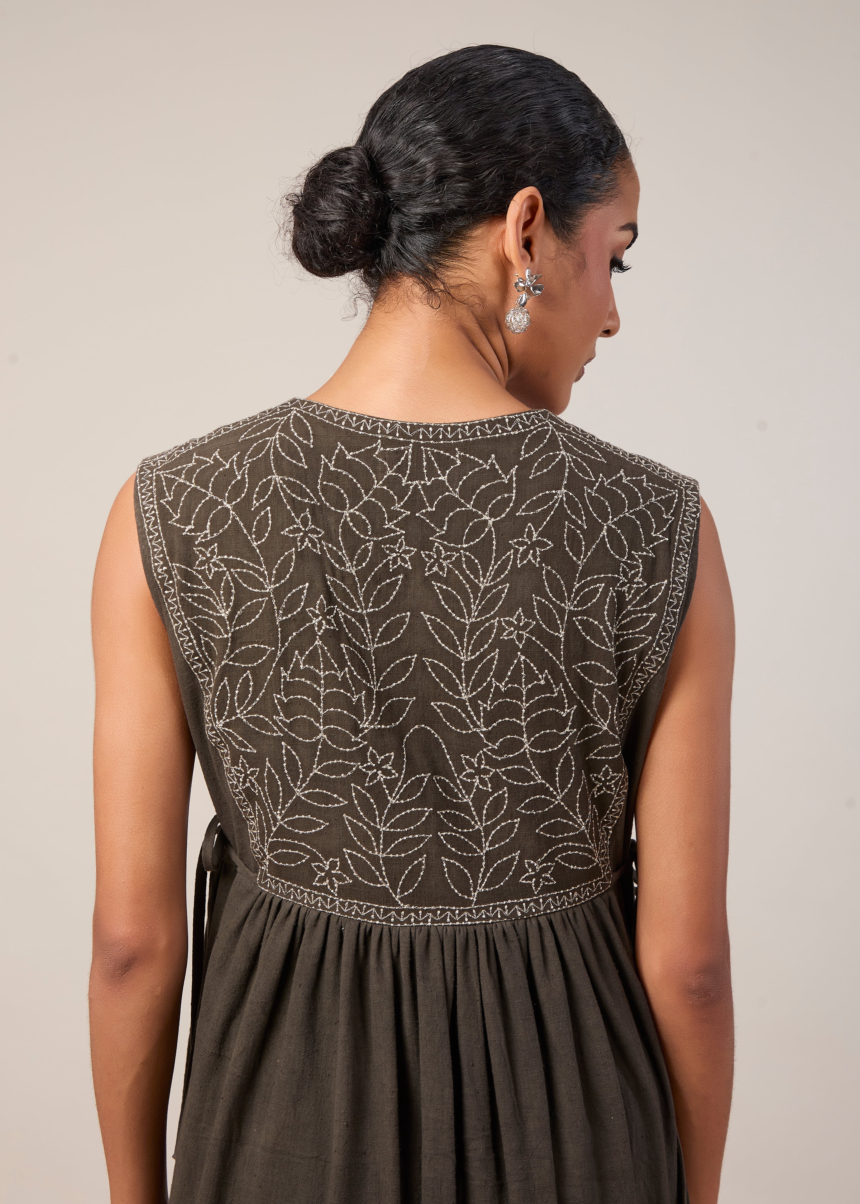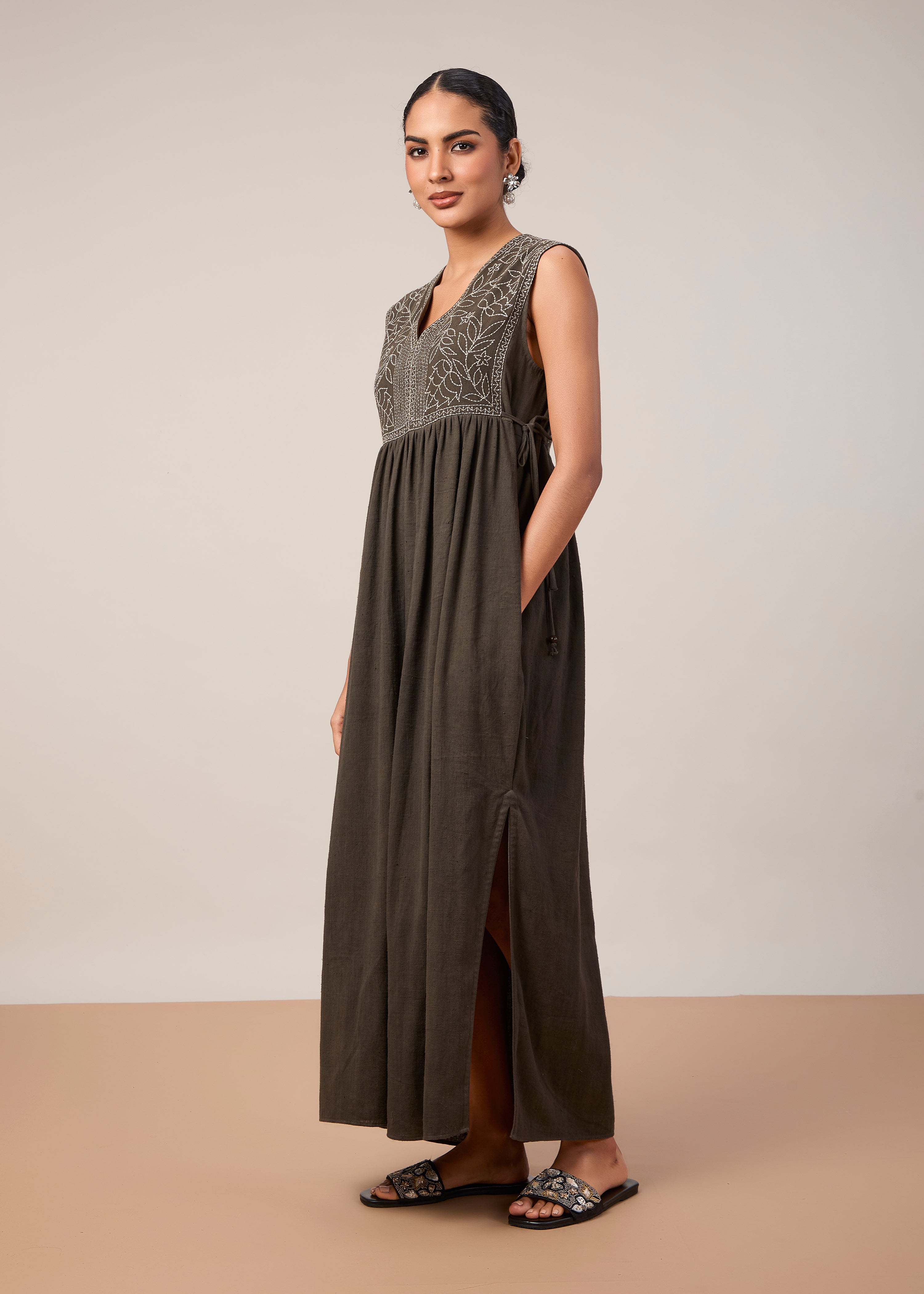 A gathered sheath dress with silver thread embroidered bodice and side pockets. Made in natural dyed handloom khadi.