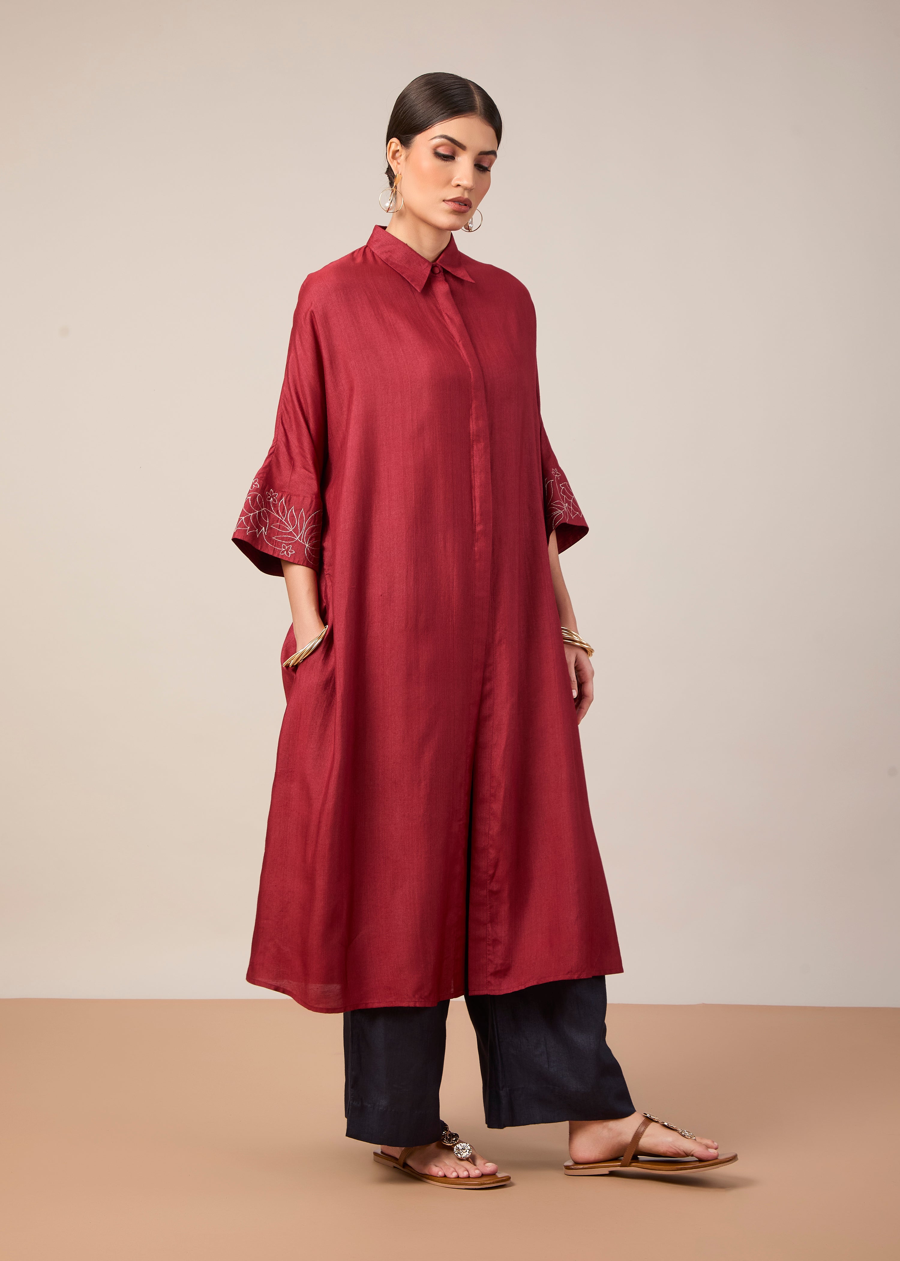 A minimal-style formal long kurta with side pockets and silver metallic embroidery. Made in all natural silk blend, this fabric drapes the body luxuriously.