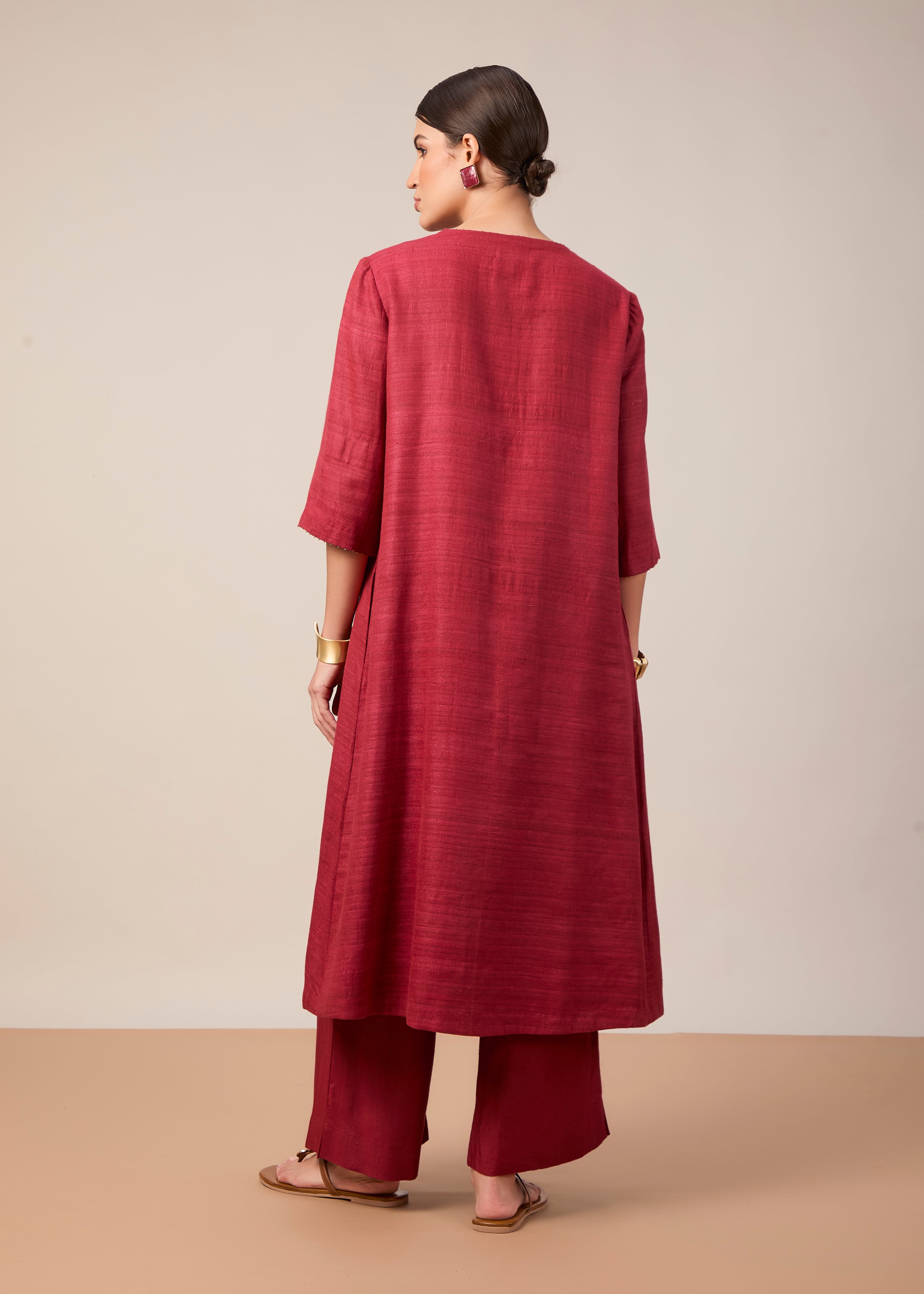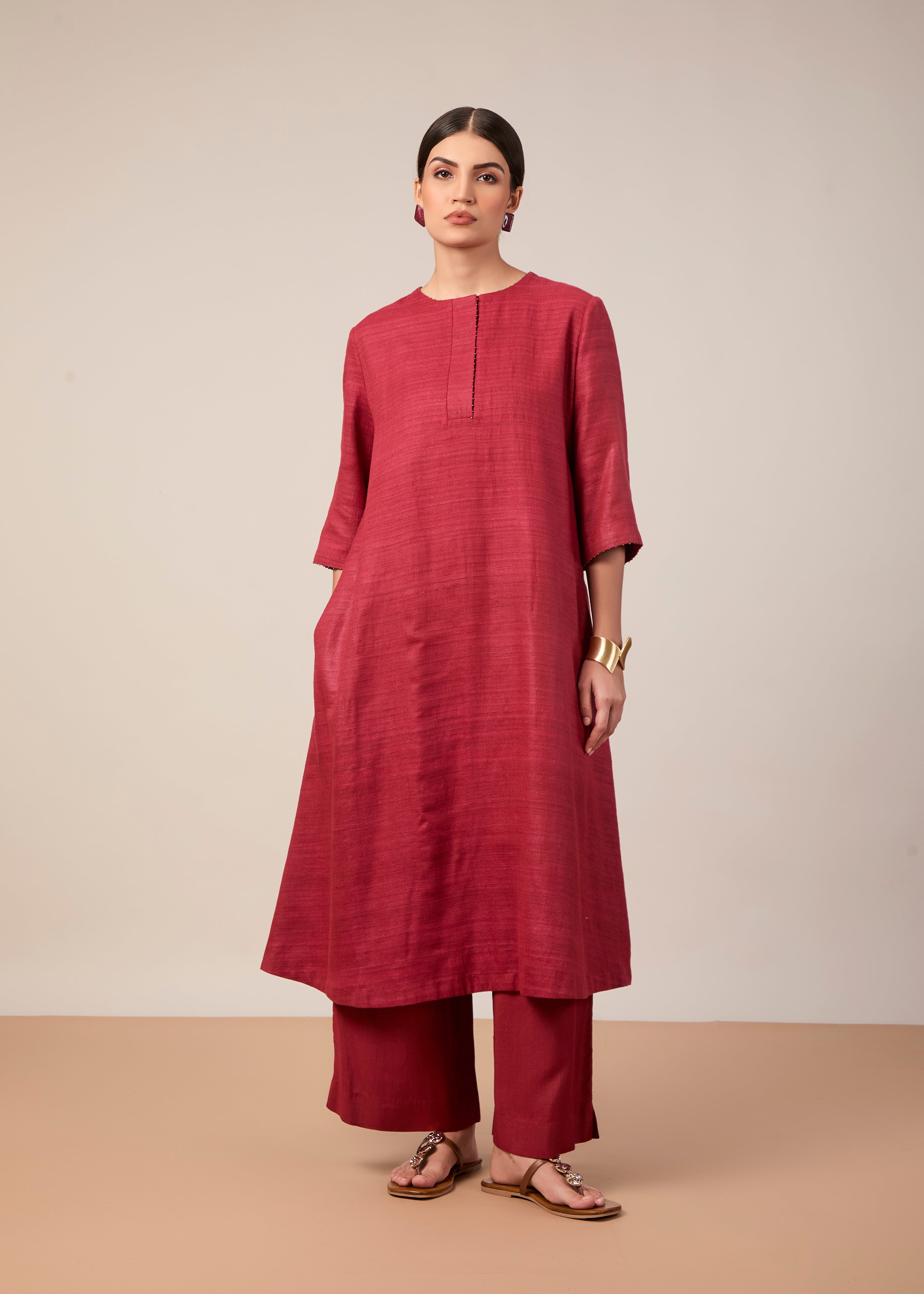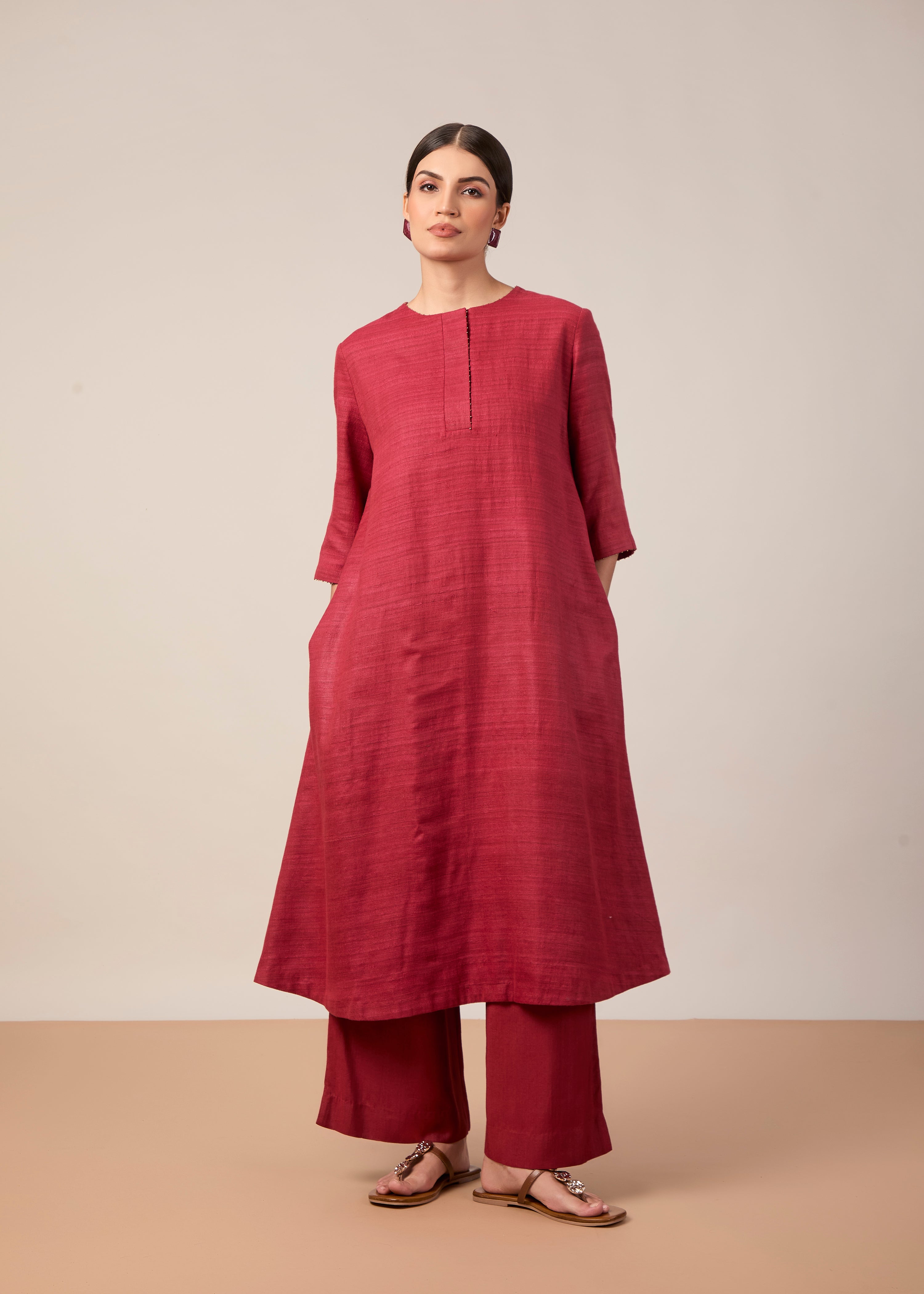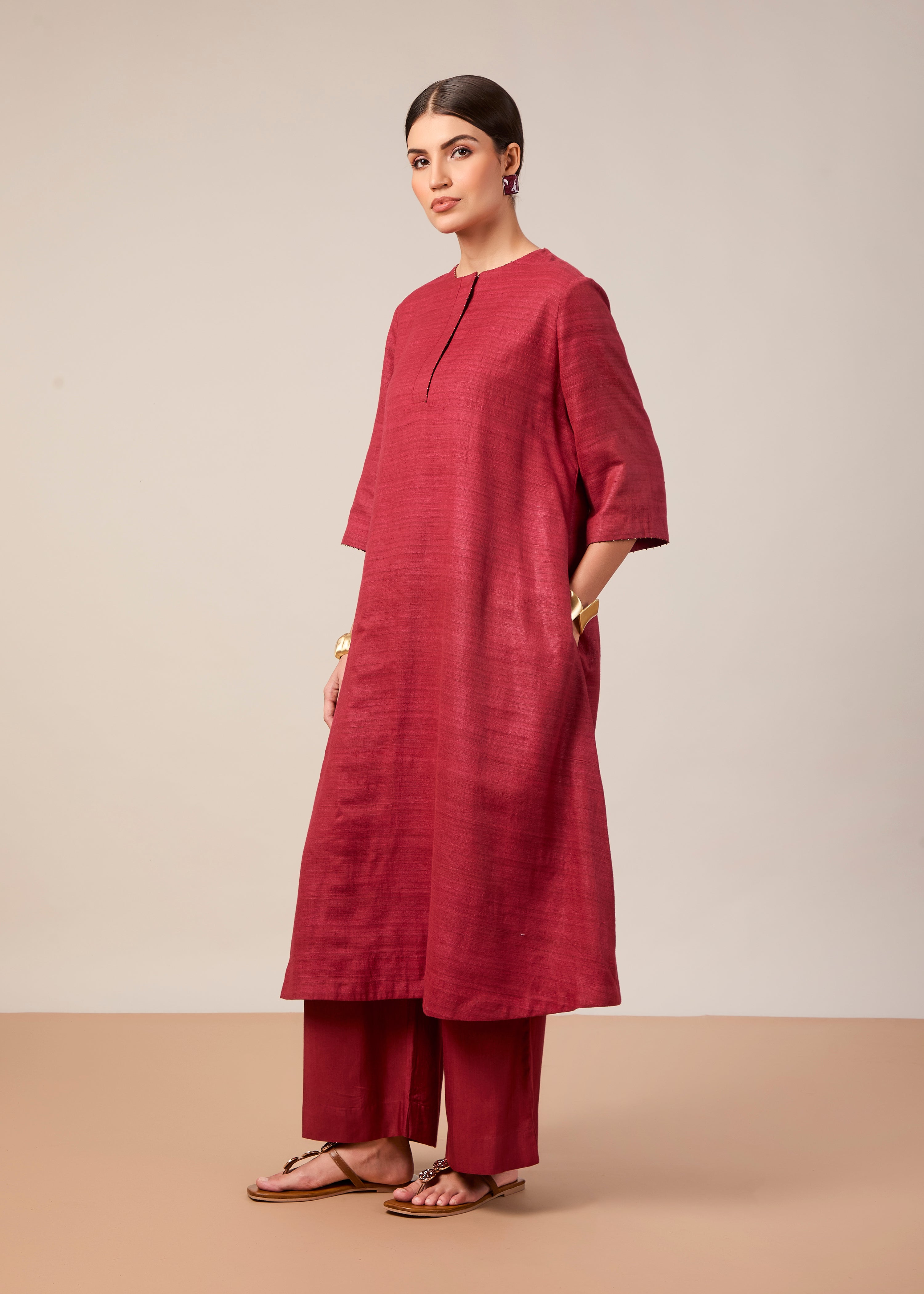 A bamboo tusser silk blend kurta with side pockets, flare cut, round neck with front open. Small beads embroidered around the neckline. Paired with straight cut silk pants.