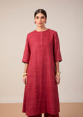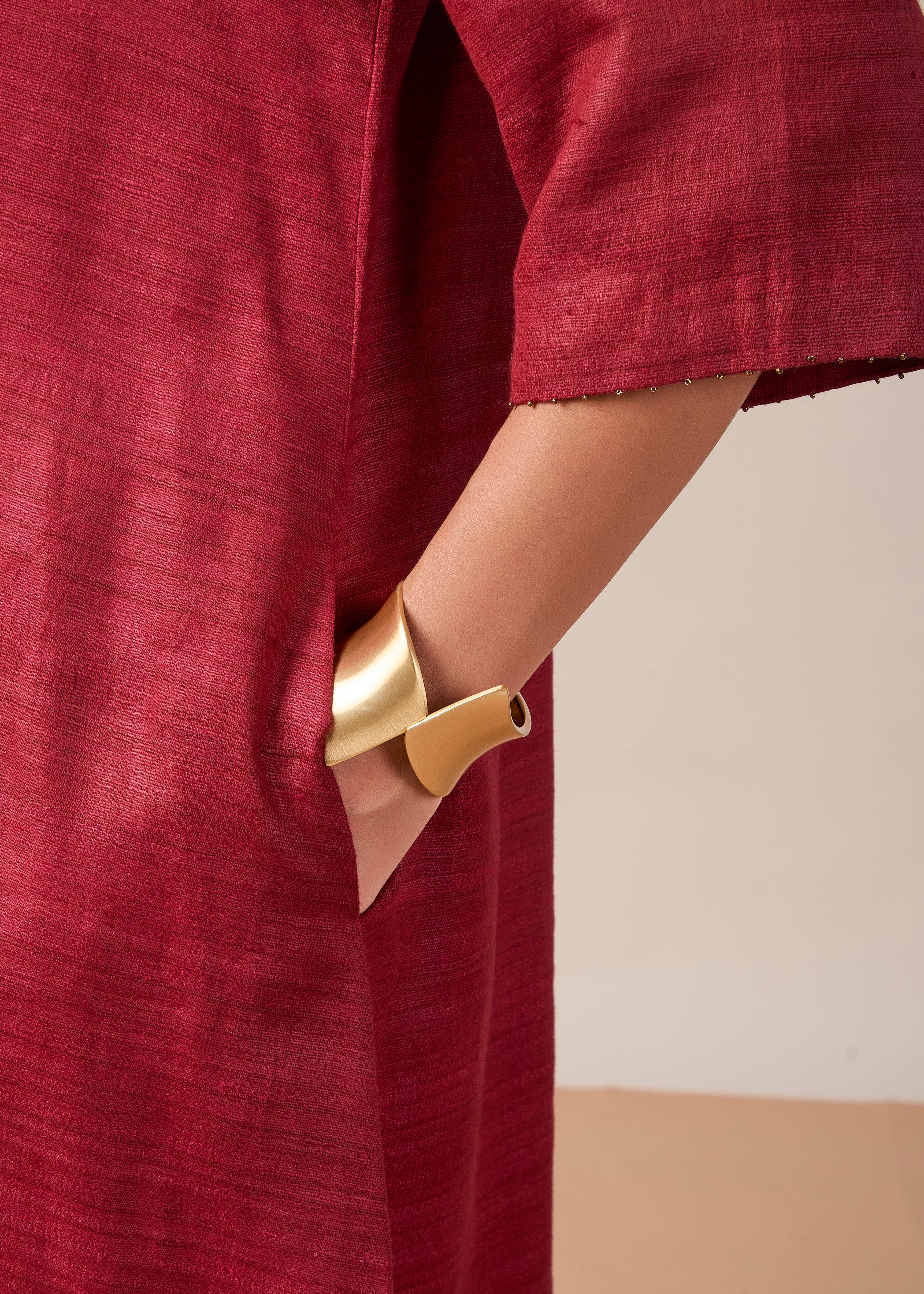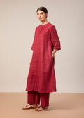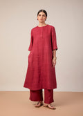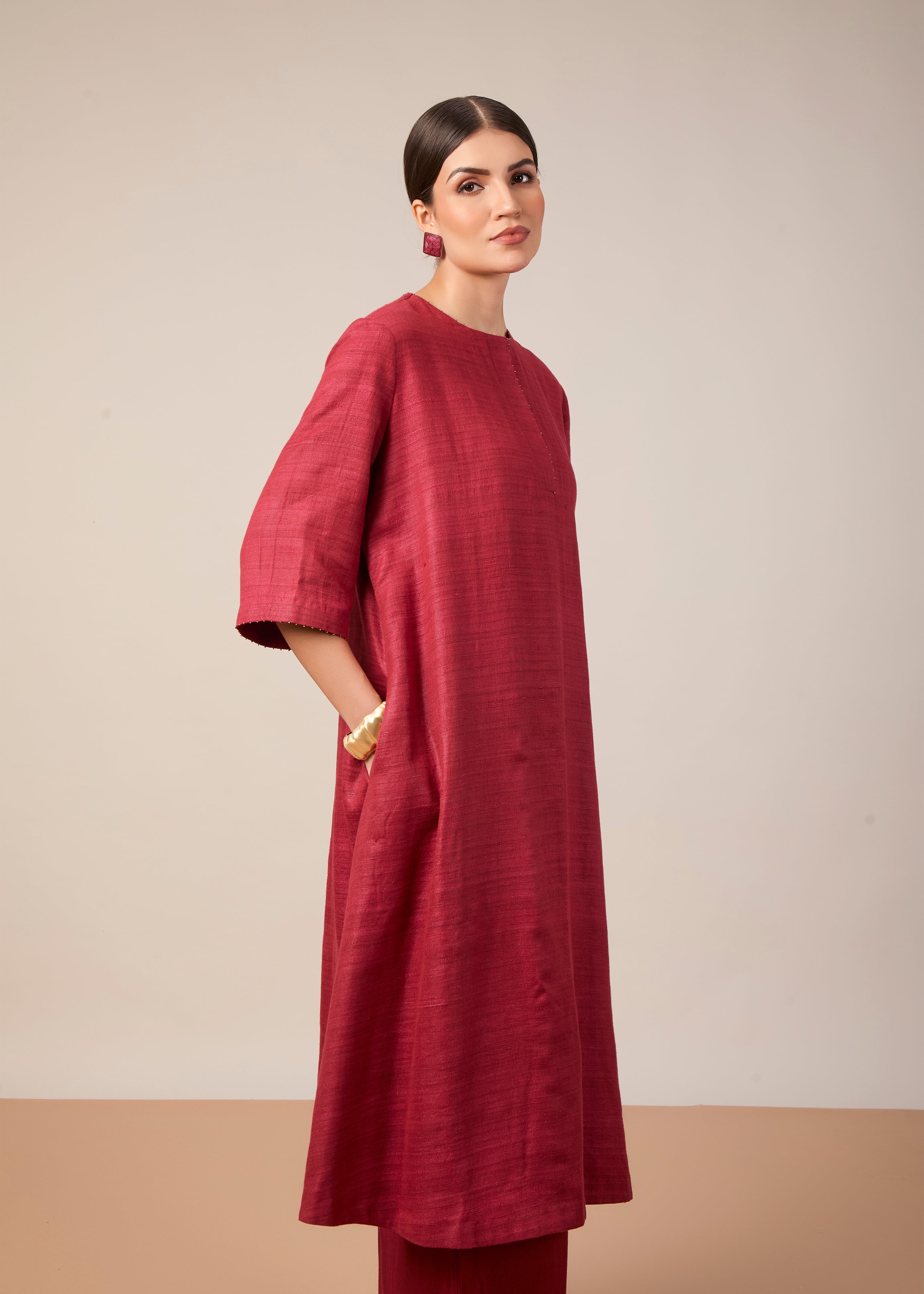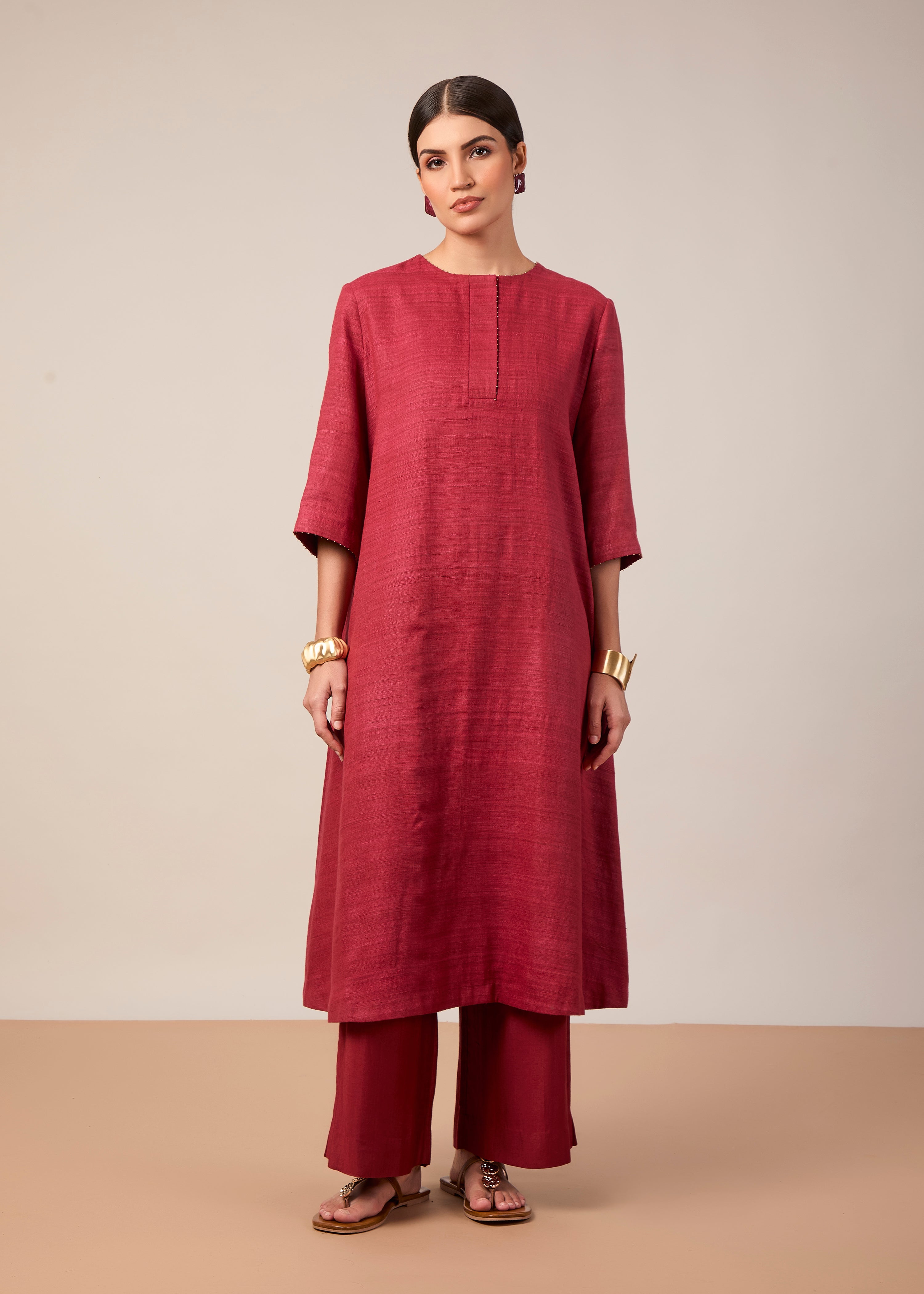 A bamboo tusser silk blend kurta with side pockets, flare cut, round neck with front open. Small beads embroidered around the neckline. Paired with straight cut silk pants.